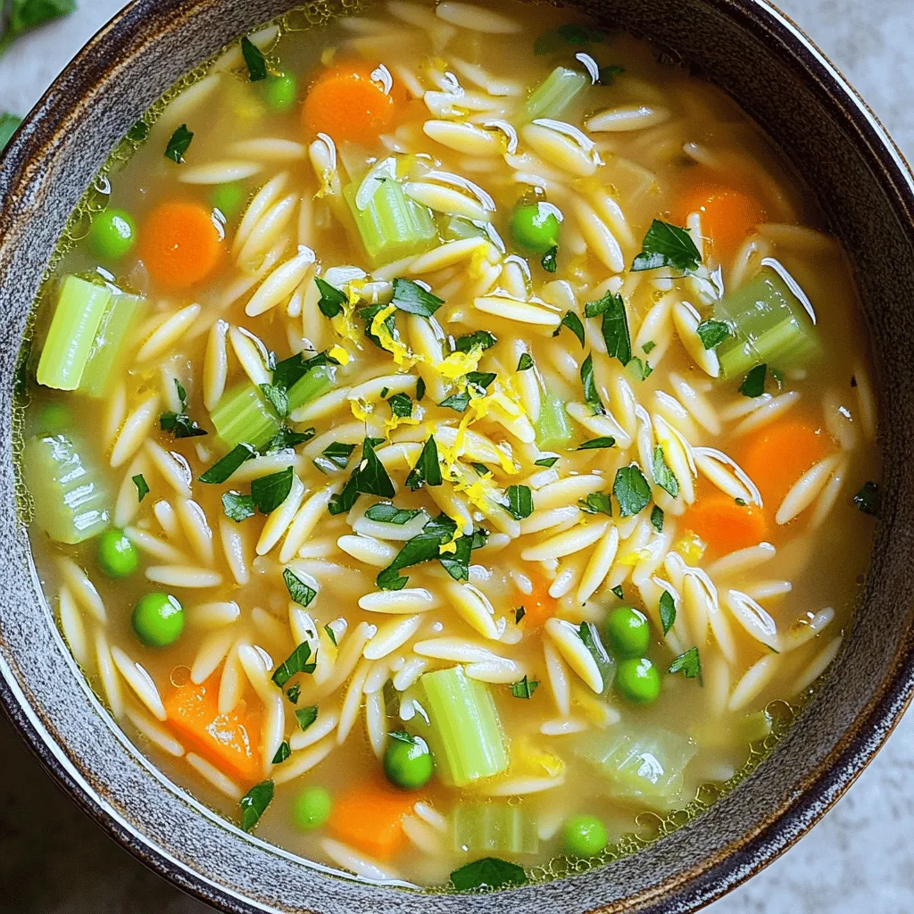![- 1 tablespoon olive oil - 1 medium onion, diced - 2 cloves garlic, minced - 2 medium carrots, diced - 2 celery stalks, diced - 6 cups low-sodium vegetable broth - 1 cup orzo pasta - 1 cup frozen peas - 1 lemon, zested and juiced - 1 teaspoon dried thyme - Salt and pepper to taste The ingredients for One-Pot Lemon Orzo Soup are simple yet impactful. Each item plays a role in building flavor. Olive oil gives a rich base. Onion and garlic add depth. Carrots and celery bring sweetness and crunch. The vegetable broth forms the soup's heart. It makes the dish warm and comforting. Orzo pasta cooks quickly and absorbs flavors. Frozen peas add a pop of color and nutrition. Lemon is the star here. Its zest and juice brighten the soup. Dried thyme adds an earthy note. Salt and pepper are key to enhancing all these tastes. - Calories per serving: About 200 - Key nutrients: Vitamin A, Vitamin C, Iron, and Fiber This soup is not just tasty; it's also healthy. Each serving packs vitamins and minerals. You gain nourishment with every spoonful. - Large pot - Cutting board - Knife To create this soup, you need basic tools. A large pot helps you cook everything in one place. A cutting board and knife are essential for chopping vegetables. Make sure you have these items ready. They help streamline your cooking process. Check out the Full Recipe for more details on how to prepare this meal! First, we must prepare the vegetables. Start by dicing 1 medium onion. Then, mince 2 cloves of garlic. Next, peel and dice 2 medium carrots. Finally, dice 2 celery stalks. This gives your soup a fresh base. Now, measure your ingredients. You will need 6 cups of low-sodium vegetable broth and 1 cup of orzo pasta. Also, grab 1 cup of frozen peas, 1 lemon for zest and juice, and 1 teaspoon of dried thyme. Don't forget salt and pepper for taste! Now, let’s cook! In a large pot, heat 1 tablespoon of olive oil over medium heat. Add the diced onion and sauté for about 3-4 minutes. You want them soft but not browned. Next, stir in the minced garlic, diced carrots, and celery. Cook these for about 5 minutes, until they are slightly tender. This step builds the flavor. Pour in the vegetable broth and bring it to a boil. Once boiling, add the orzo pasta. Cook according to the package instructions, about 8-10 minutes. Stir occasionally to keep the pasta from sticking. When the orzo is al dente, stir in the frozen peas, lemon zest, and lemon juice. Add the dried thyme at this stage. Cook for another 2-3 minutes until the peas heat through. Finally, season the soup with salt and pepper to your liking. Remove the pot from heat and let it sit for a few minutes. This allows the flavors to meld well. For the full recipe, be sure to check the recipe section! To make your One-Pot Lemon Orzo Soup even more tasty, add herbs and spices. Fresh herbs like basil or dill can brighten the soup. You can also try a pinch of red pepper flakes for a bit of heat. Adding lemon zest boosts the fresh lemon flavor. Just be careful to use only the yellow part of the peel. The white pith can taste bitter. If you love creamy soup, there are easy ways to add that texture. You can stir in heavy cream or half-and-half. For a lighter option, use plain Greek yogurt or coconut milk. These options give a nice creamy feel without overpowering the lemon taste. If you want to use different pasta types, adjust the cooking time. Smaller pasta shapes, like ditalini, cook faster. Larger shapes like shells may need extra time. Check the package for cooking instructions. If you live at high altitude, you might need to cook the soup a bit longer. Food takes more time to cook at higher altitudes, so keep an eye on it to avoid overcooking. For the Full Recipe, you can find detailed steps to create this wonderful dish. {{image_2}} You can add protein to your soup for extra nutrition. Chicken or shrimp work great. Simply cook them in the pot before adding the broth. For a vegetarian option, use beans like chickpeas or white beans. They add protein and fiber without meat. Feel free to change the vegetables based on what you have. Use seasonal veggies like zucchini, corn, or bell peppers. Leafy greens like spinach or kale can also be added near the end. They wilt nicely and boost the soup's nutrition. If you need gluten-free options, look for gluten-free orzo. This way, you can still enjoy the same texture. For a vegan version, swap vegetable broth for water and use a vegan-friendly seasoning. This makes the soup suitable for everyone. Explore the [Full Recipe] for more details on making this delicious dish! To store leftover soup, let it cool first. Transfer it to an airtight container. This keeps it fresh and flavorful. Store it in the fridge for up to three days. Make sure to label your container with the date. This helps you track how long it's been stored. You can freeze this soup for later. First, let it cool completely. Then, pour it into freezer-safe bags or containers. Remove as much air as possible before sealing. This helps prevent freezer burn. The soup will last in the freezer for about three months. When you're ready to enjoy it, thaw it overnight in the fridge. Reheat on the stove or in the microwave until hot. Pair this soup with warm, crusty bread for a full meal. A fresh side salad also works well. Try a simple green salad with a light vinaigrette. The bright flavors of the soup and salad complement each other nicely. For an added touch, serve with a sprinkle of fresh parsley on top. This adds color and freshness to your meal. For the full recipe, check out the detailed steps above. One-pot lemon orzo soup lasts about three to four days in the fridge. Keep it in an airtight container to maintain freshness. The flavors deepen over time, making it even tastier! Yes, you can make this soup ahead of time. Prepare it, let it cool, and store it in the fridge. Reheat before serving. This soup is perfect for meal prep. Absolutely! You can use any small pasta shapes yo