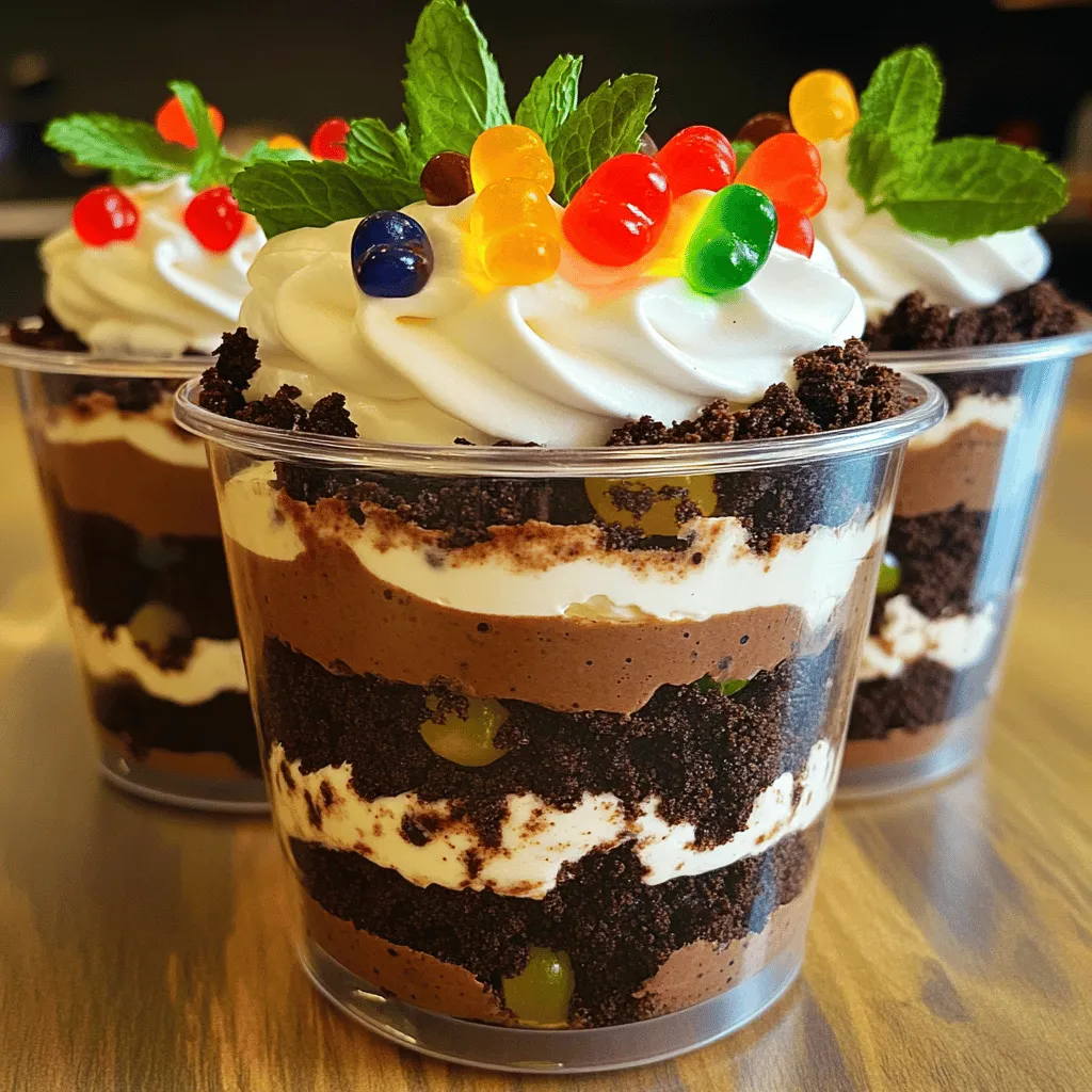 – Tips for achieving a visually appealing presentation: Finish with a layer of cookie crumbs on top. This looks nice and gives a dirt-like effect. For extra flair, add gummy worms sticking out and some fresh mint leaves for color. Serve in clear cups if you want to show off those beautiful layers.