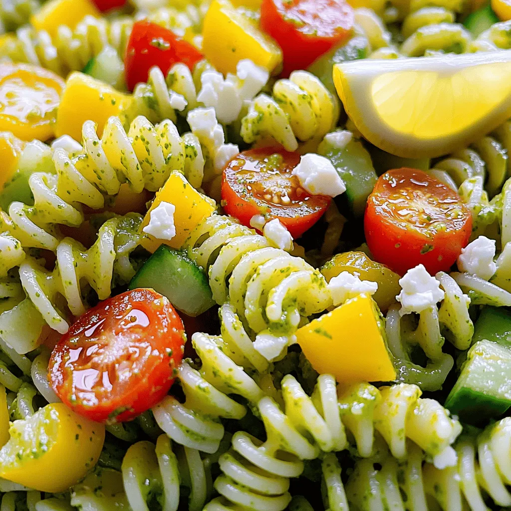 To make a great pesto pasta salad, you need good ingredients. Here’s what I recommend: - Types of Pasta Recommended: I love using fusilli pasta. Its spiral shape holds the pesto well. You can also use rotini or penne if you like. Just pick a pasta that cooks al dente. - Fresh vs. Store-Bought Pesto Options: Fresh pesto tastes the best. You can make it with basil, pine nuts, and Parmesan cheese. It’s simple! Just blend those together and add olive oil. If you’re short on time, store-bought pesto works too. Just look for a brand with natural ingredients. You can find the full recipe for this tasty salad below. This will help you gather all the ingredients you need. To cook the pasta, I use a large pot. Start by filling it with water. Add a good amount of salt to the water. This helps flavor the pasta. Bring the water to a boil. Once boiling, add 12 oz of fusilli pasta. Cook it according to the package instructions. Usually, this takes about 8-10 minutes. You want the pasta to be al dente, which means it's firm but not hard. After cooking, drain the pasta in a colander. Rinse it under cold water to stop the cooking process. This step cools the pasta and helps keep it from sticking together. For the pesto, you need a food processor. This tool makes blending easy. Start by adding 1 cup of fresh basil leaves. Then, add 1/4 cup of pine nuts and 1/2 cup of grated Parmesan cheese. Add a pinch of salt to enhance the flavor. Pulse the mixture until it's finely chopped. While the processor runs, slowly pour in 1/2 cup of olive oil. This makes the pesto creamy. Taste the pesto and adjust the seasoning. You can add more salt or cheese if you like. In a large mixing bowl, combine the cooled pasta with other ingredients. Add 1 cup of halved cherry tomatoes, 1/2 cup of diced yellow bell pepper, and 1/2 cup of diced cucumber. Then, add 3/4 cup of crumbled feta cheese. Now, it's time to mix! Add the pesto to the bowl. Use a large spoon to gently toss everything together. This ensures each piece of pasta and vegetable gets coated in the tasty pesto. Finally, squeeze the juice of 1 lemon over the salad. This brightens the flavors. Mix again to blend everything well. Let the salad chill in the fridge for at least 30 minutes. This helps all the flavors meld together. Enjoy your delicious Pesto Pasta Salad! For the complete recipe, check the Full Recipe. How to Toast Pine Nuts Toasting pine nuts adds depth to their flavor. Start by placing them in a dry pan over medium heat. Stir them frequently for about 3 to 5 minutes. They should turn golden brown and smell nutty. Don’t walk away; they can burn quickly! Once toasted, let them cool before adding them to your salad. Alternatives for Parmesan and Feta If you want to switch things up, try different cheeses. For Parmesan, use Pecorino Romano for a stronger taste. If you need a dairy-free option, nutritional yeast gives a cheesy flavor. For feta, goat cheese works well for creaminess. You can also use ricotta for a lighter touch! Ideal Pairings for Pesto Pasta Salad Pesto pasta salad pairs well with grilled chicken or shrimp. You can also serve it with crusty bread for a complete meal. A light white wine, like Sauvignon Blanc, makes a refreshing drink alongside it. Garnishes for a Stunning Presentation To make your salad look fancy, add a sprinkle of fresh basil on top. Cherry tomatoes can add a pop of color. You can also drizzle a bit of olive oil before serving. For a crunchy touch, add extra toasted pine nuts on the top. For the full recipe, check out the Pesto Pasta Salad Delight 🥗! {{image_2}} Pesto is not just one flavor. You can use many different herbs. The classic is basil pesto. It has a fresh, herby taste. You blend basil leaves, garlic, pine nuts, cheese, and olive oil. This mix gives a bright green sauce. Spinach pesto is another great choice. It uses spinach instead of basil. Spinach adds a mild flavor, making it kid-friendly. You can mix spinach with nuts and cheese. This way, you still get that rich taste. If you follow a vegan diet, you have options too. You can make vegan pesto by swapping cheese for nutritional yeast. This gives a nutty flavor without dairy. Just blend your favorite greens, nuts, garlic, and olive oil. You can make pesto pasta salad even better with extra ingredients. Adding proteins is a great way to do this. Chicken, shrimp, or tofu can make the salad more filling. Grilled chicken adds a nice smoky taste. Shrimp brings a sweet flavor, while tofu is great for plant-based diets. Seasonal vegetables also enhance your salad. Try adding cherry tomatoes, zucchini, or bell peppers. These veggies bring color and crunch. You can use whatever is fresh and in season. This keeps the salad vibrant and tasty. Feel free to explore different flavors. Your pesto pasta salad can be unique each time. Check out the Full Recipe for more ideas! To keep your pesto pasta salad fresh, store it in the fridge. Use an airtight container to prevent any odors from other foods. This helps maintain its bright color and flavor. You can enjoy it cold or at room temperature. I recommend eating it within three days for the best taste. If you want to save some for later, you can freeze it. However, the texture may change once thawed. To freeze, place the salad in a freezer-safe bag. Remove as much air as possible before sealing. You can freeze it for up to two months. When ready to eat, thaw it in the fridge overnight. Pesto pasta salad lasts about three to five days in the fridge. Always check for freshness before eating. If it sits too long, it may spoil. Watch for these signs of spoilage: - Off smell or sour odor - Change in color or texture - Mold spots or slimy pasta If you see any of these signs, discard the salad immediately. Enjoy your pesto pasta salad safely! For the full recipe, check out the Pesto Pasta Salad Delight. To make homemade pesto, you need simple ingredients. Gather fresh basil, pine nuts, Parmesan cheese, and olive oil. You can 