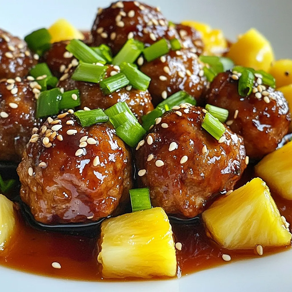 For tasty pineapple teriyaki meatballs, you need fresh and simple ingredients. Here’s what you'll use: - 1 lb ground chicken or turkey - 1 cup breadcrumbs - 1/4 cup green onions, finely chopped - 1/2 cup fresh pineapple, finely diced - 2 cloves garlic, minced - 1 egg, beaten - 1 tablespoon soy sauce - 1 tablespoon ginger, grated - 1 teaspoon sesame oil - Salt and pepper to taste These ingredients create juicy meatballs with a burst of flavor. The fresh pineapple adds sweetness, while the garlic and ginger give a nice kick. Next, you’ll make a delicious teriyaki sauce. Gather these items: - 1/3 cup soy sauce - 1/3 cup pineapple juice - 2 tablespoons brown sugar - 1 teaspoon cornstarch mixed with 2 tablespoons water (for thickening) - 1 tablespoon sesame seeds (for garnish) - Additional chopped green onions (for garnish) This sauce enhances the meatballs and gives them a glossy finish. The mix of soy sauce and pineapple juice creates a sweet and salty balance. Garnishes can elevate your dish. Consider adding: - Sesame seeds - Chopped green onions You can serve the meatballs over rice or noodles. This adds bulk and makes your meal more filling. Enjoy the vibrant colors and flavors that come with these garnishes! {{ingredient_image_1}} Start with a large mixing bowl. Add 1 lb of ground chicken or turkey. Next, mix in 1 cup of breadcrumbs. Chop 1/4 cup of green onions and add them to the bowl. Finely dice 1/2 cup of fresh pineapple, then toss it in. Mince 2 cloves of garlic and add them too. Beat 1 egg and pour it in the mixture. Finally, stir in 1 tablespoon of soy sauce, 1 tablespoon of grated ginger, and 1 teaspoon of sesame oil. Don’t forget to season with salt and pepper. Mix everything until well blended and sticky. Now, preheat your oven to 400Β°F (200Β°C). Line a baking sheet with parchment paper. Shape the mixture into small meatballs, about 1 inch in size. Place each meatball on the prepared baking sheet, leaving space between them. Bake the meatballs for 15 to 20 minutes. They should turn golden brown and be fully cooked. While the meatballs bake, it’s time to make the teriyaki sauce. Grab a small saucepan and combine 1/3 cup of soy sauce with 1/3 cup of pineapple juice. Add 2 tablespoons of brown sugar and bring this mix to a simmer over medium heat. Once it simmers, stir in a mix of 1 teaspoon of cornstarch and 2 tablespoons of water. Cook for an additional 1 to 2 minutes until the sauce thickens. Remove it from heat when done. Once the meatballs are out of the oven, toss them in the teriyaki sauce until they are fully coated. To shape meatballs, start with clean hands. Use a small scoop or your hands to grab a bit of the meat mixture. Roll it gently into a ball about 1 inch wide. Keep the size even for cooking. This helps them cook evenly. If the mixture feels sticky, wet your hands with water. This will stop the meat from sticking to your hands. Baking meatballs gives a nice, even cook. Preheat your oven to 400Β°F (200Β°C). Lay them out on parchment paper to avoid sticking. Bake for 15-20 minutes. They will turn golden brown and stay juicy. Frying can give a crisp outside but may use more oil. If you choose to fry, cook them in a hot pan and turn them often. Both methods work well, but baking is simpler. To keep meatballs juicy, add moisture to the mix. Fresh pineapple is great for this! The egg helps bind and adds moisture, too. Don’t overmix the meat; this can make them tough. Use ground chicken or turkey, as they are leaner meats. Cook them just until done. Overcooking can dry them out. Tossing them in teriyaki sauce after baking also adds more flavor and moisture. Pro Tips Use Fresh Ingredients: For the best flavor, use fresh pineapple and high-quality ground chicken or turkey. Fresh ingredients enhance the overall taste of the meatballs. Mix Gently: When combining the meatball ingredients, mix gently to avoid overworking the meat, which can make the meatballs tough. Adjust the Sauce: If you prefer a sweeter sauce, add a little more brown sugar. For a spicier kick, consider adding a dash of sriracha or crushed red pepper flakes to the teriyaki sauce. Perfect Meatball Size: Aim for uniform meatball sizes to ensure even cooking. Using a cookie scoop can help achieve consistent portions. {{image_2}} You can swap ground chicken or turkey with other meats. Ground beef adds a rich flavor. Ground pork brings a savory touch. You can also use ground lamb for a unique twist. If you prefer poultry, try ground duck. Each option changes the flavor but keeps it tasty. For a vegetarian version, use plant-based meat alternatives. Look for brands that mimic ground meat. You can also use finely chopped mushrooms and lentils as a base. This mix adds texture and flavor. For a vegan option, replace the egg with flaxseed or chia seeds. This keeps your meatballs binding well. You can enhance the teriyaki sauce with different flavors. Add chili flakes for some heat. A splash of sriracha brings a spicy kick. For a sweeter sauce, mix in honey or maple syrup. You can also use coconut aminos for a soy-free option. Each variation makes the dish uniquely yours. To store leftover meatballs, first let them cool. Place them in an airtight container. You can keep them in the fridge for up to three days. Make sure to cover them well to keep them fresh. This helps maintain their flavor and texture. When you want to eat the leftovers, you can heat them in a few ways. The best way is to use the oven. Preheat your oven to 350Β°F (175Β°C). Place the meatballs on a baking sheet and cover them with foil. Heat for about 10-15 minutes. You can also microwave them. Place them on a microwave-safe plate and cover them. Heat for about 1-2 minutes, checking often. If you want to freeze meatballs, let them cool completely first. Place them in a freezer-safe bag or container. They can last for up to three months in the freezer. For the sauce, let it cool, then pour it into a separate container. You can
