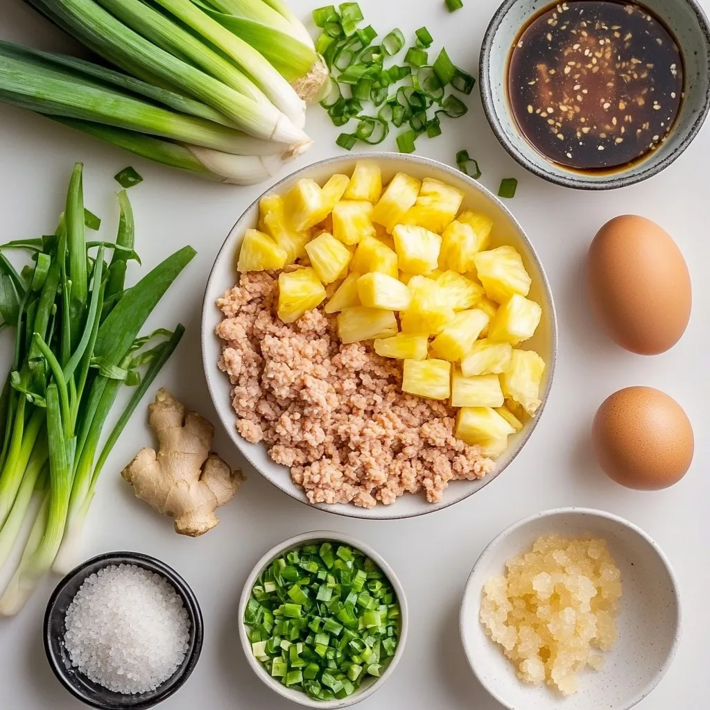 • In a large mixing bowl, combine the ground chicken (or turkey), breadcrumbs, chopped green onions, diced pineapple, minced garlic, beaten egg, 1 tablespoon soy sauce, ginger, sesame oil, salt, and pepper. Mix until well blended.