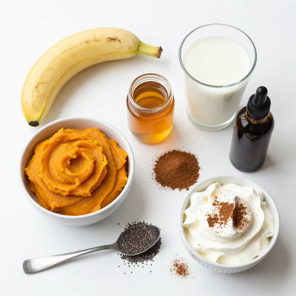 The base of this smoothie is pumpkin puree. It gives a rich, creamy feel. You need a frozen banana for natural sweetness and smoothness. Almond milk is my choice for a nutty taste, but any milk works. Maple syrup adds a touch of sweetness. Vanilla extract brings a warm flavor, while pumpkin pie spice adds that classic autumn taste. Chia seeds are optional but add nice texture and nutrients.