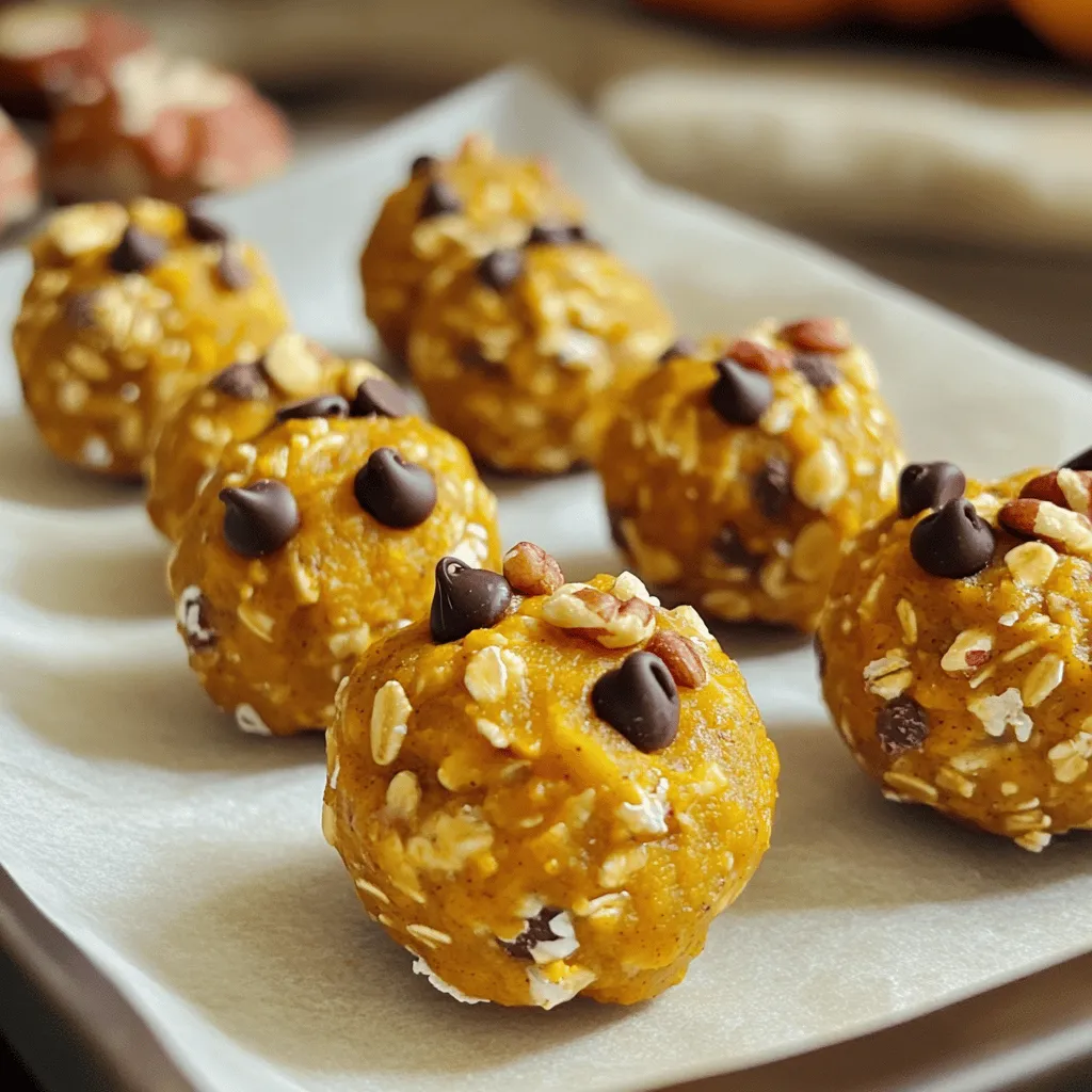 ![To make your Pumpkin Spice Energy Bites, gather these ingredients: - 1 cup rolled oats - 1/2 cup canned pumpkin puree - 1/4 cup nut butter (peanut or almond) - 1/4 cup honey or maple syrup - 1 teaspoon vanilla extract - 1 teaspoon pumpkin spice mix - 1/4 teaspoon salt - 1/4 cup mini chocolate chips (optional) - 1/4 cup chopped nuts or seeds (e.g., walnuts or sunflower seeds) These ingredients work together to create a tasty and filling snack. Each ingredient in these bites brings something good for your body. - Rolled oats provide fiber. Fiber keeps you full and helps with digestion. - Canned pumpkin puree is rich in vitamins A and C. These vitamins support your immune system. - Nut butter adds healthy fats and protein. Protein helps build and repair your muscles. - Honey or maple syrup adds natural sweetness without refined sugar. - Pumpkin spice mix has cinnamon, ginger, and nutmeg. These spices may improve digestion. - Chocolate chips and nuts add flavor and healthy fats. If you have allergies, you can still enjoy these bites. Here are some swaps: - Nut butter: Use sunflower seed butter for a nut-free option. - Honey: Maple syrup is a great vegan alternative. - Oats: Ensure they are gluten-free if you need to avoid gluten. - Chocolate chips: Look for dairy-free chips if you want a vegan choice. These swaps help you make tasty energy bites that fit your diet. Making Pumpkin Spice Energy Bites is simple and fun. First, gather all your ingredients. You will need rolled oats, pumpkin puree, nut butter, honey or maple syrup, vanilla extract, pumpkin spice mix, salt, and optional items like chocolate chips and nuts. In a large mixing bowl, combine the rolled oats, pumpkin puree, nut butter, honey, and vanilla extract. Stir until everything is well mixed. Next, add the pumpkin spice and salt. Mix again until all the ingredients blend completely. If you want extra texture, fold in the mini chocolate chips and chopped nuts. To get the best texture, keep the mixture slightly sticky. If it is too dry, add a bit more nut butter or pumpkin puree. If it feels too wet, sprinkle in some extra oats. When forming the bites, use your hands or a small cookie scoop. Shape them into small balls, about one inch in diameter. This size helps them hold together well and makes them easy to eat. Refrigerating the energy bites is key. Once you shape them, place them on a parchment-lined baking sheet. Chill them in the fridge for at least 30 minutes. This time lets them firm up nicely. If you skip this step, the bites may fall apart when you pick them up. After chilling, store the bites in an airtight container in the fridge. They stay fresh for up to a week. For more details, check the Full Recipe. To keep your Pumpkin Spice Energy Bites fresh, store them in an airtight container. This helps prevent moisture and keeps them tasty. If you plan to eat them within a week, keep them in the fridge. For longer storage, you can freeze them. Place the bites in a single layer on a baking sheet. Once frozen, transfer them to a freezer bag. This method allows you to grab one when you need a quick snack. You can easily change the flavor of your energy bites. Try adding different spices like cinnamon or nutmeg for extra warmth. If you enjoy a bit of crunch, toss in some chopped apples or dried cranberries. You can also swap the nut butter for sun butter or tahini if you want something different. Consider adding toppings too! Rolling the bites in shredded coconut or crushed nuts can add fun textures. Sometimes, your mixture might be too dry. If this happens, add a bit more nut butter or pumpkin puree. Mix well until you reach the right consistency. If your mixture is too wet, add more oats a tablespoon at a time. This will help bind everything together. Remember, you want a sticky but manageable consistency to form perfect bites. {{image_2}} You can easily change the flavor of your energy bites. Adding cocoa powder gives a rich taste. Dried fruits like cranberries or raisins add natural sweetness. You can even mix in shredded coconut for a tropical twist. Get creative with spices, too! A pinch of cinnamon or nutmeg can elevate the flavor profile. Seasonal ingredients can make these bites festive. For Halloween, try adding mini candy corn or festive sprinkles. During Christmas, toss in crushed peppermint or gingerbread spices. For spring, consider using citrus zest for a bright, fresh taste. Each holiday can inspire a new version of these bites. If you want a protein boost, add protein powder to the mix. You can also use Greek yogurt instead of nut butter for creaminess. If you need nut-free options, use sun butter or pumpkin seed butter. These swaps ensure everyone can enjoy these tasty bites without worry. For vegan options, swap honey for maple syrup and use a plant-based protein source. For the complete recipe, check out the [Full Recipe]. To keep your Pumpkin Spice Energy Bites fresh, store them in an airtight container. This helps keep moisture out and maintains flavor. Place the container in the refrigerator. They will stay good for up to one week. You can also separate layers with parchment paper to prevent sticking. If you want to save some bites for later, freezing is a great option. First, line a baking sheet with parchment paper. Place the energy bites on the sheet in a single layer. Freeze them for about two hours until firm. After that, transfer them to a freezer bag. They can last in the freezer for up to three months. When you’re ready to eat, let them thaw in the fridge overnight. Check your energy bites before eating them. If you see mold or an off smell, it's best to toss them. A change in texture can also be a bad sign. If they feel very hard or dry, they may not taste good. Always trust your senses; if something seems off, don’t eat it. Pumpkin Spice Energy Bites last up to one week in the fridge. Store them in an airtight container. This keeps them fresh and tasty. After a week, they may lose flavor a