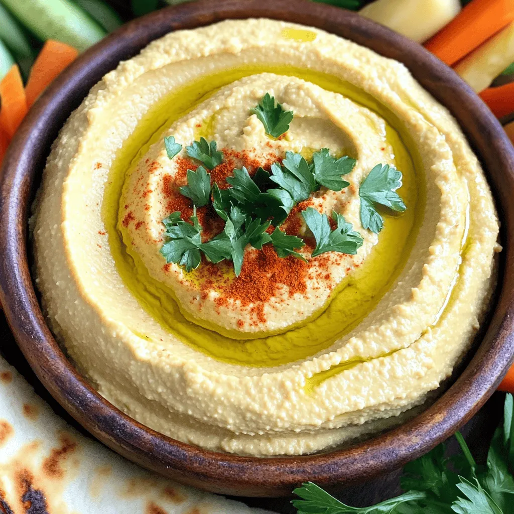 To make roasted garlic hummus, you will need: - 1 cup canned chickpeas, drained and rinsed - 1/4 cup tahini - 3-4 cloves of garlic, roasted - 2 tablespoons lemon juice - 2 tablespoons olive oil (plus extra for drizzling) - 1 teaspoon ground cumin - Salt to taste - Water (as needed for consistency) - Fresh parsley, chopped (for garnish) - Paprika (for garnish) - Chickpeas: High in protein and fiber, they help with digestion. - Tahini: Made from sesame seeds, it is rich in healthy fats and calcium. - Garlic: Good for heart health and boosts the immune system. - Lemon Juice: Provides vitamin C and adds a zesty flavor. - Olive Oil: Contains healthy fats and antioxidants. You can swap some ingredients if needed: - Chickpeas: Use cooked white beans for a different flavor. - Tahini: Almond or sunflower seed butter works well too. - Garlic: Use garlic powder if you do not have fresh garlic. - Lemon Juice: Lime juice can be a good alternative. - Olive Oil: Any neutral oil can replace olive oil if necessary. Creating this roasted garlic hummus is simple and fun. For the full recipe, check out the details above. Enjoy making this tasty treat! To make roasted garlic hummus, follow these simple steps. First, preheat your oven to 400°F (200°C). Wrap the garlic cloves in foil. Roast them for 20-25 minutes until soft and sweet. Let the garlic cool a bit before using. Next, drain and rinse the chickpeas. In a food processor, add the chickpeas, tahini, roasted garlic, lemon juice, olive oil, ground cumin, and a pinch of salt. Blend these ingredients until smooth. If the mixture is too thick, add water one tablespoon at a time. Blend again until you reach the right consistency. Taste it, and adjust the salt if needed. Once smooth, spoon the hummus into a serving dish. Make a small well in the center. Drizzle some olive oil on top. Roasting garlic is easy and fun! Start by choosing fresh garlic bulbs. Peel off the outer layers, but keep the cloves intact. Cut the top off the bulb to expose the cloves slightly. Drizzle the exposed cloves with olive oil. Wrap the bulb tightly in foil to keep it moist. Place it in the oven and roast. You will know it's done when the cloves are soft and golden brown. Roasted garlic adds a rich flavor to your hummus. To get the perfect hummus texture, it’s all about balance. If your hummus is too thick, add a little water and blend again. The water should help it become creamy. For a more vibrant taste, you can add more lemon juice. Always taste your hummus before serving. If you want it smoother, blend a bit longer. Remember, you can customize it to your liking! Enjoy this tasty recipe for roasted garlic hummus. You can find the full recipe above. To keep your roasted garlic hummus fresh, store it in an airtight container. This helps prevent it from drying out. You can keep it in the fridge for up to a week. If you want to store it longer, freeze it. Just make sure to leave some space in the container for expansion as it freezes. Roasted garlic hummus is great with many foods. Try serving it with warm pita bread or fresh veggie sticks. You can also add it to a mezze platter with olives and stuffed grape leaves. For a fun twist, use it as a spread on sandwiches or wraps. To boost the flavor, add herbs and spices. Fresh herbs like parsley or cilantro can brighten it up. You can also mix in some cumin or smoked paprika for a deeper taste. If you like heat, consider adding cayenne pepper or a dash of chili powder. For more ideas, check out the Full Recipe. {{image_2}} You can make many types of hummus. For a spicy kick, add chili flakes or jalapeños. This gives the hummus a fun heat. If you want a sweet twist, try beetroot. It adds color and a rich taste. Just blend cooked beetroot into your hummus for a vibrant dish. Feel free to get creative! Add roasted red peppers for a smoky flavor. You can mix in sun-dried tomatoes for extra zest. A handful of olives can make it briny and bold. Herbs like basil or cilantro also add fresh taste. Each of these options adds a new layer of flavor. Hummus pairs well with many dips. Try serving it with tzatziki for a cool contrast. Baba ghanoush is another great choice. It adds a creamy, smoky flavor that goes well with hummus. You can also serve it with a spicy salsa for a fun dip platter. Mix and match your dips to make an exciting spread! For the full recipe, check out the Roasted Garlic Hummus section. To keep your roasted garlic hummus fresh, store it in an airtight container. Make sure the lid closes tightly. This helps to keep out air and moisture, which can spoil the hummus. Place the container in the fridge right after you finish serving. Always use a clean spoon to scoop out your hummus. This prevents germs from getting in. Homemade roasted garlic hummus lasts about 4 to 7 days in the fridge. If you want to keep it longer, freezing works great. Put the hummus in a freezer-safe container or bag. Leave some space at the top, as it will expand when frozen. It can last up to three months in the freezer. When you are ready to eat it, let it thaw in the fridge overnight. Check your hummus before using it. If you see mold on top, throw it away. Also, if it smells sour or off, do not eat it. A change in texture can be a sign too. If it seems very watery or has a strange color, it is best to discard it. Always trust your senses when it comes to food safety. To make roasted garlic hummus, follow these steps: 1. Roast the Garlic: Preheat your oven to 400°F. Wrap garlic cloves in foil and roast for 20-25 minutes. They should be soft and sweet. 2. Blend Ingredients: In a food processor, add 1 cup of drained chickpeas, 1/4 cup tahini, the roasted garlic, 2 tablespoons of lemon juice, 2 tablespoons of olive oil, 1 teaspoon of ground cumin, and salt. 3. Process to Smooth: Blend until smooth. If it is thick, add water slowly until it reaches the right consistency. 4. Serve: Spoon it into a dish, create a well in the center, and drizzle with olive oi
