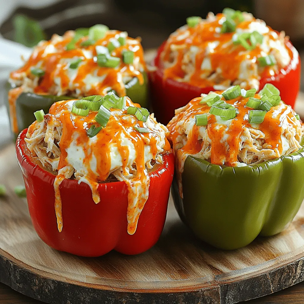 ![To make Buffalo Chicken Stuffed Peppers, gather these essential ingredients: - 4 large bell peppers (any color) - 2 cups cooked shredded chicken - 1/2 cup buffalo sauce (adjust to taste) - 1/2 cup cream cheese, softened - 1/2 cup shredded cheddar cheese - 1/4 cup green onions, sliced - 1/2 cup celery, finely chopped - Salt and pepper to taste - Olive oil for drizzling For optional add-ins, consider adding diced tomatoes or black beans. These can enhance flavor and add texture. When selecting bell peppers, look for ones that are firm and heavy. Avoid peppers with soft spots or wrinkles. Bright colors often mean they are fresh and full of flavor. Choose peppers that will hold the stuffing well and look vibrant on your plate. You can find the Full Recipe to create these delightful stuffed peppers. Enjoy your cooking! 1. Prepping the bell peppers and oven Start by preheating your oven to 375°F (190°C). While it heats, take four large bell peppers. Cut off the tops and scoop out the seeds and membranes. Place them cut side up in a baking dish. Drizzle a bit of olive oil over the peppers. Season them lightly with salt and pepper. 2. Mixing the buffalo chicken stuffing In a large mixing bowl, combine two cups of cooked shredded chicken with half a cup of buffalo sauce. Add half a cup of softened cream cheese, half a cup of shredded cheddar cheese, a quarter cup of sliced green onions, and half a cup of finely chopped celery. Mix everything together until well combined. You can adjust the buffalo sauce to your taste for more or less heat. 3. Stuffing and baking the peppers Carefully stuff each bell pepper with the buffalo chicken mixture. Pack it down gently so they are full but not overflowing. Cover the baking dish with aluminum foil and bake in the preheated oven for 25 minutes. After that, remove the foil and bake for an additional 10 to 15 minutes. You want the peppers to be tender and the cheese to be bubbly and slightly golden. - Breakdown of cooking time: The prep time takes about 15 minutes. The total baking time is 35 to 40 minutes. So, the full dish is ready in about 50 minutes. - Signs to look for when the dish is ready: Check if the peppers are tender. The cheese on top should be melted and slightly golden. If you see that, your dish is ready to serve! To keep your peppers tender, bake them just right. Start by preheating your oven to 375°F. This heat cooks the peppers well without overdoing it. Cover them with foil for the first part of baking. This helps steam them, making them soft. After 25 minutes, take off the foil. This allows the tops to brown, giving a nice texture. Adjusting spice levels is easy. If you like it mild, use less buffalo sauce. For a spicy kick, add more sauce. Taste the stuffing as you mix. This way, you can decide how spicy you want it. Buffalo Chicken Stuffed Peppers taste great with sides. Pair them with a fresh salad or crispy potato wedges. These sides balance the spice of the peppers. For presentation, serve the peppers on a colorful platter. Add some sliced green onions on top for color. A drizzle of extra buffalo sauce makes it look even better. You want your dish to be as pleasing to the eyes as it is to the taste buds. {{image_2}} If you need gluten-free or dairy-free options, you can easily adapt this recipe. Instead of cream cheese, use dairy-free cream cheese. For the buffalo sauce, check that it is gluten-free. There are many brands that fit this need. For a low-carb version, swap out bell peppers for zucchini or eggplant. These veggies hold up well when stuffed. They add a nice twist while keeping carbs low. To boost flavor, try adding different cheeses. Jalapeño cheddar or pepper jack can add a spicy kick. You can also sprinkle some crumbled blue cheese over the top before baking for a classic touch. Mixing in extra veggies is a smart choice too. Spinach, mushrooms, or corn can add color and nutrition to your dish. Just chop them finely and mix them in with the chicken. Every bite will be even tastier and healthier! For more details and the full recipe, check out the [Full Recipe]. To keep your buffalo chicken stuffed peppers fresh, use airtight containers. Glass or plastic containers work well. Make sure to cool the peppers to room temperature before sealing. This helps prevent moisture build-up. In the fridge, the stuffed peppers stay fresh for about 3 to 4 days. If you want to keep them longer, freeze them. In the freezer, they last up to 3 months. Just remember to label your containers with the date. When it's time to enjoy your leftovers, reheating is key. The best way is to use the oven. Preheat the oven to 350°F (175°C). Place the peppers in an oven-safe dish. Cover with foil to keep them moist. Heat for about 20 minutes. You can also use a microwave. Place the stuffed pepper on a microwave-safe plate. Heat for 2 to 3 minutes, checking regularly. To ensure the cheese is melty, add a splash of water to the plate before heating. This trick helps keep the cheese delicious and gooey. Can I use ground chicken or turkey instead of shredded chicken? Yes, you can use ground chicken or turkey. Cook it fully before mixing with other ingredients. Ground meats add a different texture but stay flavorful. Just be sure to season well. What can I use if I don't have buffalo sauce? If you lack buffalo sauce, try hot sauce mixed with melted butter. You can also use a spicy barbecue sauce for a different twist. Adjust the amount to fit your spice level. Can I make these in advance for meal prep? Absolutely! You can prepare the stuffed peppers a day ahead. Just store them in the fridge before baking. This way, they are ready to pop in the oven when you need them. Are there any vegetarian alternatives for this recipe? Yes, you can use cooked quinoa or black beans instead of chicken. Mix them with cream cheese and buffalo sauce for a tasty veggie option. Add chopped vegetables for extra flavor and nutrition. For more on this recipe, check the Full Re
