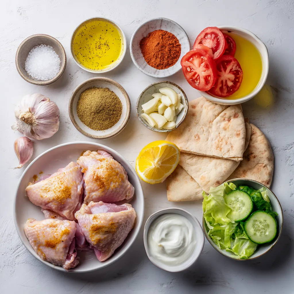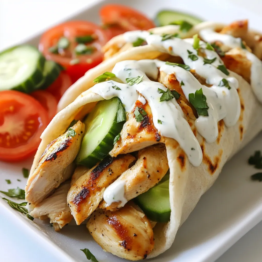 To assemble, warm the pita or flatbreads and spread a generous amount of garlic sauce over them. Place the sliced chicken on top, followed by sliced cucumbers, tomatoes, and lettuce.