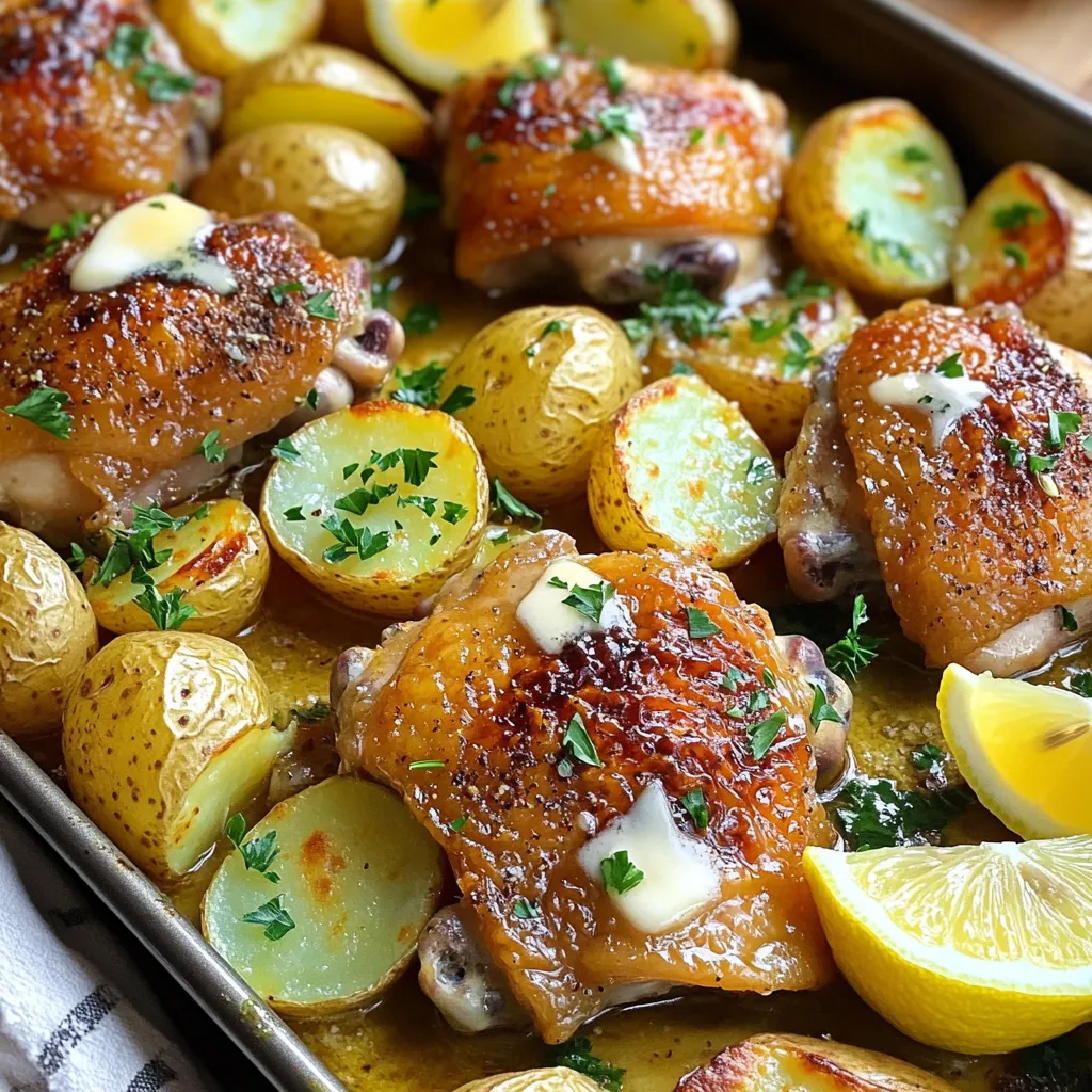Now, let’s assemble the dish. Place the halved baby potatoes on one side of the baking sheet. Drizzle half of your garlic butter mixture over the potatoes. Toss them well so they get coated. Next, take the chicken thighs and season them with salt and pepper on both sides. Place the chicken on the baking sheet next to the potatoes. Brush the remaining garlic butter over the chicken. Spread everything out in a single layer. This ensures even cooking. Now, pop the baking sheet into the oven.