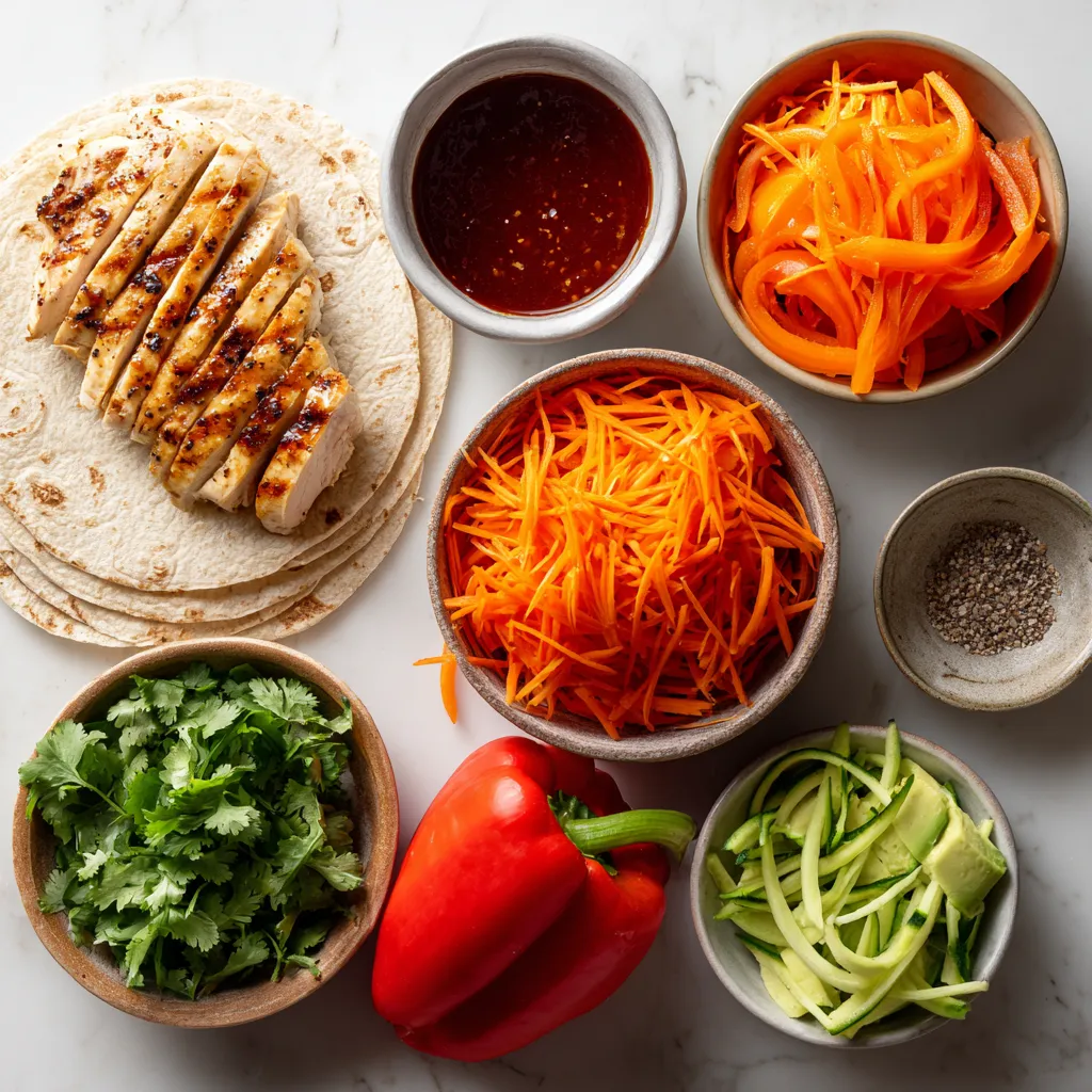 For these Sweet Chili Chicken Wraps, you’ll need some simple yet fresh ingredients. Start with the chicken breasts. They add protein and flavor. Next, grab a large red bell pepper. Its sweetness adds a nice crunch. You also need shredded carrots for color and texture. A cucumber adds a refreshing taste.
