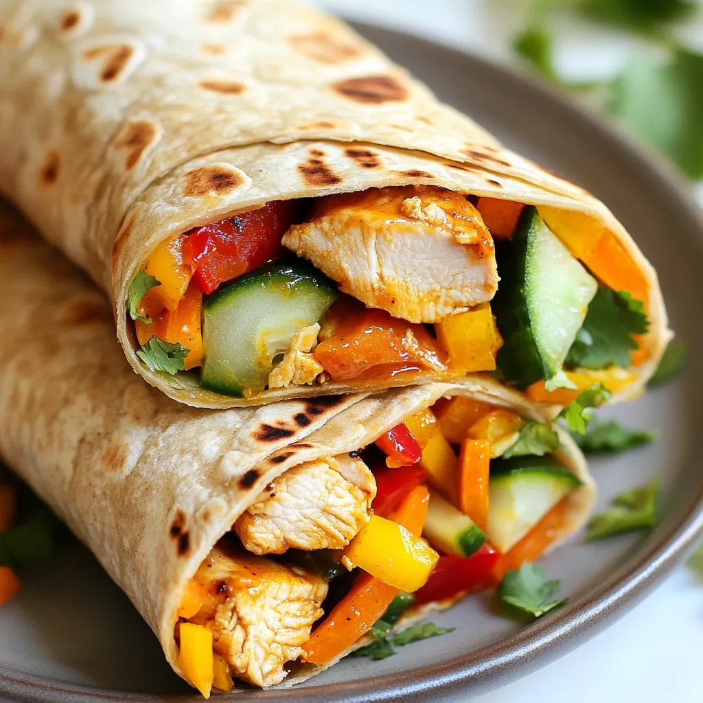 - 2 chicken breasts, grilled and sliced - 1 large red bell pepper, sliced - 1 cup shredded carrots - 1 cucumber, julienned - 4 large tortillas (whole wheat or regular) - ½ cup sweet chili sauce - ¼ cup fresh cilantro, chopped - 1 tablespoon sesame oil - Salt and pepper to taste - Optional: ½ cup avocado slices For these Sweet Chili Chicken Wraps, you'll need some simple yet fresh ingredients. Start with the chicken breasts. They add protein and flavor. Next, grab a large red bell pepper. Its sweetness adds a nice crunch. You also need shredded carrots for color and texture. A cucumber adds a refreshing taste. Tortillas serve as the wrap base. You can choose whole wheat or regular ones. Sweet chili sauce brings everything together with a sweet and spicy kick. Fresh cilantro adds a pop of flavor. Sesame oil helps sauté the veggies nicely. Don’t forget salt and pepper to make everything taste better. If you want a creamy touch, add avocado slices. They blend well with the sweet chili sauce. This mix of ingredients creates a tasty meal that is quick to make. {{ingredient_image_1}} Sautéing Red Bell Pepper and Carrots Start by heating sesame oil in a pan over medium heat. Once hot, add the sliced red bell pepper and shredded carrots. Stir them for about 3 to 4 minutes. You want them to be slightly soft but still crunchy. Seasoning Tips Season the veggies with salt and pepper to taste. This small step enhances their flavor. Once done, remove the pan from the heat and set the vegetables aside. Mixing with Sweet Chili Sauce Take your grilled chicken breasts and slice them into bite-sized pieces. In a large bowl, mix these slices with sweet chili sauce. Ensure that every piece is well coated. The sauce adds a nice sweet and spicy kick to the chicken. Layering Ingredients Grab a tortilla and lay it flat on a clean surface. Place a generous portion of the sweet chili chicken in the center. Add the sautéed vegetables, julienned cucumber, and fresh cilantro on top. If you’re using avocado slices, add them now for creaminess. Folding Technique To fold the wrap, start by bringing in the sides of the tortilla. Then, roll it up from the bottom tightly. Make sure all the fillings are secure inside. Repeat this with the rest of the tortillas until you have all your wraps ready. How to Toast Wraps for Extra Flavor For added warmth and a crispy texture, toast the wraps briefly. Heat a pan or a sandwich press over medium heat. Place each wrap in the pan and cook until golden brown on all sides. This step is optional but gives the wraps a great flavor boost. Grilling chicken gives it a great smoky taste. You can soak the chicken in a marinade for extra flavor. Bake the chicken if you prefer less mess. Baking keeps it juicy and gives nice browning. - Grilling: Use medium heat. Cook for about 6-7 minutes per side. Check that it reaches 165°F to be safe. - Baking: Preheat the oven to 375°F. Bake for 25-30 minutes. Use a meat thermometer to check doneness. You can spice up your wraps in many ways. Try adding some crushed red pepper for heat. A sprinkle of garlic powder or onion powder adds depth. Fresh herbs like basil or mint can make it taste fresh. - Extra Ingredients: - Chopped jalapeños for heat. - Sesame seeds for crunch. - A squeeze of lime juice for tang. To keep your wraps fresh, store them in an airtight container. Wrap them in plastic wrap for added protection. They will last about 2-3 days in the fridge. - Reheating: - Use a microwave for quick heating. - For crispiness, heat in a pan for a few minutes. - Avoid sogginess by reheating them uncovered. Pro Tips Grill for Flavor: Grilling the chicken not only adds a smoky flavor but also helps to keep it juicy. For an extra kick, marinate the chicken in sweet chili sauce before grilling. Fresh Veggies: Use fresh and crisp vegetables to enhance the texture and flavor of your wraps. You can also experiment with other veggies like shredded cabbage or radishes for added crunch. Wrap It Right: To prevent the filling from spilling out, make sure to fold the sides of the tortilla tightly before rolling it up. This helps keep all your delicious ingredients secure. Customize Your Sauce: If you like it spicy, add a few drops of sriracha or chili flakes to the sweet chili sauce. For a tangy twist, mix in some lime juice or zest. {{image_2}} You can easily swap chicken for tofu or shrimp. Tofu gives a nice texture and works well with sweet chili sauce. Press and cube the tofu, then fry it until golden. Toss it in the sauce just like the chicken. For shrimp, use peeled and deveined shrimp. Cook them in the pan until they turn pink. Both options add a tasty twist. If you want to skip chicken, load up on veggies! Use bell peppers, carrots, cucumbers, and even spinach. Grate zucchini or add roasted sweet potatoes for extra flavor. You can mix different colors of vegetables to make your wrap bright and fun. This way, you still get a healthy and yummy meal. Sweet chili sauce is great, but there are many sauces to try! Use teriyaki sauce for a sweeter flavor, or sriracha for a spicy kick. A peanut sauce can add richness and creaminess. Experiment with different sauces to find your favorite mix. Each sauce brings its own taste and makes the wraps unique. Healthy sides make your meal better. Here are some ideas: - Fresh Veggie Sticks: Carrots, cucumbers, and bell peppers add crunch. - Fruit Salad: Mix seasonal fruits for a sweet touch. - Quinoa Salad: A light salad adds protein and fiber. - Steamed Broccoli: This green veggie is colorful and nutritious. These sides balance the flavors of your sweet chili chicken wraps. They also add more nutrients to your meal. Dips can take your wraps to the next level. Here are some tasty options: - Extra Sweet Chili Sauce: For those who love more heat. - Soy Sauce: A savory dip that pairs well with chicken. - Peanut Sauce: Adds a rich, nutty flavor. - Yogurt Dip: A cool, creamy option that contrasts the spice. These dips add la
