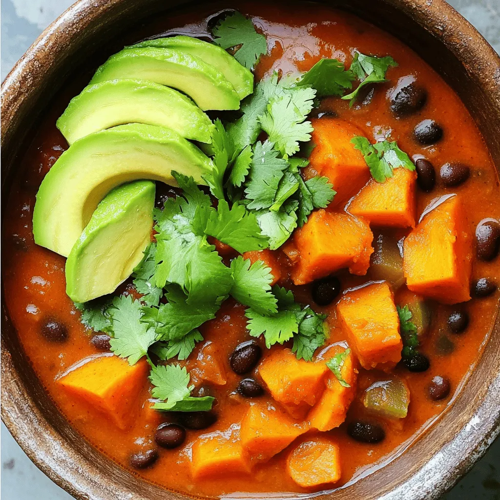 - 2 medium sweet potatoes, peeled and diced - 1 can (15 oz) black beans, rinsed and drained - 1 can (14 oz) diced tomatoes (with juices) - 1 medium onion, chopped - 2 cloves garlic, minced - 1 bell pepper (any color), chopped - 2 tablespoons olive oil - 2 tablespoons chili powder - 1 teaspoon cumin - 1 teaspoon smoked paprika - ½ teaspoon cayenne pepper (adjust to taste) - 2 cups vegetable broth - Salt and pepper to taste - Fresh cilantro for garnish - Avocado slices for serving (optional) I love using sweet potatoes in this chili. They add a touch of sweetness that balances the spices perfectly. Black beans make the dish hearty and filling. Diced tomatoes bring acidity to the mix, brightening up the flavors. Chop the onion and garlic finely. They will add depth to your chili. I like to use any color bell pepper for a pop of color. The olive oil helps cook the veggies and adds richness. For spices, chili powder and cumin are essential. They provide warmth and a bit of heat. Smoked paprika adds a nice smoky flavor. Adjust the cayenne pepper based on your spice level. If you want it mild, use less. Vegetable broth is the base for your chili. It adds moisture and flavor. Finally, finish with salt and pepper to taste. Fresh cilantro and avocado slices make the perfect garnish. They add freshness and creaminess. Enjoy this tasty combination in every bite! - Heating the Olive Oil Start by heating 2 tablespoons of olive oil in a large pot over medium heat. This step is vital. It helps to create a base for the flavors. - Sautéing Vegetables Add 1 chopped onion and 1 chopped bell pepper to the pot. Cook these for about 5 minutes, or until they soften. Stir occasionally to prevent sticking. After that, mix in 2 minced garlic cloves and cook for 1 to 2 more minutes. You want the garlic fragrant, but not burnt. - Adding Spices and Sweet Potatoes Next, toss in 2 diced sweet potatoes. Sprinkle in 2 tablespoons of chili powder, 1 teaspoon of cumin, 1 teaspoon of smoked paprika, and ½ teaspoon of cayenne pepper. Stir well to coat the sweet potatoes with all the spices. This step adds depth to the dish. - Incorporating Vegetable Broth and Simmering Pour in 2 cups of vegetable broth. Bring the mixture to a boil. Once boiling, reduce the heat and let it simmer. Cook for about 15 minutes or until the sweet potatoes are tender. Stir occasionally to keep everything mixed well. - Adding Black Beans and Diced Tomatoes After 15 minutes, add 1 can of rinsed black beans and 1 can of diced tomatoes (with their juices) to the pot. Stir everything together. Allow this to simmer for another 10 minutes. This lets the flavors meld together for a rich taste. - Adjusting Seasoning to Taste Taste your chili and season it with salt and pepper. If you like more heat, feel free to add extra cayenne pepper. Adjusting the seasoning is key to making it your own. - Serving Suggestions and Garnishing Serve the chili hot. Garnish each bowl with fresh cilantro and avocado slices if you wish. This adds a nice touch of freshness and creaminess. Enjoy your savory sweet potato black bean chili! Adjusting Spice Levels To make your chili just right, adjust the spices. I recommend starting with ½ teaspoon of cayenne pepper. Taste your chili as it cooks. If you want more heat, add a bit more cayenne. You can also try adding hot sauce for an extra kick. Ensuring Sweet Potatoes are Tender Sweet potatoes should be soft but not mushy. When you add them to the pot, cover it and check them after 15 minutes. If they are not tender, let them simmer for a few more minutes. This will help them cook through without losing their shape. Slow Cooker vs. Stovetop Method You can make this chili on the stovetop or in a slow cooker. For the stovetop, follow the recipe step-by-step. If using a slow cooker, sauté the onions and peppers first. Then add all ingredients to the slow cooker. Cook on low for 6-8 hours or high for 3-4 hours. Adding Additional Vegetables or Proteins Feel free to add more veggies like corn or zucchini. You can also stir in some cooked quinoa or lentils for extra protein. This keeps your chili hearty and filling. Best Accompaniments for Chili Chili pairs well with many sides. I love serving it with cornbread or a light salad. You can also top it with cheese or sour cream for creaminess. Pairing with Bread or Rice Serve your chili with crusty bread for dipping. Rice is another great option, soaking up all that flavor. You can use white rice, brown rice, or even quinoa. Each brings its own taste and texture. {{image_2}} Using Different Beans You don’t have to stick with black beans. You can use kidney beans, pinto beans, or chickpeas instead. Each type brings a different taste and texture. Try to mix and match to find your favorite. Swapping Sweet Potatoes for Other Vegetables If you want a twist, swap sweet potatoes for zucchini or butternut squash. These options will change the flavor and texture. Just chop them into small pieces and add them during cooking. Incorporating Fresh Herbs Fresh herbs can make a big difference. Try adding cilantro, parsley, or even basil. Chop them up and stir them in right before serving. This adds a burst of flavor. Adding Heat with Chili Peppers Want more spice? Add fresh chili peppers like jalapeños or serranos. Dice them up and add them when you sauté the onions. Adjust the amount to suit your taste. Vegan and Gluten-Free Options This chili is already vegan and gluten-free. All ingredients are plant-based and contain no gluten. You can enjoy this dish without any worries. Low-Carb Modifications If you’re watching carbs, skip the sweet potatoes. Instead, add more black beans or use cauliflower. This keeps the chili low in carbs while still being filling and tasty. To keep your sweet potato black bean chili fresh, store it in an airtight container. This helps prevent odors from mixing in your fridge. Let the chili cool before sealing it. In the fridge, your chili lasts about 3 to 5 days. Make su