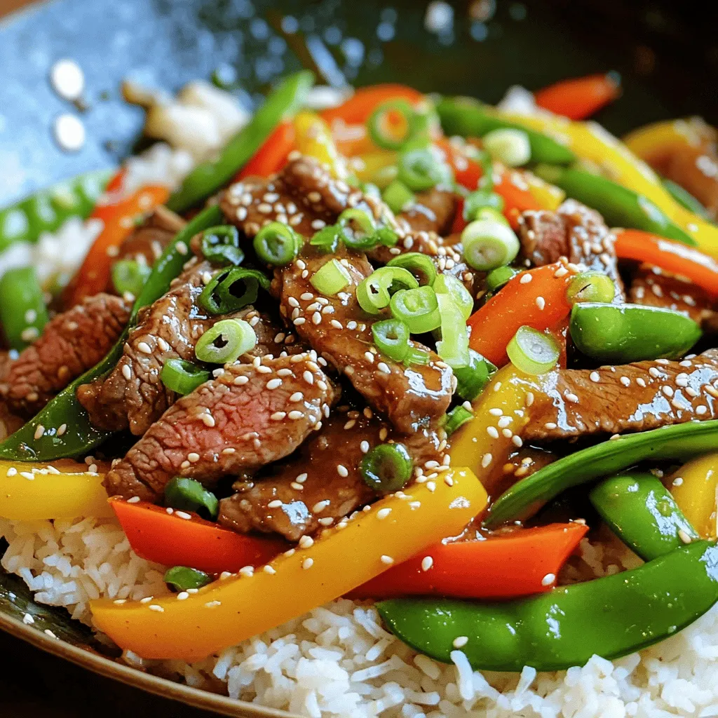 To make a tasty sesame ginger beef stir fry, you need: - 1 lb (450 g) beef sirloin, thinly sliced against the grain - 2 tablespoons sesame oil - 1 tablespoon fresh ginger, minced - 3 cloves garlic, minced - 1 bell pepper (red or yellow), sliced - 1 cup snap peas, trimmed - 1 carrot, julienned - 4 green onions, sliced - 2 tablespoons soy sauce - 1 tablespoon hoisin sauce - 1 tablespoon rice vinegar - 1 tablespoon sesame seeds - Salt and pepper to taste - Cooked jasmine rice, for serving You can add extra flavor by using: - 1 tablespoon chili paste for heat - 1 tablespoon oyster sauce for richness - 1 teaspoon sugar to balance flavors - Fresh herbs like cilantro or basil for garnish If you can't find some ingredients, here are swaps: - Use flank steak or sirloin tip instead of sirloin. - Swap sesame oil with canola or vegetable oil. - Replace snap peas with green beans or broccoli. - Use coconut aminos instead of soy sauce for a gluten-free option. - If you want a different vinegar, try apple cider vinegar. By mixing and matching, you can make this dish your own! For the full recipe, check out the detailed instructions above. 1. Marinate the Beef: In a bowl, mix the sliced beef with 1 tablespoon of soy sauce, a pinch of salt, and pepper. Let it sit for 15 minutes to soak in the flavors. 2. Prep the Sauce: In a small bowl, whisk together the remaining soy sauce, hoisin sauce, rice vinegar, minced ginger, and minced garlic. Set this aside for later. 3. Heat the Oil: In a large wok or skillet, heat the sesame oil over medium-high heat until it shimmers. 4. Stir Fry the Beef: Add the marinated beef to the hot wok in a single layer. Cook for 2-3 minutes without stirring. This helps brown the beef. Stir and cook for another 1-2 minutes until it cooks through. Remove the beef from the wok and set it aside. 5. Cook the Vegetables: In the same wok, add the sliced bell pepper, snap peas, and carrot. Stir fry for about 3-4 minutes. You want them soft but still crunchy. 6. Combine Everything: Return the cooked beef to the wok. Pour in the sauce and toss everything together. Cook for another 2 minutes until the sauce thickens slightly and coats the beef and veggies. 7. Finish: Stir in the sliced green onions and sprinkle sesame seeds over the stir fry. 8. Serve: Serve your sesame ginger beef stir fry over a bed of fluffy jasmine rice for a complete meal. This dish is not just tasty; it also looks great on the plate! For the full recipe, check the section above. To cook beef just right, start with thin slices. This helps it cook faster. Marinate the beef for at least 15 minutes. Use salt and soy sauce to boost flavor. When cooking, let the beef rest in one layer in the hot wok. Don't move it for 2-3 minutes. This gives a nice brown crust. Stir it only after it browns. This keeps the beef tender and juicy. A great sauce makes your stir fry shine. Combine soy sauce, hoisin sauce, rice vinegar, ginger, and garlic. This mix brings sweet, salty, and tangy notes. The balance is key to a rich flavor. Don’t rush this step. Let the sauce sit a bit before adding it to the beef. This allows the flavors to meld well. To keep your veggies crunchy, heat the wok well before adding them. High heat cooks them fast, locking in texture. Stir fry for only 3-4 minutes. This keeps them vibrant and crisp. Use fresh veggies for the best taste and quality. You can add them in stages if needed. Start with heartier vegetables like carrots. Add softer ones like bell peppers later. This ensures all veggies are just right. {{image_2}} You can easily turn this dish into a vegetarian delight. Replace the beef with mushrooms or tempeh. Both add great texture and soak up the flavors. Use the same marinade for the mushrooms. Marinate them for about 10 minutes. Sauté them until golden brown. This gives you a rich and savory taste. Add your favorite veggies like broccoli or zucchini for more nutrients. Chicken is another great option. Use chicken breast, sliced thinly. Follow the same steps as with beef. Cook it until it turns golden and juicy. Tofu is also a fantastic choice. Press the tofu to remove excess water. Cut it into cubes and sauté until crispy. Both options work well with the sauce and spices. Feel free to mix in different vegetables. You can add bell peppers in various colors for a vibrant look. Broccoli, bok choy, or snow peas add crunch and flavor. Carrots and snap peas are also excellent choices. Using seasonal vegetables makes it fun. Experiment and find what you like best! Each vegetable brings its unique taste and texture, making your stir fry even better. To keep your sesame ginger beef stir fry fresh, let it cool first. Once cooled, place it in an airtight container. Store it in the fridge for up to three days. This keeps the flavors intact and prevents spoilage. When you’re ready to enjoy your leftovers, heat them in a skillet. Add a splash of water or broth to keep it moist. Heat on medium until warm, stirring often. You can also use the microwave, but cover the dish to avoid drying it out. If you want to save it for later, freezing works well. Place the stir fry in a freezer-safe container. It can last up to three months in the freezer. When you’re ready to eat, thaw it in the fridge overnight before reheating. This method helps maintain its tasty flavors. For the complete cooking process, refer to the Full Recipe. The best type of beef for stir fry is beef sirloin. It is tender and flavorful. You can also use flank steak, which is great for stir frying. Both cuts cook fast and stay juicy. Cut the meat thinly against the grain to help with tenderness. This helps make each bite easy to chew. Yes, you can make sesame ginger beef stir fry ahead of time. Store the cooked stir fry in an airtight container. It will last in the fridge for about three days. When you are ready to eat, simply reheat it in a skillet or microwave. This dish tastes even better the next day as the flavors blend together. Good side dishes 