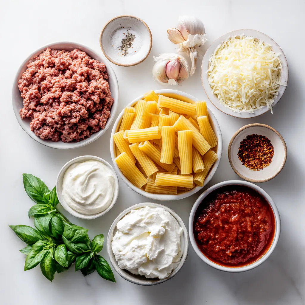 Gather these ingredients before you start. The ziti pasta serves as the hearty base. You can choose either ground beef or turkey based on your taste. The cheeses create a creamy, rich flavor that makes this dish special.
