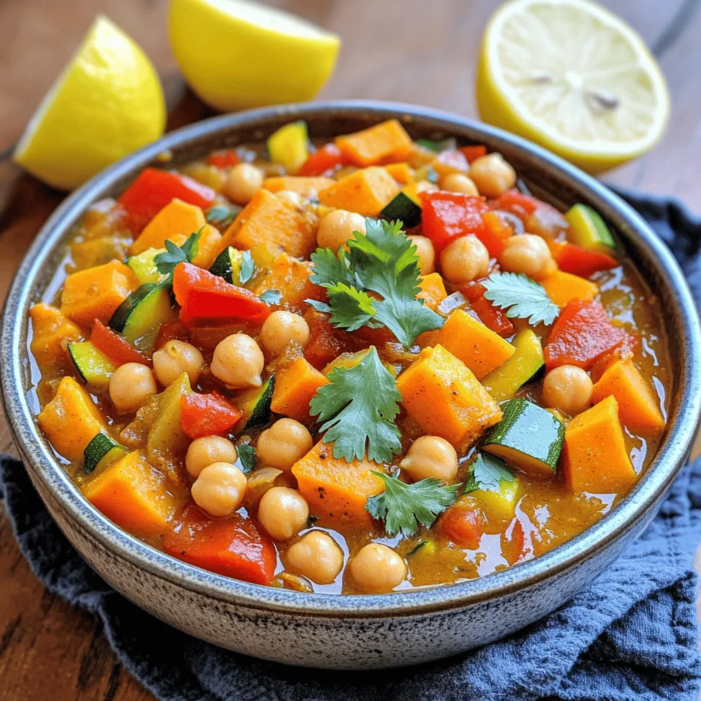 - 1 can (15 oz) chickpeas, drained and rinsed - 1 large onion, chopped - 2 cloves garlic, minced - 1 medium sweet potato, diced - 1 red bell pepper, chopped - 1 zucchini, chopped Chickpeas are the star of this stew. They add protein and a creamy texture. Onions and garlic create a strong base. Sweet potatoes add sweetness and heartiness. Red bell peppers and zucchini bring color and crunch. - 1 tablespoon ground cumin - 1 tablespoon ground coriander - 1 teaspoon ground cinnamon - 1 teaspoon turmeric - ½ teaspoon cayenne pepper (adjust for spice preference) - 2 cups vegetable broth - 2 tablespoons olive oil The spices give this stew a warm, inviting taste. Cumin and coriander are key for that classic Moroccan flavor. Cinnamon adds depth, while turmeric brings a lovely color. Cayenne pepper gives it a kick, but you can adjust it. Olive oil adds richness and helps blend all the flavors. - Fresh cilantro or parsley - Lemon wedges Fresh herbs brighten up each bowl. Cilantro or parsley adds a fresh touch. Lemon wedges let you add a zesty burst to each bite. This stew is perfect with crusty bread or over fluffy couscous. Start by adding the chopped onion and minced garlic to the bottom of your slow cooker. This creates a fragrant base that will infuse the stew with great flavor. Next, layer the diced sweet potato, chopped bell pepper, and zucchini right over the onion and garlic. This mix of veggies not only adds color but also texture. Now rinse the canned chickpeas under cold water. This step helps remove excess salt. Add the rinsed chickpeas on top of the veggie layers. Then, pour in the can of diced tomatoes, juices included. The tomatoes will help create a nice sauce for the stew. In a separate bowl, mix together the vegetable broth with ground cumin, coriander, cinnamon, turmeric, cayenne pepper, salt, and pepper. Stir it well to blend the spices. Pour this spiced broth mixture over the ingredients in the slow cooker. It should cover everything nicely. Finally, drizzle the olive oil over the top to add richness and depth of flavor. Cover the slow cooker and set it to cook on low for 6-8 hours or high for 4-5 hours. This slow cooking helps meld all the flavors together. After the cooking time, check for doneness. The vegetables should be tender and the stew should smell amazing. If needed, adjust the seasoning before serving. How to adjust spice levels To change spice levels, start with less cayenne pepper. Taste the stew after cooking. If you want more heat, add a bit more cayenne. You can also use hot sauce at the end. Varying cook times based on slow cooker models Each slow cooker cooks a bit differently. Check your stew for doneness after about six hours on low. If your cooker is faster, it may be done sooner. If it’s slower, it may need more time. Always trust your taste buds! Additional spices and herbs to consider You can add more spices for a deeper flavor. Try some smoked paprika or ginger. Fresh herbs like thyme or mint can also add a nice touch. Mix and match to find your favorite blend. Suggestions for umami boosters To boost umami, add a tablespoon of soy sauce or miso paste. These add a savory depth to your stew. You can also include a splash of balsamic vinegar for extra richness. Serving suggestions and pairings Serve the stew over fluffy couscous or rice for a filling meal. You can also pair it with warm, crusty bread. A side salad with lemon vinaigrette brightens the meal. Creative garnish options Garnish each bowl with fresh cilantro or parsley. Add a sprinkle of toasted sesame seeds for crunch. A squeeze of lemon juice right before eating enhances the flavors wonderfully. {{image_2}} You can customize your stew with different vegetables. Try using carrots or eggplant. These veggies add unique flavors and textures. If you want a new twist, swap chickpeas for lentils or black beans. Each bean brings its own taste and texture, making your stew special. To make the stew vegan, ensure your broth is plant-based. The current recipe is already vegan friendly. If you need it gluten-free, check your vegetable broth. Most are gluten-free, but it's good to confirm. For low-sodium diets, use low-sodium broth and skip the added salt. You still get great flavor while keeping it healthy. Add dried fruits for a sweet touch. Raisins or apricots pair well with the spices. They add a nice contrast and depth to the dish. Feel free to play with spices too! Instead of the usual mix, try curry powder or garam masala. These options will give your stew a whole new vibe. To store leftover stew, let it cool first. Then, transfer it into a container. Use a glass or plastic container with a tight lid. This keeps the stew fresh and prevents spills. Keep it in the fridge for up to five days. You can freeze portions for later use. Divide the stew into smaller containers or freezer bags. Make sure to leave some space for expansion. When you're ready to eat, take it out and thaw in the fridge overnight. Reheat it on the stove or in the microwave until hot. In the fridge, the stew lasts for about five days. In the freezer, it can last up to three months. Make sure to label your containers with the date. This helps you keep track of how long it’s been stored. Yes, you can use dried chickpeas! You must soak and cook them first. Soak the dried chickpeas overnight in water. This helps them soften. After soaking, drain and rinse them. Then, boil them in fresh water for 1 to 1.5 hours. Ensure they are tender before adding them to the stew. This method takes more time but adds a great texture and flavor. You can serve this stew with several tasty sides. Here are some ideas: - Steamed rice or quinoa - Crusty bread or pita - A fresh green salad - Couscous for an extra Moroccan touch - Yogurt for a creamy contrast These pairings balance the flavors and add variety to your meal. To increase the heat, add more cayenne pepper. Start with a small amount, around a half teaspoon. Taste the stew, and add more if you 