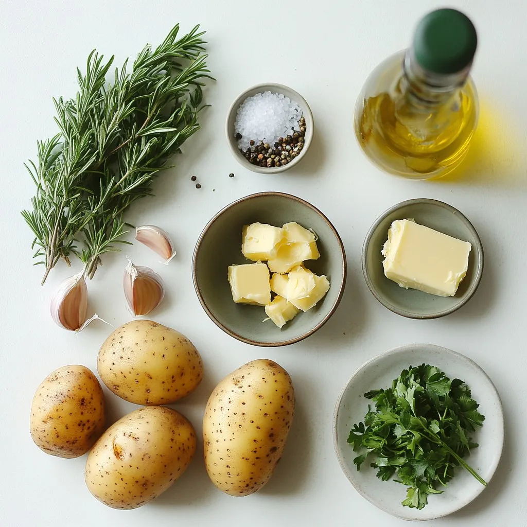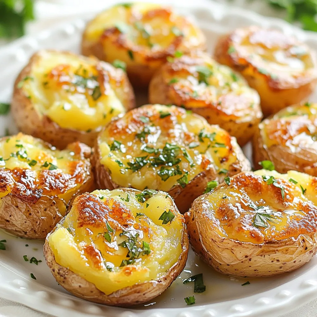 To make Smashed Garlic Butter Potatoes, you need: - 1.5 pounds baby potatoes - 4 tablespoons unsalted butter, melted - 5 cloves garlic, minced - 1 teaspoon fresh rosemary, chopped (or ½ teaspoon dried) - Salt and black pepper to taste - 1 tablespoon olive oil - Fresh parsley, chopped, for garnish These ingredients make the dish tasty and simple. The baby potatoes give a nice texture. The garlic and butter add rich flavor. You can also add these ingredients for more flavor: - A squeeze of fresh lemon juice - Crushed red pepper flakes for heat - Grated Parmesan cheese for richness These extras can take your potatoes to the next level. They enhance the taste and make it special. Here’s what you will need to cook this recipe: - Large pot for boiling potatoes - Potato masher or the bottom of a glass - Baking sheet lined with parchment paper - Mixing bowl for the garlic butter Having the right tools makes cooking easier. Using parchment paper helps with cleanup too. {{ingredient_image_1}} Start by preheating your oven to 425°F (220°C). This high heat gives the potatoes a nice crunch. While the oven heats, fill a large pot with water and add salt. Bring the water to a boil. Once boiling, add 1.5 pounds of baby potatoes. Cook them for about 15 to 20 minutes until they are fork-tender. When done, drain the potatoes and let them cool slightly. This helps you handle them without burning your fingers. In a small bowl, combine 4 tablespoons of melted unsalted butter with 5 minced garlic cloves. Add 1 teaspoon of fresh rosemary and season with salt and black pepper. Mix it well until all the ingredients blend together. This garlic butter will soak into the potatoes and add amazing flavor. Next, line a baking sheet with parchment paper. Place the cooked potatoes on the sheet. Using a potato masher or the bottom of a glass, gently smash each potato until it flattens but stays intact. Drizzle the garlic butter mixture evenly over the smashed potatoes, making sure each one gets coated. Then, drizzle 1 tablespoon of olive oil over them. You can add more salt and pepper if you like. Roast the potatoes in the oven for 20 to 25 minutes. They should be crispy and golden brown when ready. Finally, take them out and sprinkle fresh parsley on top for a pop of color. Enjoy! Choosing the right potatoes is key to this dish. I like using baby potatoes. They are small and tender. Look for smooth skins without blemishes. Fresh potatoes give the best flavor. You can also use Yukon Gold or red potatoes. They hold up well when smashed. Crispiness is what makes these potatoes shine. Smash them gently but firmly. This helps create more edges. More edges mean more crispy bits. Drizzle the garlic butter evenly for flavor all around. A bit of olive oil helps with browning, too. Roast them in a hot oven at 425°F. This high heat gives that golden, crunchy finish. Timing is everything when cooking these potatoes. Boil them for about 15 to 20 minutes. You want them fork-tender but not mushy. After boiling, let them cool for a few minutes. This makes smashing easier. Then, roast them for 20 to 25 minutes. Keep an eye on them to avoid burning. Perfect timing makes all the difference for great flavor. Pro Tips Choose the Right Potatoes: For the best texture, use waxy baby potatoes, as they hold their shape better when smashed. Perfecting Garlic Flavor: Let the minced garlic sit for 10 minutes before using it to enhance its flavor and health benefits. Get Crispy Edges: Ensure the smashed potatoes have enough space on the baking sheet to crisp up nicely without steaming. Garnish for Freshness: Always add fresh parsley just before serving to maintain its vibrant color and flavor. {{image_2}} You can change the herbs to fit your taste. Try thyme or basil for a fresh touch. Adding dill gives a nice, bright flavor. You can also mix herbs for a bold taste. Just chop them finely and mix into the garlic butter. This adds layers of flavor to your smashed potatoes. Want to make these potatoes even richer? Add cheese or bacon! Sprinkle shredded cheese like cheddar or Parmesan on top before roasting. For a smoky flavor, add crispy bacon bits. Both options bring a new level of yumminess. Just make sure to adjust the salt since cheese can be salty. If you want a vegan twist, swap the butter for vegan butter or olive oil. The flavor stays rich and creamy. You can also add nutritional yeast for a cheesy taste. This keeps it plant-based but still full of flavor. Your guests won’t even miss the dairy! To store leftovers, let the smashed garlic butter potatoes cool. Once cool, place them in an airtight container. Keep them in the fridge for up to three days. Make sure to label the container with the date. This way, you won't forget how long they've been there. When you're ready to eat your leftovers, preheat your oven to 350°F (175°C). Spread the potatoes on a baking sheet. Heat them for about 15 minutes. This method keeps them crispy. You can also microwave them. Just heat for about one to two minutes. Check to make sure they are hot all the way through. If you want to freeze these potatoes, let them cool completely first. Place them in a freezer-safe container or bag. They can last up to three months in the freezer. When you're ready to enjoy them, thaw in the fridge overnight. Then, reheat them in the oven for the best texture. Yes, you can make these potatoes ahead. Cook them and smash them. Then, store them in the fridge. When ready, bake them until hot and crispy. Baby potatoes are the best choice. They are small and tender. You can also use Yukon Gold or red potatoes. These types hold their shape well when smashed. Yes, you can use other oils. Avocado oil or melted coconut oil work great. They add their own unique flavor to the dish. The potatoes should be fork-tender. You can easily pierce them with a fork. If they feel soft but not mushy, they are ready to smash. Absolutely! Use vegan butter or olive oil instead of butter. This keeps 