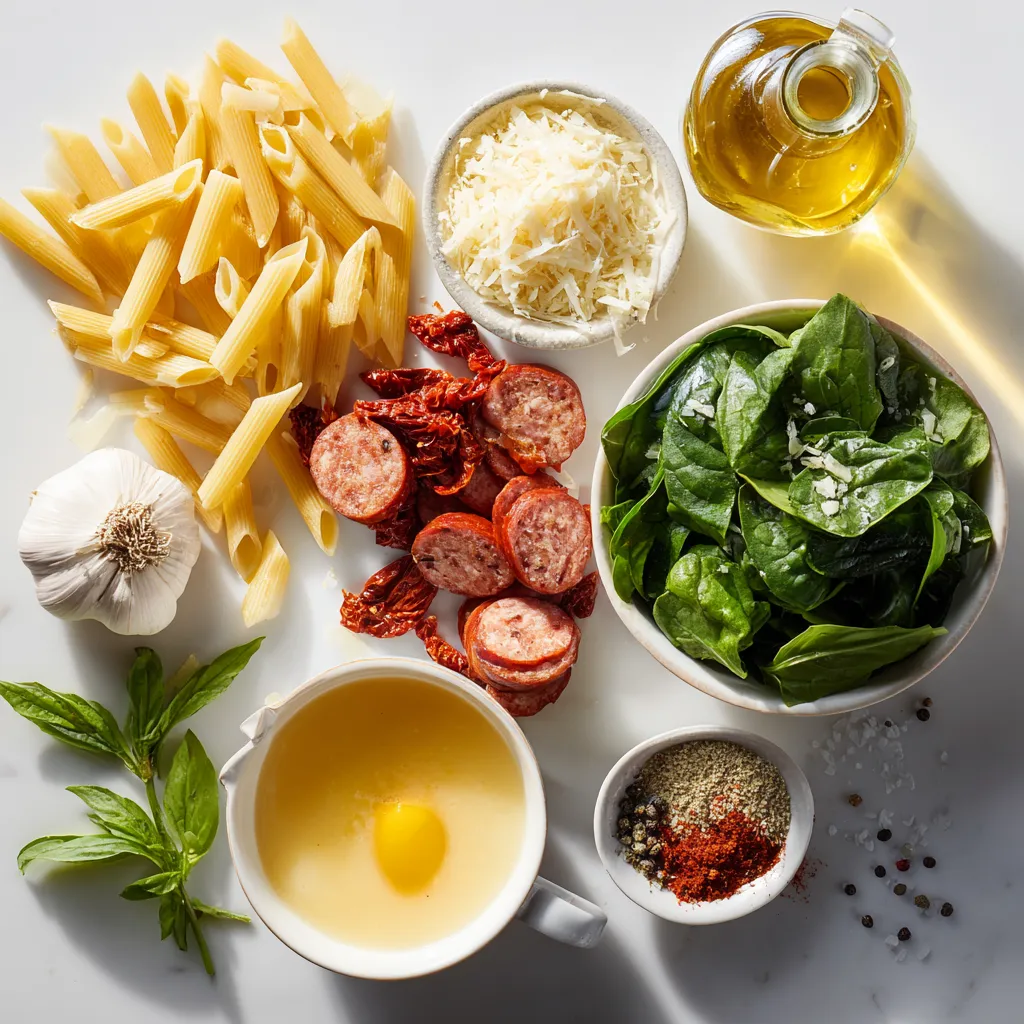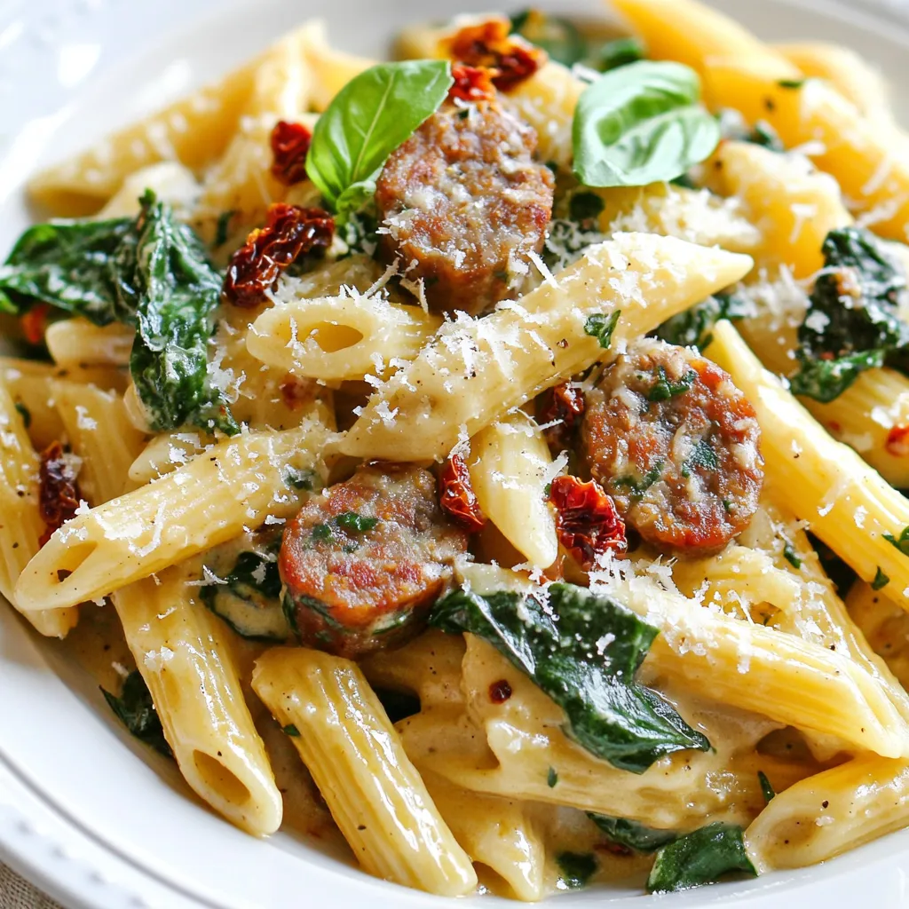 A rich and creamy pasta dish featuring smoked sausage, fresh spinach, and sun-dried tomatoes.
