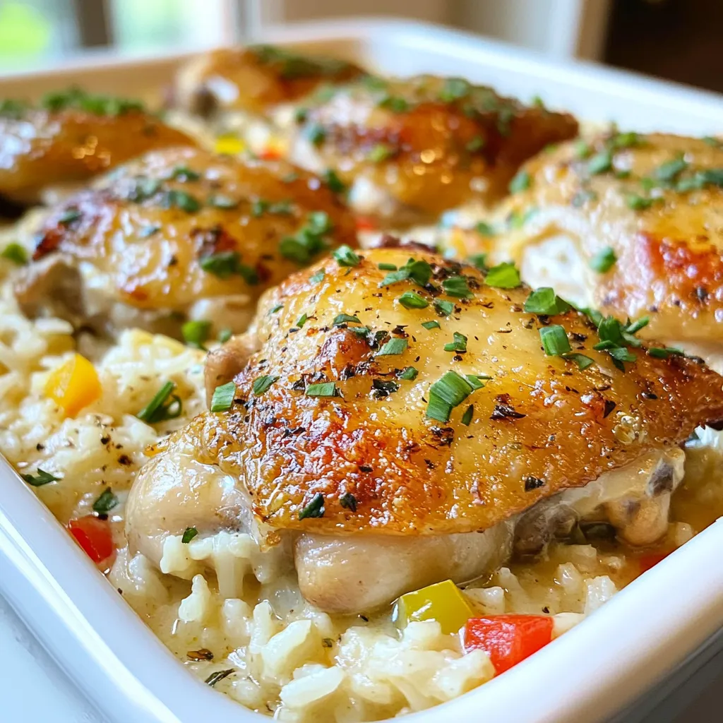 A comforting dish of chicken thighs cooked in a creamy rice mixture, perfect for a family meal.