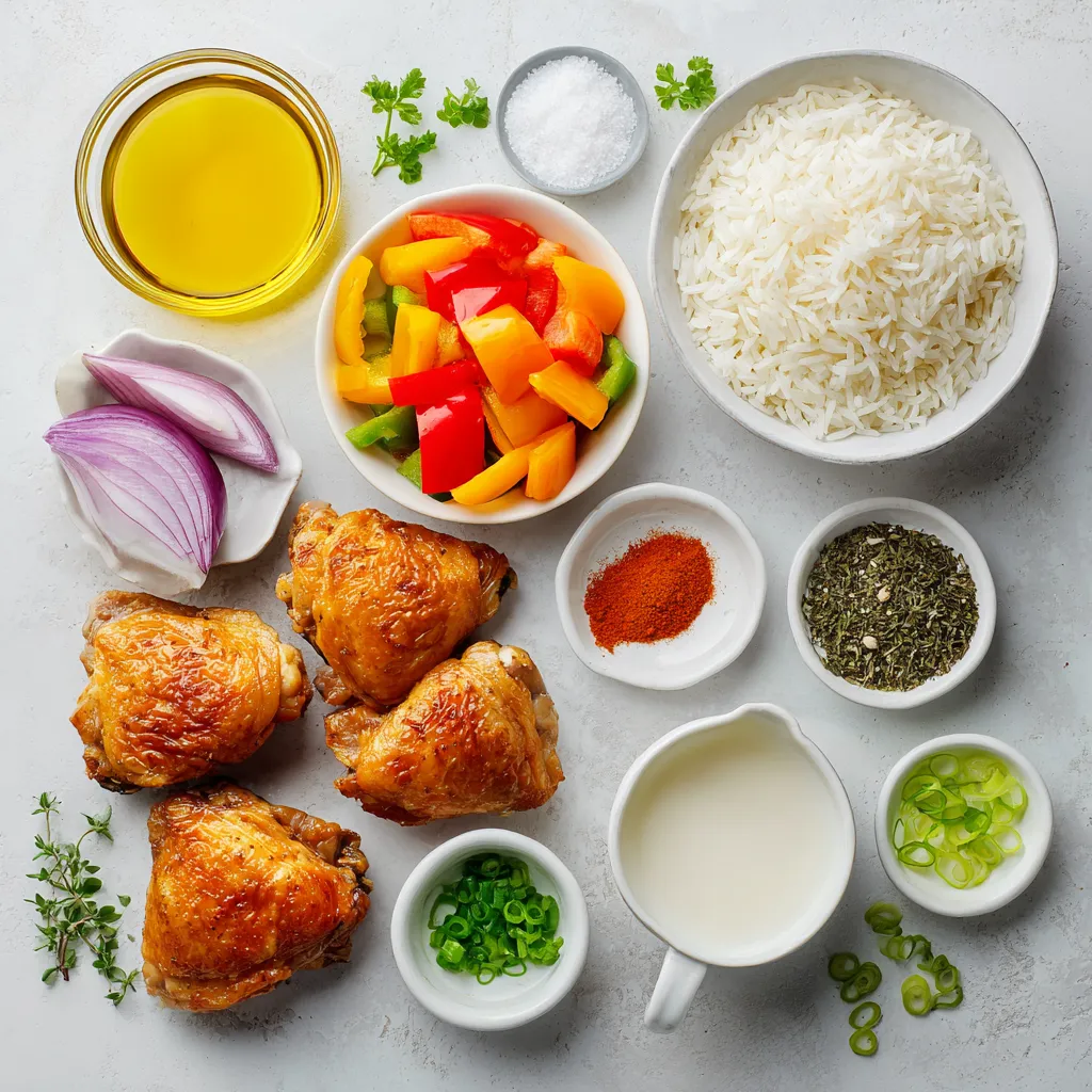 These main ingredients form the heart of your dish. Chicken thighs bring rich flavor and moisture. The onion, garlic, and bell pepper add a nice base. Long-grain rice absorbs the delicious sauce well. Chicken broth and heavy cream create a creamy, savory sauce.