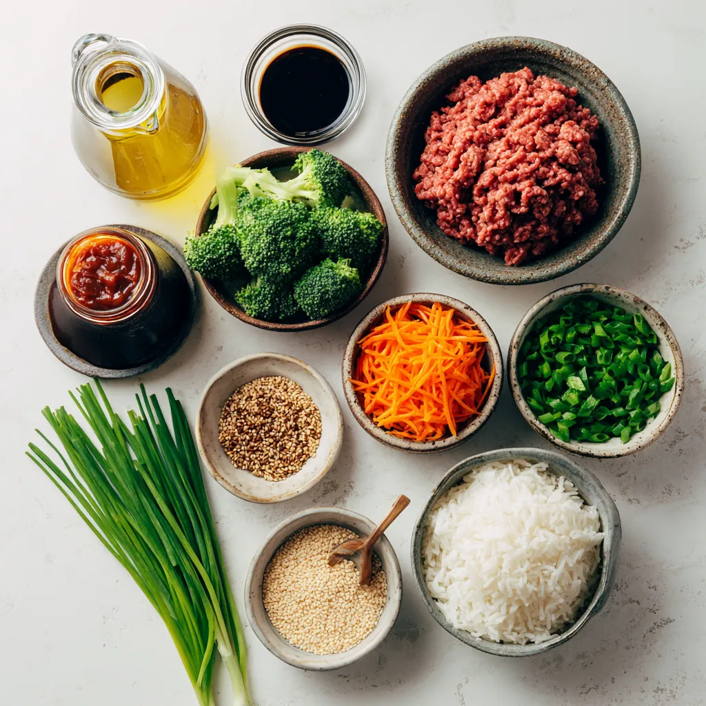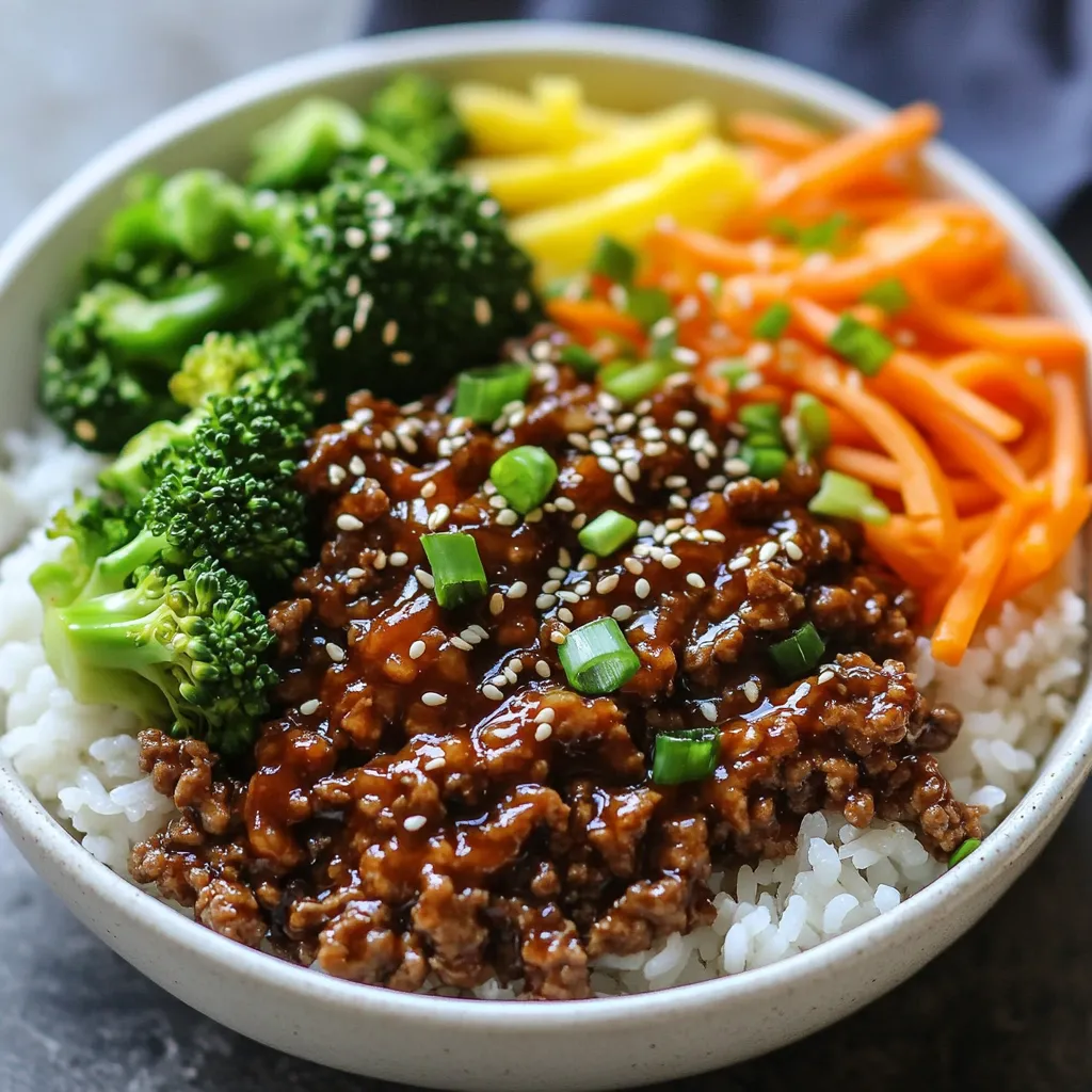 - 1 lb (450g) ground beef - 2 tablespoons soy sauce - 1 tablespoon gochujang (Korean chili paste) - 1 tablespoon sesame oil - 2 teaspoons grated ginger - 3 cloves garlic, minced - 1 teaspoon brown sugar - 2 green onions, chopped - 1 small carrot, julienned - 1 cup cooked jasmine rice - 1 cup steamed broccoli - Sesame seeds for garnish I love how these ingredients come together. The ground beef provides a rich base. Gochujang adds that signature kick. It’s sweet, spicy, and oh-so-delicious. Soy sauce brings umami, making every bite tasty. Aromatics like garlic and ginger are key. They create an amazing aroma as they cook. The carrots and broccoli add color and crunch. Plus, they bring a healthy balance to the dish. - Skillet - Spatula - Measuring Spoons For cooking, you'll need a skillet. This is where all the magic happens. A spatula helps break the beef apart while it cooks. Measuring spoons ensure you get the right amounts. This way, your flavors stay on point. Gather these items before you start. It makes the cooking process smoother and more fun! {{ingredient_image_1}} - Sautéing Garlic and Ginger First, heat 1 tablespoon of sesame oil in a large skillet over medium heat. Next, add 3 cloves of minced garlic and 2 teaspoons of grated ginger. Sauté these for about 30 seconds until they smell great. This step builds a strong flavor base for your dish. - Browning the Beef Now, add 1 pound of ground beef to the skillet. Cook the beef for 5-7 minutes. Use a spatula to break it apart as it cooks. You want it to be nicely browned. - Mixing in Soy Sauce and Gochujang After browning, drain any extra fat. Then, stir in 2 tablespoons of soy sauce, 1 tablespoon of gochujang, and 1 teaspoon of brown sugar. Mix everything well. Let it simmer for 2-3 minutes. This helps the beef soak up all those spicy flavors. - Serving Over Jasmine Rice Grab 1 cup of cooked jasmine rice for each bowl. Spoon the spicy beef mix over the rice. This makes a tasty and filling base. - Adding Steamed Broccoli and Garnishing Top each bowl with 1 cup of steamed broccoli. Then, sprinkle 2 chopped green onions and some sesame seeds on top. This adds color and crunch to your meal. Enjoy the burst of flavors in every bite! - Adjusting Gochujang Levels Gochujang gives the dish its heat. Start with one tablespoon. If you like more spice, add more gochujang. Mix it in well. You can always taste as you go. This way, you find your perfect heat level. - Taste Testing Before Serving Always taste your beef mix before serving. This lets you check if it needs more spice or seasoning. A quick taste can help balance flavors. Adjust spice levels if needed. Your guests will appreciate the effort. - Ground Beef Variations Use quality ground beef for the best flavor. You can also try lean ground turkey. It gives a lighter option without losing taste. Make sure to choose a fresh product. This makes a difference in your dish. - Sourcing Quality Ingredients Look for grass-fed beef or local sources. Fresh ingredients always enhance flavor. Visit farmer's markets if possible. They often have better quality products. This can elevate your spicy Korean beef bowls. - Pre-cooking Rice Cook your jasmine rice ahead of time. It saves you a lot of time. Make a big batch and store it in the fridge. This way, you can quickly assemble meals during the week. - Meal Prep Options Prepare your beef mix in advance. Cook it and store it in an airtight container. This keeps it fresh for a few days. You can reheat it easily for quick meals. Meal prep makes weeknight dinners much simpler. Pro Tips Use Fresh Ingredients: Fresh ginger and garlic will enhance the flavor of your dish significantly. Try to use freshly grated ginger and minced garlic for the best results. Adjust the Spice Level: If you prefer a milder dish, reduce the amount of gochujang. You can also add more sugar to balance the heat. Meal Prep Friendly: This recipe is perfect for meal prepping. Cook a larger batch and divide into containers for easy lunches throughout the week. Garnish for Flavor: Don't skip the sesame seeds and green onions! They add not only visual appeal but also a nice crunch and extra flavor. {{image_2}} You can switch out the ground beef for other proteins. Using chicken is great. Ground chicken works well in this dish. It absorbs the flavors nicely. You can also use tofu for a plant-based option. Firm tofu gives a nice texture. Just crumble it and cook it like beef. For a vegan adaptation, try using tempeh or lentils. Both options are healthy and tasty. They soak up the sauce and spices well. This way, everyone can enjoy the dish! Feel free to add different vegetables to your bowls. Bell peppers, snap peas, or zucchini can add color and crunch. You can also toss in some spinach for extra greens. It wilts down nicely and adds nutrients. Pair your spicy beef bowls with side dishes. Kimchi is a classic Korean side that adds tang. You could also serve a simple cucumber salad. This cools your palate and balances the heat. Want to amp up the flavor? Incorporate other spices like sesame seeds or red pepper flakes. These can give more depth to the dish. You can also try adding a splash of rice vinegar. It brings a nice zing to the mix. Different sauces can enhance your beef bowls too. Swap the soy sauce for tamari for a gluten-free option. Or mix in some hoisin sauce for a sweet twist. Experimenting with these can make your meal unique every time! To store leftovers, place the beef bowls in an airtight container. Make sure to cool them to room temperature first. This helps keep the food fresh. Use them within three to four days for the best taste. For the best containers, use glass or BPA-free plastic ones. They keep food fresh and help avoid spills in the fridge. When reheating, the microwave works well, but use medium heat. Stir the beef every minute to heat it evenly. Another great method is using a skillet on low heat. This keeps the flavors bright. To prevent dryness, add a spla