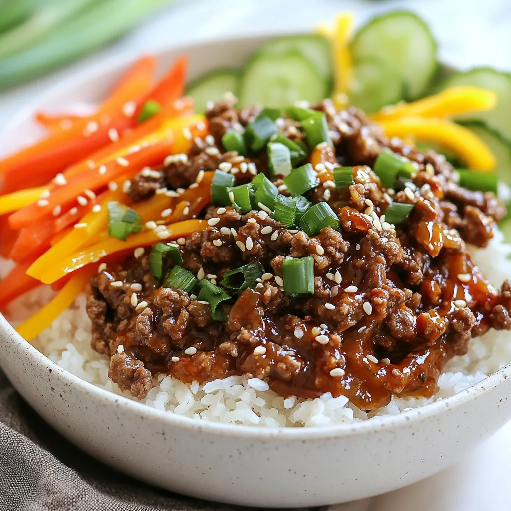- 1 lb ground beef - 3 cloves garlic, minced - 2 tablespoons ginger, grated - 3 tablespoons gochujang (Korean chili paste) - 1 cup carrots, julienned - 1 cup bell peppers, thinly sliced (mix of red and yellow) - 2 green onions, sliced These main ingredients create a rich and spicy flavor. Ground beef serves as the base. Gochujang adds that famous Korean heat. Fresh vegetables bring color and crunch. - 2 tablespoons soy sauce - 1 tablespoon sesame oil - 2 tablespoons brown sugar Soy sauce adds savory depth. Sesame oil gives the dish a nutty aroma. Brown sugar balances out the spice with sweetness. - Sesame seeds for garnish - Sliced cucumbers for freshness Sesame seeds offer a nice crunch on top. Cucumber slices add a refreshing touch to each bite. They also help cool the heat from the spice. {{ingredient_image_1}} To start, heat a large skillet on medium-high. Add 1 lb of ground beef. Cook this beef for about 5-7 minutes. Use a spatula to break it apart as it cooks. Once it turns brown, check for extra fat. If there is too much fat, drain it out. This keeps your dish rich but not greasy. Next, it’s time to boost the flavor. Add 3 cloves of minced garlic and 2 tablespoons of grated ginger to the skillet. Stir these in for about 1 minute. You want to smell their nice aroma. Then, mix in 3 tablespoons of gochujang, 2 tablespoons of soy sauce, 1 tablespoon of sesame oil, and 2 tablespoons of brown sugar. Stir everything well. Cook for another 3-4 minutes until the beef is evenly coated and heated through. Now, we’ll add some color and crunch. Toss in 1 cup of julienned carrots and 1 cup of thinly sliced bell peppers. Stir these into the beef mixture. Cook for about 3-5 minutes. You want the vegetables to be soft but still a bit crisp. This adds texture to your meal. To get the right spice level, start with gochujang. This Korean chili paste brings a bold flavor. You can adjust the amount based on your taste. If you like it milder, use less gochujang. Pairing your beef bowl with mild sides helps balance the heat. Try serving it with steamed rice or sliced cucumbers. These sides cool the dish and make it more enjoyable. Cooking time matters for both meat and veggies. Cook the ground beef until it's browned, about 5-7 minutes. This step helps the meat absorb flavors. For the vegetables, stir-fry them for 3-5 minutes. This keeps them tender yet crisp. Marinading beef before cooking can add depth. A quick soak in soy sauce and sesame oil works wonders. It makes each bite flavorful and juicy. Serving your spicy beef over rice makes a great base. Use a generous scoop for a hearty meal. For a beautiful dish, garnish with sliced green onions and sesame seeds. These small touches add color and texture. You can also add cucumber slices on the side for freshness. A well-presented plate makes the meal more inviting and fun to eat. Pro Tips Use Fresh Ingredients: Always opt for fresh vegetables and high-quality ground beef to enhance the flavor of your dish. Adjust Spice Level: If you prefer a milder dish, reduce the amount of gochujang or add a bit more brown sugar to balance the heat. Meal Prep Friendly: This dish is great for meal prep! You can make a larger batch and store it in the refrigerator for up to 4 days. Try Different Veggies: Feel free to mix in other vegetables like broccoli or snap peas for added nutrition and flavor. {{image_2}} You can swap ground beef for ground turkey or chicken. These options give you a lighter dish. Both meats work well with the spicy sauce. If you want a plant-based meal, use plant-based meat. It mimics beef well and still tastes great. This way, everyone can enjoy the meal. Not a fan of rice? Try quinoa or cauliflower rice. Both options add nutrition and flavor. Quinoa is protein-packed, while cauliflower rice is low in carbs. You can also serve the beef in lettuce wraps. This makes a fun, fresh dish that’s easy to eat. Want to boost the flavor? Add more veggies like zucchini or snap peas. They add crunch and color to the dish. You can also play with spices. A pinch of red pepper flakes can add extra heat. Experiment with what you like to make it your own! To keep your spicy Korean beef bowls fresh, store leftovers in the fridge. Use airtight containers. They will last for about 3 to 4 days. If you want to keep them longer, freezing is a great option. Place the beef mixture in freezer-safe bags. Remove as much air as possible. You can freeze it for up to 3 months. When ready to eat, reheating is simple. For best results, use the stovetop. Heat a skillet over medium heat and add a splash of water. This helps keep the beef moist. Stir until warmed through, about 5-7 minutes. You can also use the microwave. Place the beef in a microwave-safe bowl and cover it. Heat in short bursts, stirring in between. This method is faster but may dry out the beef. To save time, prepare ingredients in advance. Chop your vegetables the night before. Store them in the fridge in separate containers. You can also cook the beef mixture ahead of time. Just reheat it when you’re ready to eat. For quick meals, assemble bowls with rice, beef, and veggies. This makes lunch or dinner a breeze on busy days. Gochujang is a thick, red chili paste. It has a sweet and spicy flavor. This blend gives dishes a deep umami taste. You can find gochujang at Asian markets or online. Many grocery stores also carry it in the international aisle. Yes, you can make this dish gluten-free. Replace soy sauce with tamari or coconut aminos. These options taste great and keep the dish safe for gluten-free diets. Always check labels to ensure no hidden gluten ingredients. To reduce the heat, use less gochujang. You can also mix in some sugar to balance the spice. Adding more vegetables like carrots or bell peppers can help too. These will add sweetness and flavor without the heat. This blog post explored a tasty dish using ground beef and gochujang. You learned about the key ingredients, how to cook, and tips 