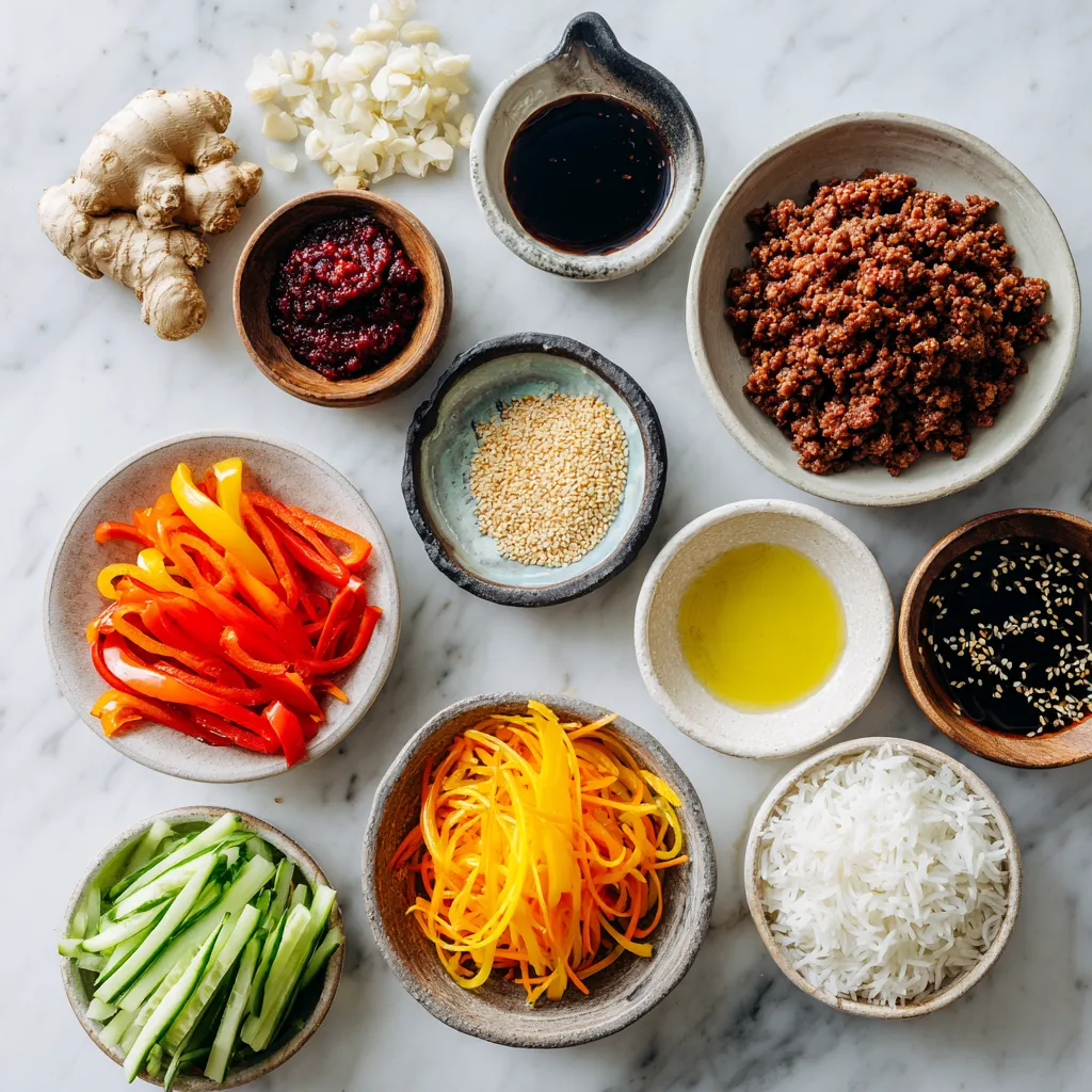 These main ingredients create a rich and spicy flavor. Ground beef serves as the base. Gochujang adds that famous Korean heat. Fresh vegetables bring color and crunch.