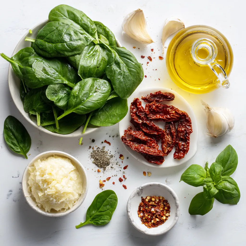 You need just a few key ingredients for this dish. Start with pasta. Penne or fusilli are my favorites. They hold sauce well and give you a great bite. Next, grab some fresh spinach and sun-dried tomatoes. They add color and flavor. Garlic brings an aromatic touch when sautΓ©ed.