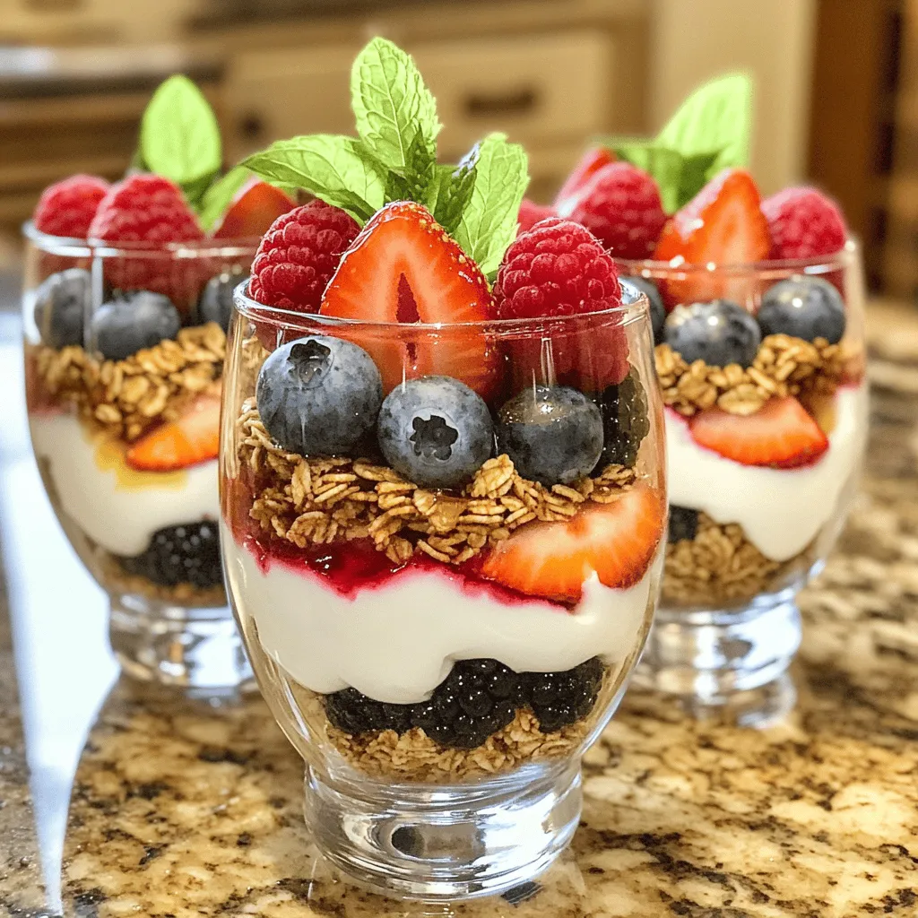 For this parfait, use fresh berries. I love a mix of: - 1 cup strawberries, hulled and sliced - 1 cup blueberries, plump and juicy - 1 cup raspberries, tart and sweet - 1 cup blackberries, bold and delicious These berries bring bright colors and fresh flavors. You can mix and match based on what is in season or what you like best. Yogurt is key to a creamy parfait. Choose from: - 2 cups Greek yogurt, plain for tang - 2 cups Greek yogurt, vanilla for sweetness Greek yogurt adds thickness and protein. If you pick plain yogurt, add: - 2 tablespoons honey or maple syrup, to sweeten - 1 teaspoon vanilla extract, for extra flavor Granola adds crunch to your parfait. I recommend: - 1 cup nutty granola, for rich taste - You can also try other types like fruity or chocolate granola Granola adds a nice texture and blends well with the creamy yogurt and juicy berries. Feel free to choose your favorite! For the full recipe, check out Spring Berry Parfait. Start with fresh berries. Rinse them gently in cool water. Pat them dry with a soft towel. If you have strawberries, remove the green tops and slice them into smaller pieces. Keep the smaller berries whole. This adds texture and color to your parfait. Use a mix of strawberries, blueberries, raspberries, and blackberries for the best flavor. Grab a medium bowl. Add the Greek yogurt to it. If you want, use plain yogurt or vanilla yogurt. Next, add honey or maple syrup to the yogurt. Start with two tablespoons. You can adjust it to your taste. If you chose plain yogurt, add one teaspoon of vanilla extract. Mix everything until it is smooth and creamy. Now, let’s build your parfait! Take clear serving glasses or bowls. Start with a layer of yogurt. Use about 1/4 cup of yogurt for each serving. Then, sprinkle about 2 tablespoons of granola on top. This gives a nice crunch. Next, add a layer of mixed berries. Use about 1/3 cup for this layer. Make it colorful and fun! Repeat these layers until your glass is full. Finish with a layer of mixed berries on top. To make it special, add a fresh mint leaf for garnish. This gives a nice pop of green. If you want, chill the parfaits for about 30 minutes. This helps the flavors blend together. Enjoy this fun and tasty Spring Berry Parfait with your friends and family. For the full recipe, check the recipe card! Use clear glass cups for your parfaits. This lets you see the bright colors of the berries and layers. Aim for neat, even layers. Start with yogurt, then granola, and top with berries. A little mint leaf adds a nice touch. This small detail makes your dish look fancy. Chilling your parfaits enhances their taste. If you have time, let them sit for about 30 minutes in the fridge. This helps the flavors mix and taste even better. The yogurt gets a little firmer too, which is nice for texture. You can serve the parfaits as a snack, breakfast, or dessert. Pair them with a warm drink for breakfast or serve them after dinner. Each parfait is easy to grab, making them great for parties. You can also offer a variety of toppings for guests to choose from. This lets everyone customize their parfait just the way they like it. For the complete recipe, check out the full recipe section. {{image_2}} You can switch up the berries in this parfait for other fruits. Try using sliced bananas for a creamy texture. Peaches add a sweet, fragrant taste. Mango chunks bring a tropical twist. Pineapple can add a zingy flavor. Mix and match fruits for fun combinations. Just remember to keep the balance of sweet and tart. If you want a dairy-free parfait, there are great choices. Use coconut yogurt or almond yogurt instead of Greek yogurt. Both options offer a creamy base without any dairy. You can also try cashew yogurt for a rich taste. These swaps keep your parfait delicious and friendly for those avoiding dairy. To boost flavor, consider adding spices or extracts. Cinnamon or nutmeg can bring warmth to the yogurt. A splash of orange juice adds brightness. You could also fold in some lemon zest for a refreshing touch. These simple changes make each bite exciting and unique. For extra crunch, try adding nuts or seeds between the layers. Find the complete recipe for this delightful Spring Berry Parfait [Full Recipe]. You can keep your Spring Berry Parfait in the fridge for up to two days. Just cover the parfaits with plastic wrap or a lid. This helps keep them fresh and tasty. The berries will stay firm, and the yogurt will remain creamy. For long-term storage, consider freezing the layers separately. You can freeze the yogurt in an airtight container. The berries can also go into a freezer bag. Granola should stay dry, so keep it in a separate container. You can assemble the parfait later when ready to eat. To keep your parfait fresh, layer right before serving. If you make it ahead, add the granola just before you eat. This way, it stays crunchy. Always store your parfaits in the coldest part of the fridge. This helps keep flavors bright and delicious. For full details on making this recipe, refer to the Full Recipe. Yes, you can use frozen berries in your parfait. Just make sure to thaw them first. Thawing helps keep the texture nice. It also allows the berries to release some juice, which adds flavor. Keep in mind that frozen berries can be softer than fresh ones. If you want a firmer bite, use fresh berries. To make a vegan parfait, swap the Greek yogurt for coconut yogurt or almond yogurt. You can also use maple syrup instead of honey. These options keep the parfait creamy and sweet. The fruits will still shine through, providing fresh taste. You won’t miss the dairy at all. If you don’t have granola, try nuts or seeds. Chopped almonds or walnuts add crunch. You can also use toasted coconut for a sweet twist. If you prefer a lighter option, use puffed rice or oats. Each choice will bring its own flavor and texture to the parfait. For the full recipe, check out the comprehensive guide above. This blog post shared key steps 