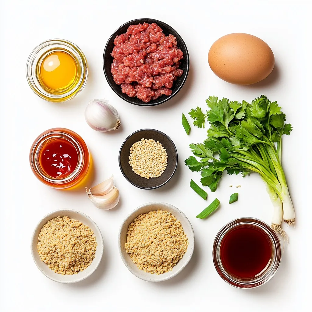 Start by gathering your ingredients. Take 1 pound of ground beef or turkey. In a large bowl, add 1/2 cup of breadcrumbs. Next, stir in 1/4 cup of finely chopped green onions. Crack in 1 large egg, then add 2 cloves of minced garlic and 1 teaspoon of grated ginger. Season with salt and pepper. Mix everything together well until all ingredients blend nicely.