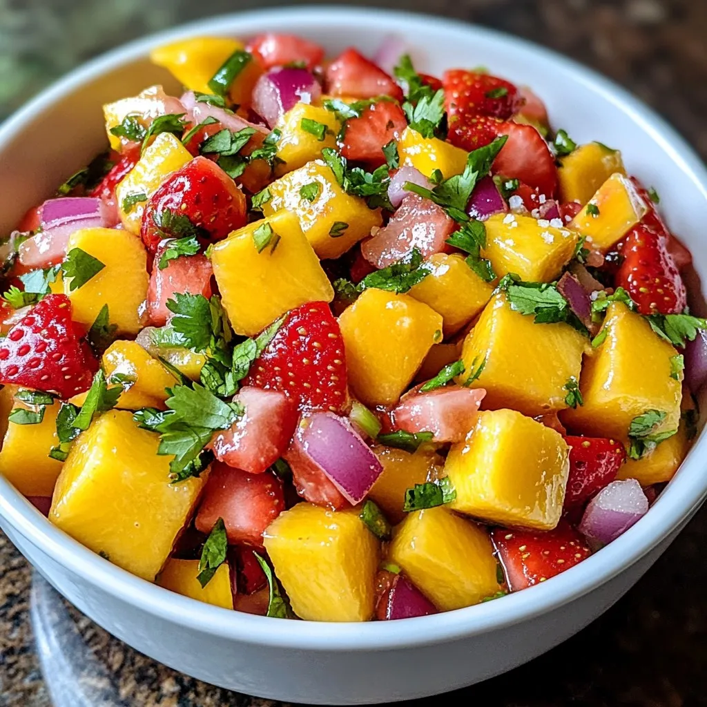 A vibrant and refreshing salsa made with fresh strawberries and mango, perfect for pairing with chips or grilled dishes.
