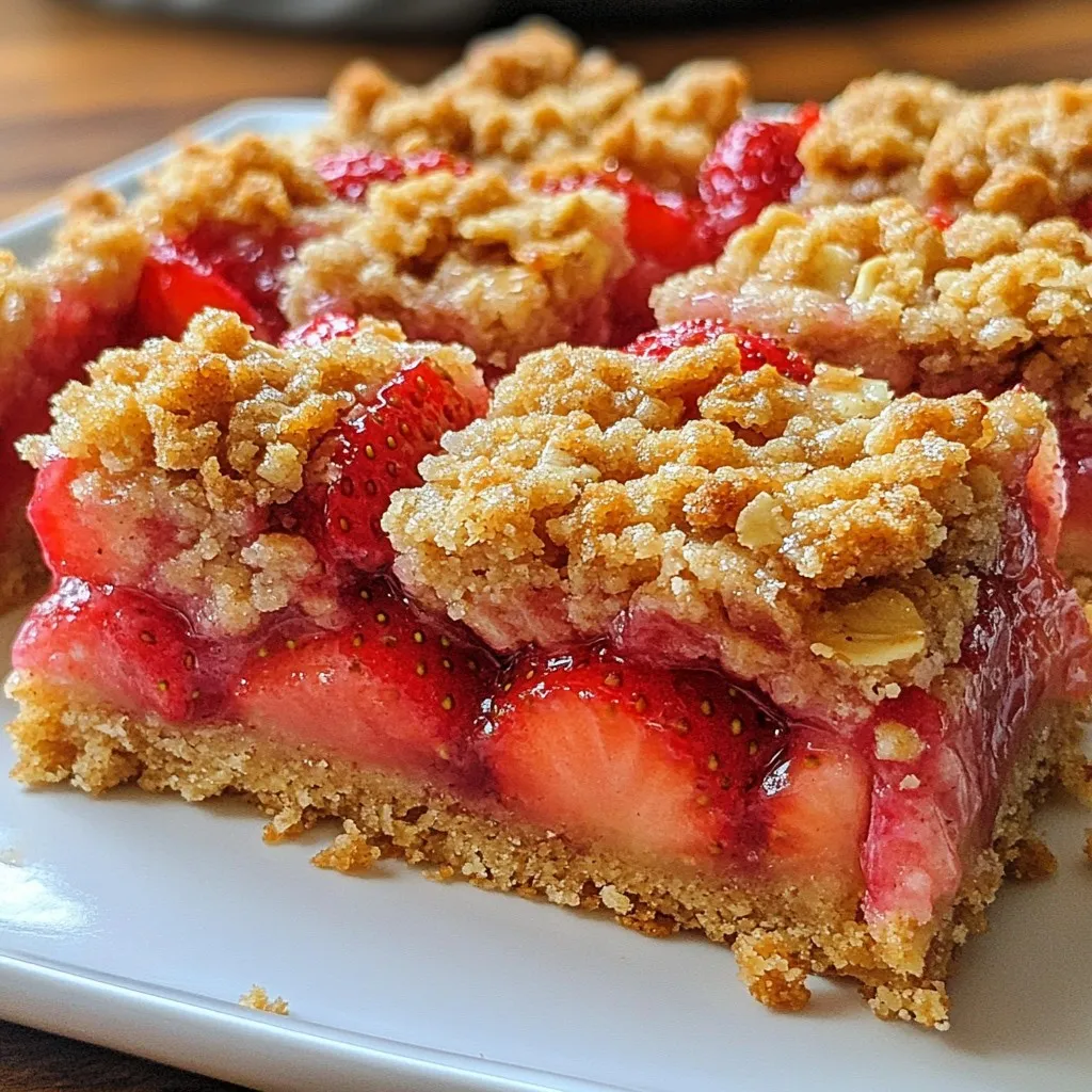 Delicious bars made with rolled oats, whole wheat flour, and fresh strawberries, perfect for a snack or dessert.