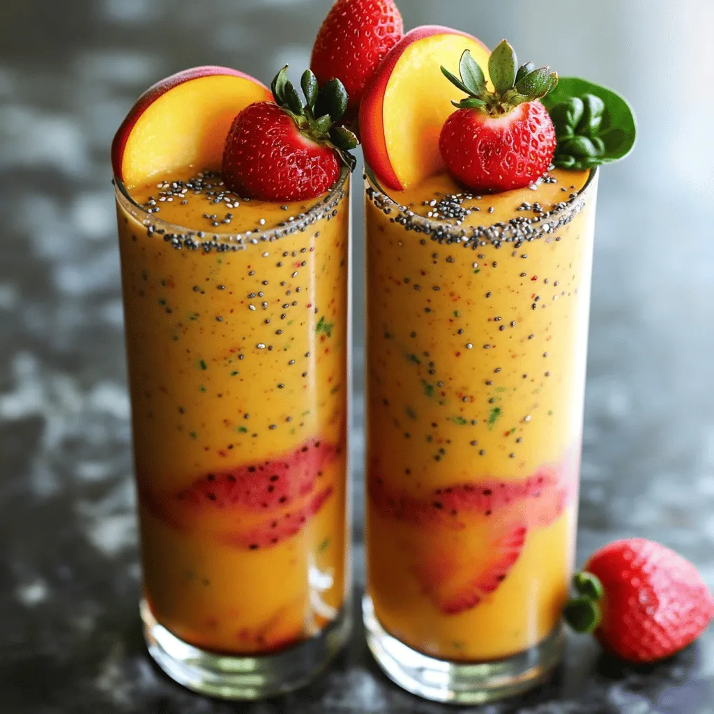 Pour the smoothie into tall glasses. You want it to look as good as it tastes. For a pretty touch, garnish with a slice of peach on the rim. Add a few whole strawberries on top for color. Drizzle some chia seeds over the smoothie for added texture and style. Enjoy this energizing and fresh treat!