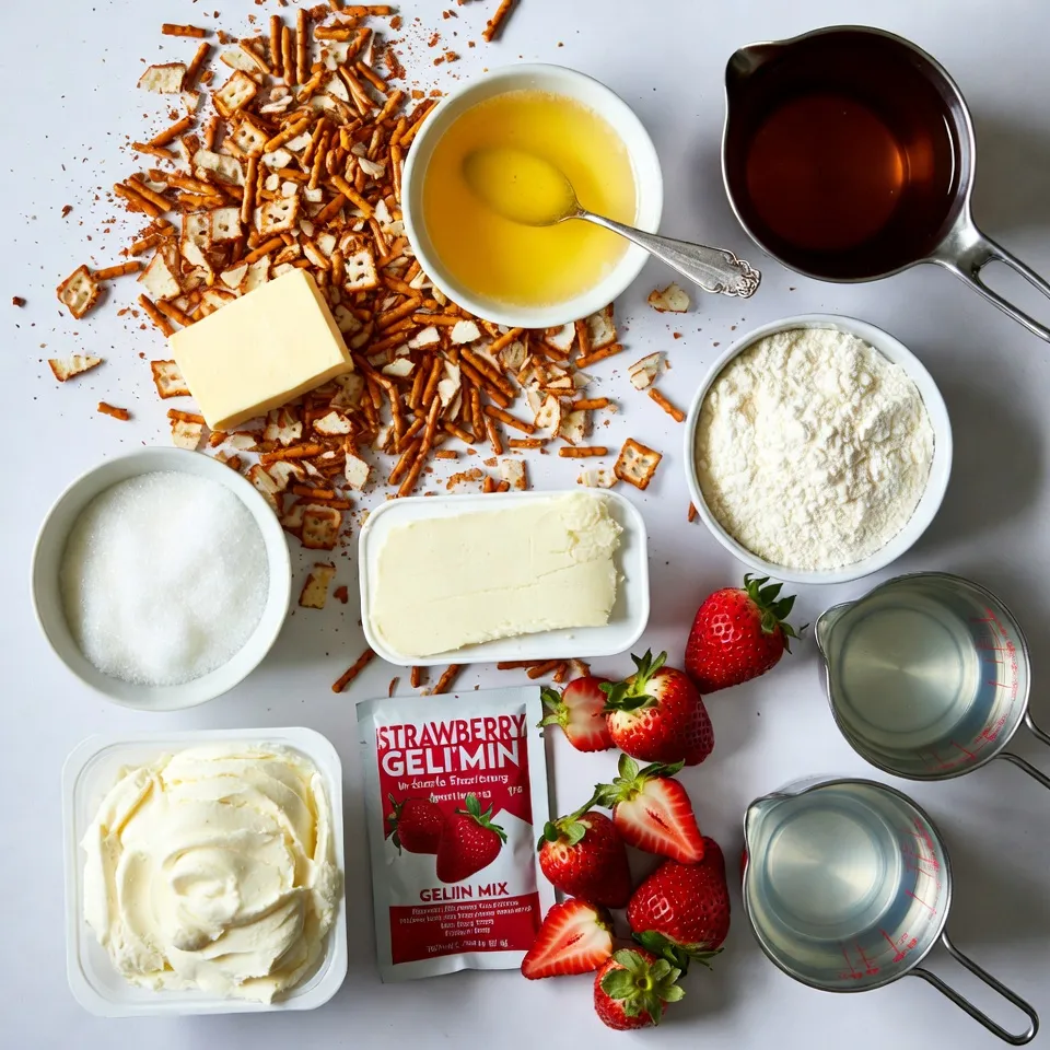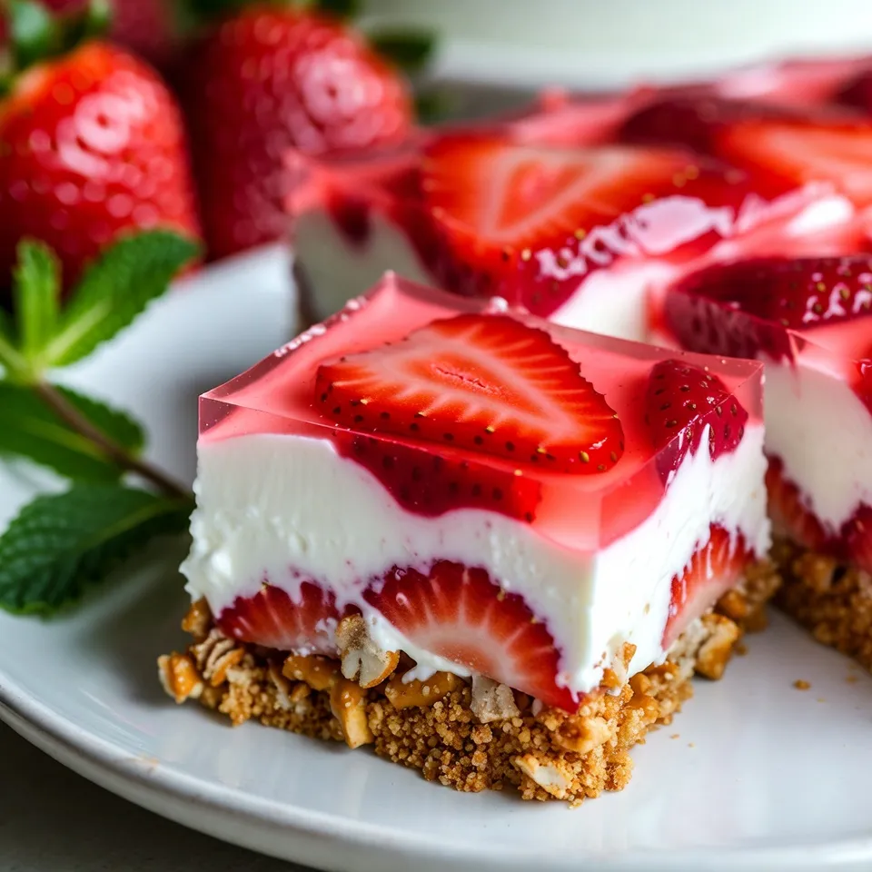 A delicious layered dessert featuring a salty pretzel crust, creamy cheese layer, and fresh strawberries in gelatin.