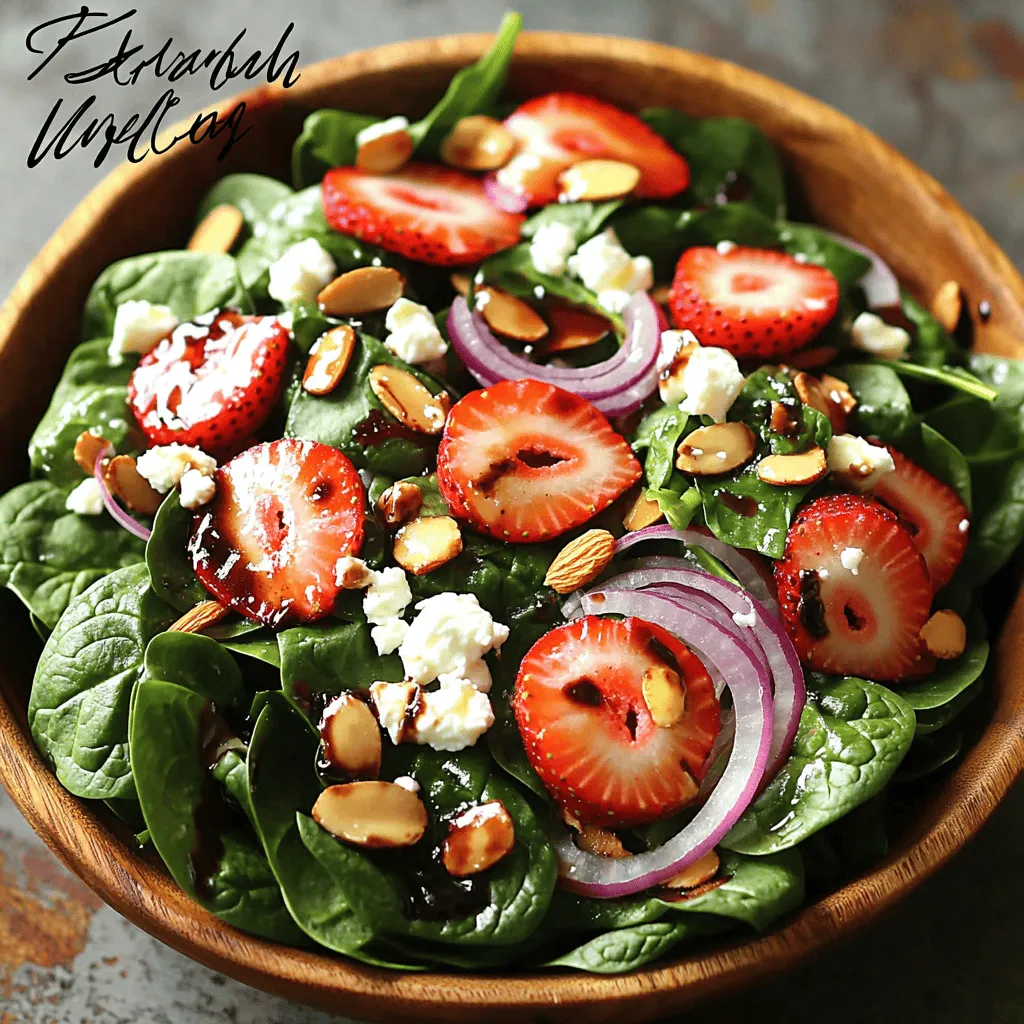 ![- Fresh spinach - Fresh strawberries Fresh spinach brings a crisp and healthy base to your salad. Use four cups, washed and dried. The spinach adds a lot of vitamins and minerals. Next, choose fresh strawberries. You will need about two cups, hulled and sliced. Strawberries add sweetness and a bright color. They balance the flavors nicely. - Feta cheese - Sliced almonds Cheese adds creaminess to the dish. Feta cheese works best here. Use half a cup, crumbled. It gives a nice tangy flavor. Now, let’s talk about nuts. Sliced almonds add crunch. Use a quarter cup, toasted for extra flavor. They boost the salad’s texture and nutrition. - Balsamic vinegar - Honey - Olive oil - Salt and pepper Next, we need dressing. Use balsamic vinegar, a quarter cup, for a sweet and tangy kick. Honey adds sweetness. Use three tablespoons. Olive oil adds richness. Use two tablespoons. Finally, season with salt and pepper to taste. Mix these ingredients well for a delicious dressing. For the full recipe and instructions, check out the [Full Recipe]. First, let's make the dressing. In a small bowl, add the balsamic vinegar, honey, olive oil, salt, and pepper. Use a whisk to mix everything together until it is smooth. This simple blend gives your salad a bright, tangy taste. Once combined, set the dressing aside. It will be ready when you need it. Now, it’s time to build your salad. In a large bowl, combine the fresh spinach, sliced strawberries, crumbled feta cheese, toasted almonds, and sliced red onion. Each ingredient adds its own flavor and texture. The spinach provides a crisp base, while strawberries add sweetness. Gently toss everything together. Be careful not to bruise the strawberries or break the feta. After tossing the salad, let it sit for about five minutes. This allows the flavors to meld together. For serving, you have options. You can plate the salad on individual dishes or offer it family-style in a large bowl. For a pretty touch, consider adding a few whole strawberries on top. This makes the salad look fresh and inviting. Enjoy your delicious creation! When you pick strawberries, look for ones that are bright red. They should feel firm but not hard. A sweet smell means they are ripe. Avoid ones with bruises or mold. Fresh spinach is the star of this salad. Always choose spinach that is vibrant and crisp. If you can, buy loose spinach instead of packaged. This way, you can check for freshness. If you want to make the salad ahead, store the dressing separately. This keeps the greens from wilting. You can mix the salad just before serving. It’s best to keep sliced strawberries in the fridge until serving. This prevents the salad from getting soggy. To make the salad even better, try adding fresh herbs like basil or mint. They give a nice twist to the taste. You can also play with different dressings. A citrus vinaigrette or yogurt dressing offers a fresh change. Experiment with what you like best to create your own version of this Strawberry Spinach Salad. For the full recipe, check out the Full Recipe section. {{image_2}} If you need gluten-free options, this salad works well. All the main ingredients are naturally gluten-free. However, check the labels on your balsamic vinegar and honey. They should be gluten-free too. For vegan alternatives, skip the feta cheese. You can use avocado or a vegan cheese instead. This keeps the salad creamy and delicious. You can play with different types of cheese. Try goat cheese for a tangy kick. Or use mozzarella for a mild flavor. If you want to swap nuts and seeds, consider walnuts or sunflower seeds. Both add a nice crunch and flavor to your salad. Try adding fruits like apples or pears. They give a sweet crunch that pairs well with spinach. Slice them thinly and mix them in. Incorporating other greens is a great idea too. You can add arugula or kale for a different taste. This adds more nutrients and texture to your salad. For the Full Recipe, check the earlier sections of this article. To keep your strawberry spinach salad fresh, store it in the fridge. Place leftovers in a sealed container. Glass or plastic containers work well. Keep the dressing separate if possible. This prevents the greens from wilting. When ready to eat, mix in the dressing just before serving. The salad lasts about three days in the fridge. Check the spinach and strawberries for spoilage. Look for slimy spinach or mushy strawberries. If you see these signs, it’s time to toss them. The feta cheese can last longer, up to a week. Always check for unusual smells or changes in color. You can get creative with leftover salad! Try mixing it into a wrap or sandwich. You can also add it to a grain bowl. Another fun idea is to make a smoothie. Blend the salad with some yogurt and a banana. This adds flavor and nutrition. Don't waste those tasty leftovers! To make this salad gluten-free, choose gluten-free dressings. Use balsamic vinegar that is labeled gluten-free. Most honey is gluten-free, but always check the label. You can also swap out feta cheese for a dairy-free cheese option if needed. Strawberry Spinach Salad is packed with nutrients. Spinach is rich in iron, vitamins A and C. Strawberries add fiber and antioxidants. Feta cheese gives calcium and protein. Almonds provide healthy fats. This salad supports heart health and boosts your immune system. Yes, you can prep this salad ahead of time. Store the dressing separately to avoid sogginess. Keep spinach, strawberries, and other ingredients in airtight containers. Mix everything just before serving. This keeps the salad fresh and crunchy. For the full recipe, check out the details above. This blog post covers how to make a delicious Strawberry Spinach Salad. We discussed key ingredients like fresh spinach, strawberries, feta cheese, and sliced almonds. I shared step-by-step instructions for creating the salad and tips to enhance its flavor. You can also explore variations, storage tips, and FAQs to address common questio