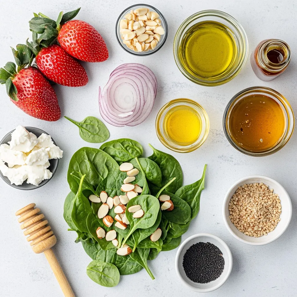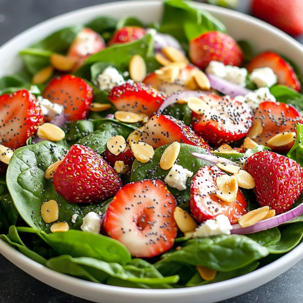 - 4 cups fresh baby spinach leaves - 2 cups strawberries, hulled and sliced - 1/2 cup red onion, thinly sliced I love using fresh baby spinach leaves for this salad. They are crisp and full of nutrients. Strawberries add a sweet burst, while red onion gives a nice crunch. Together, they create a colorful base that looks beautiful on any plate. - 1/4 cup olive oil - 2 tablespoons apple cider vinegar - 1 tablespoon honey - 1 teaspoon Dijon mustard - 1 tablespoon poppy seeds The dressing is simple yet flavorful. Olive oil brings richness. Apple cider vinegar adds brightness. Honey sweetens the mix, while Dijon mustard gives it a little kick. Poppy seeds add a fun texture and a lovely look. - 1/2 cup slivered almonds, toasted - 1/4 cup feta cheese, crumbled (optional) - Salt and pepper to taste Toasted slivered almonds add a crunchy finish. Feta cheese can give a creamy touch, but it's optional. A pinch of salt and pepper can enhance all these flavors. You can mix and match these toppings based on your taste. {{ingredient_image_1}} Start by adding 4 cups of fresh baby spinach leaves to a large bowl. Next, top the spinach with 2 cups of hulled and sliced strawberries. Then, add 1/2 cup of thinly sliced red onion. This mix gives you a bright and colorful base. Now, let’s toast the slivered almonds. Heat a small skillet over medium heat. Add 1/2 cup of slivered almonds. Stir them often for about 3-4 minutes until they turn golden brown. Once they are toasted, take them off the heat and let them cool. In a separate bowl, whisk together the dressing ingredients. You’ll need 1/4 cup of olive oil, 2 tablespoons of apple cider vinegar, 1 tablespoon of honey, and 1 teaspoon of Dijon mustard. Add 1 tablespoon of poppy seeds, and season with salt and pepper to taste. Whisk until everything is well mixed and smooth. Adjust the flavors if needed. If you want more sweetness, add a bit more honey. For a tangier kick, add more vinegar. Taste as you go to find what you enjoy best. Once your salad base and dressing are ready, it’s time to combine everything. Sprinkle the cooled toasted almonds over the salad. If you like, add 1/4 cup of crumbled feta cheese for extra flavor. Now, drizzle the poppyseed dressing over the salad. Toss gently to coat all the ingredients. You want everything to be well mixed without damaging the spinach or strawberries. Serve your salad right away for the best taste and freshness. Enjoy the delightful flavors! Serve your Strawberry Spinach Salad right after making it for the best taste. If you want to chill it, give it about 10-15 minutes in the fridge. This helps the flavors mix, but it can lose its crunch if it sits too long. For storage, keep leftovers in an airtight container. They stay fresh for about one day. After that, the spinach wilts, and the strawberries can get mushy. To hull and slice strawberries, first, remove the green tops. I use a small knife or a huller for this. Next, slice them into thin pieces. This way, they mix well in the salad and look nice. For the almonds, toasting them makes a big difference. Heat a skillet on medium. Add the slivered almonds and stir them for about 3-4 minutes. Watch closely; they can burn fast. When they turn golden brown, take them off the heat and let them cool. For a pretty presentation, serve the salad in a large, shallow bowl. Add extra strawberry halves on top. A sprinkle of poppy seeds adds a nice touch. Pair this salad with a light drink. A crisp white wine or sparkling water works well. They add a refreshing note that matches the salad's flavors. Pro Tips Use Fresh Ingredients: Always opt for fresh spinach and ripe strawberries to ensure the best flavor and texture in your salad. Toast Almonds for Extra Flavor: Toasting the slivered almonds enhances their nutty flavor, making your salad even more delicious. Chill Before Serving: Letting the salad chill for 10-15 minutes allows the flavors to meld beautifully, resulting in a tastier dish. Customize with Cheese: Feel free to swap feta for goat cheese or omit it entirely for a dairy-free option that still tastes great. {{image_2}} You can easily change up the flavors of your strawberry spinach salad. Adding seasonal fruits makes it exciting. Try mixing in fresh blueberries or crisp apple slices. These fruits add more color and taste. You can also swap spinach for other greens. Arugula offers a peppery kick. Kale gives a hearty crunch. Each green brings its own twist, making your salad unique. For a hearty meal, add protein to your salad. Grilled chicken or shrimp is a great choice. They add flavor and make the salad filling. If you prefer a vegan option, try chickpeas or tofu. Both options are rich in protein and easy to prepare. They soak up the dressing well, adding taste to every bite. While poppyseed dressing is a star, you can explore other flavors. A yogurt-based dressing adds creaminess and tang. It's a lighter option that pairs well with the salad. You can also experiment with different vinegars. Balsamic vinegar adds depth and sweetness. Rice vinegar gives a milder taste. Each dressing brings new life to your salad. To keep your salad fresh, store leftovers in an airtight container. This helps maintain the crispness of the spinach and strawberries. Aim to eat the salad within two days for the best taste. Do not mix the dressing with the salad until you are ready to serve. If you need to reheat any part of the salad, avoid heating the spinach or strawberries, as they will lose their texture. Instead, enjoy the salad cold or at room temperature. Different ingredients have different shelf lives: - Baby spinach: Lasts about 3-5 days in the fridge. - Strawberries: Keep for 3-7 days. Look for mold and discard any that are bad. - Red onion: Stays fresh for 1-2 weeks when stored properly. - Slivered almonds: Can last several months if kept in a cool, dry place. - Feta cheese: Generally lasts 5-7 days when stored correctly. To prolong freshness, keep spinach dry. Store st