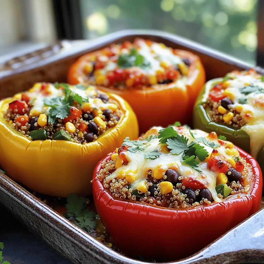 ![To make my favorite stuffed bell peppers, you will need: - 4 large bell peppers (any color) - 1 cup quinoa, rinsed - 2 cups vegetable broth - 1 can (15 oz) black beans, drained and rinsed - 1 cup corn (fresh or frozen) - 1 cup diced tomatoes (canned or fresh) - 1 small onion, finely chopped - 2 cloves garlic, minced - 1 teaspoon cumin - 1 teaspoon paprika - Salt and pepper to taste - 1 cup shredded cheese (cheddar, Monterey jack, or a blend) - Fresh cilantro for garnish (optional) Using fresh ingredients can boost the flavor of your dish. Fresh bell peppers bring crunch and sweetness. Fresh corn adds a sweet pop. However, canned options also work well. They save time and often taste great. Use canned tomatoes for ease. Just remember to rinse canned beans to reduce sodium. You can swap ingredients based on what you have. Use brown rice instead of quinoa for a different texture. If you don't have black beans, try kidney beans or lentils. For cheese, go dairy-free with a vegan option. Herbs like parsley or basil can replace cilantro if you prefer. Start by preheating your oven to 375°F (190°C). Grab four large bell peppers. You can choose any color you like. Cut the tops off these peppers and take out the seeds and membranes. This keeps the filling inside. Lightly brush the outsides with olive oil. Place them in a baking dish, standing tall and proud. Next, we need to cook the quinoa. In a medium pot, bring two cups of vegetable broth to a boil. Rinse one cup of quinoa in water to remove dirt. Add the rinsed quinoa to the boiling broth. Reduce the heat to low, cover the pot, and let it simmer for about 15 minutes. The quinoa will be fluffy and all the liquid will be gone when done. While the quinoa cooks, let’s make the filling. Heat a drizzle of olive oil in a large skillet over medium heat. Add one small, finely chopped onion and two minced garlic cloves. Sauté for about 3 to 4 minutes until the onion turns soft and clear. Then, add one can of drained black beans, one cup of corn, and one cup of diced tomatoes. Mix in one teaspoon of cumin and one teaspoon of paprika. Stir everything well and let it cook for about 5 minutes. Season with salt and pepper to make it tasty. Once the quinoa is ready, fold it into this mixture. Remove the skillet from heat and add half of the shredded cheese. Now, stuff each bell pepper with this delicious filling. Press down gently to fit as much as you can. Top the stuffed peppers with the rest of the cheese. Cover the baking dish with aluminum foil and bake for 25 minutes. Take off the foil and bake for another 10 minutes until the cheese is bubbly and golden. When they’re done, let the peppers cool for a few minutes before you dig in! For a nice touch, sprinkle fresh cilantro on top if you like. For the full recipe, refer to the provided details above. To make your stuffed bell peppers stand out, spices are key. I love using cumin and paprika. They add warmth and depth. You can also try chili powder for a kick. Don't be shy! Mix and match spices to find your perfect blend. Remember, fresh spices are more potent. Invest in good quality ones for the best taste. Even cooking is important for great stuffed peppers. Make sure to cut the tops off the peppers evenly. This helps them cook well. A quick tip: parboil the peppers for five minutes before stuffing. This softens them and speeds up the cooking process. You want them tender but not mushy. Cheese adds creaminess and flavor to your dish. I recommend using cheddar or Monterey Jack. They melt beautifully and bring richness. For a twist, try feta or goat cheese for a tangy taste. Always sprinkle some cheese on top before baking. This gives a nice golden crust. Enjoy experimenting with different cheeses! For more details, check the [Full Recipe]. {{image_2}} To make vegan stuffed bell peppers, you can easily swap the cheese. Use a vegan cheese or skip it altogether. The filling still tastes amazing! You can also add more veggies like zucchini or mushrooms for added texture. This way, you keep it plant-based and still delicious. The filling can change based on what you have. You can try lentils in place of black beans. Chickpeas add a nice crunch too. If you want a Mediterranean twist, use feta cheese and olives. For a Mexican flair, add salsa and jalapeños. The options are endless! Do you like heat? You can adjust the spice level easily. Add diced jalapeños or a pinch of cayenne pepper to the mix. If you prefer milder flavors, reduce the spices. You can also serve with hot sauce on the side. Each bite can be customized to your taste! For the complete recipe, check out the Full Recipe section above. Enjoy experimenting with these variations! After cooking your stuffed bell peppers, let them cool completely. Place them in an airtight container. Store in the fridge for up to 4 days. This keeps them fresh and tasty. You can freeze stuffed peppers for later. Wrap each pepper tightly in plastic wrap. Place them in a freezer-safe bag or container. They can last up to 3 months in the freezer. Just remember to label them with the date! To reheat, take the stuffed peppers out of the fridge or freezer. If frozen, thaw them overnight in the fridge. Preheat your oven to 350°F (175°C). Place the peppers in a baking dish. Cover with foil to keep them moist. Heat for about 20-25 minutes. If you want crispy cheese, take off the foil for the last 5 minutes. Enjoy your meal again! For the full recipe, check out the details above. Yes, you can prepare stuffed bell peppers ahead of time. You can make the filling and stuff the peppers a day before. Store them in the fridge. When ready to eat, just bake them. They will taste fresh and delicious. Stuffed bell peppers pair well with many side dishes. Here are some great options: - A simple green salad with lemon vinaigrette - Garlic bread for a crunchy side - Steamed vegetables like broccoli or green beans - A side of rice or quinoa for extra fiber These sides enhance the m