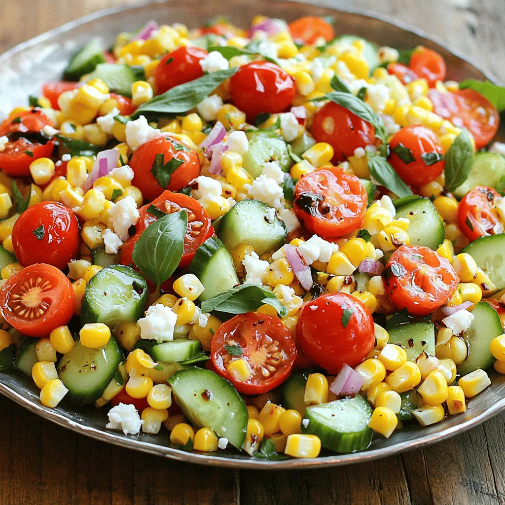 Gathering fresh ingredients is key to this salad’s success. The corn should be sweet, the tomatoes ripe, and the basil fragrant. Each element adds a unique flavor and texture, making the salad vibrant and delicious. You can find fresh corn in local markets during summer. Cherry tomatoes burst with sweetness, while cucumber adds crunch. Red onion gives a mild bite, and fresh basil ties it all together. Don’t forget the feta for a creamy finish.
