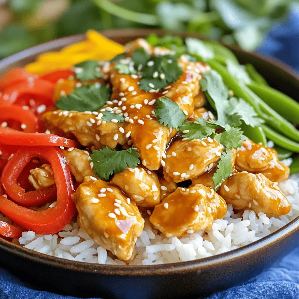 To make a delicious Sweet Chili Chicken Bowl, you will need: - 2 boneless, skinless chicken breasts, diced - 1 cup jasmine rice - 1 cup chicken broth - 1 red bell pepper, sliced - 1 cup snap peas - 1 tablespoon vegetable oil - 1/4 cup sweet chili sauce - 2 tablespoons soy sauce - 1 teaspoon fresh ginger, minced - 1 clove garlic, minced - Salt and pepper to taste - Sesame seeds for garnish - Fresh cilantro for garnish You can change the flavors or add more color. Here are some ideas: - Use brown rice or quinoa for a whole grain option. - Add broccoli, carrots, or bok choy for more veggies. - Swap sweet chili sauce with teriyaki sauce for a different taste. - Top with sliced green onions for a fresh crunch. - Add crushed peanuts for extra texture. If you don't have some ingredients, don't worry! Here are some swaps: - Chicken can be replaced with shrimp or tofu for a different protein. - You can use vegetable broth instead of chicken broth. - Red bell pepper can be swapped with yellow or green bell pepper. - Use garlic powder if you don't have fresh garlic. - Maple syrup or honey can replace sweet chili sauce in a pinch. With these ingredients and options, you can make your Sweet Chili Chicken Bowl just right for you! If you're ready to get cooking, check out the Full Recipe for detailed steps. First, rinse the jasmine rice. Use cold water until it runs clear. In a medium pot, boil the chicken broth. Once boiling, add the rice. Turn the heat low and cover the pot. Let it simmer for 15 minutes. The rice will absorb all the liquid. After that, remove it from heat. Let it rest for 5 more minutes. Fluff the rice with a fork before serving. Next, take a large skillet. Heat the vegetable oil over medium-high heat. Add your diced chicken to the skillet. Sprinkle salt and pepper on top. Cook the chicken for 5 to 7 minutes. It should turn golden brown and be fully cooked. Make sure to stir it often for even cooking. Now, add the sliced red bell pepper and snap peas. Stir-fry them with the chicken for about 3 to 4 minutes. You want the veggies to be tender-crisp. In a small bowl, mix the sweet chili sauce, soy sauce, minced ginger, and minced garlic. Pour this mix over the chicken and veggies. Cook for another 2 to 3 minutes. Stir everything well so it gets coated with the sauce. To serve, grab a bowl. Put a generous scoop of jasmine rice in the bottom. Top it with your sweet chili chicken and veggies. For a finishing touch, sprinkle sesame seeds and fresh cilantro on top. This adds a nice crunch and extra flavor. Enjoy your colorful and tasty meal! You can find the Full Recipe for more details. To make sure your chicken is juicy, cut it into small, even pieces. This helps it cook faster and more evenly. Heat your skillet on medium-high heat before adding the chicken. Cook it until it turns golden brown. This usually takes about 5 to 7 minutes. Always check if the chicken is cooked through by cutting a piece. It should be white and not pink inside. Keep vegetables crisp by adding them later in the cooking process. Sauté them for just 3 to 4 minutes. This keeps their bright color and crunch. Stir them gently so they cook evenly. If you see them getting too soft, take them off the heat right away. This way, your sweet chili chicken bowl will have a nice mix of textures. When serving, use a large bowl. Start with a scoop of jasmine rice at the bottom. Then, pile on the sweet chili chicken and veggies. This makes a nice contrast of colors. For a finishing touch, sprinkle sesame seeds and fresh cilantro on top. It not only looks great but adds extra flavor. Remember, a well-presented dish makes it more enjoyable! Feel free to check the Full Recipe for all the steps. {{image_2}} You can switch up the chicken in your bowl. Try shrimp or tofu as great options. They cook quickly and soak up that sweet chili sauce. For beef lovers, diced beef works well too. Just make sure to cook it until it’s tender. Each protein brings a new flavor, making the meal exciting. If you want a meatless option, use chickpeas or edamame. Both add protein and a nice texture. You can also use mushrooms for a hearty touch. They absorb flavors well and become savory when cooked. Add in some extra vegetables like carrots or zucchini for more color and crunch. To change the taste, think about adding spices. A pinch of cayenne can add heat if you like spice. You could also use lime juice for a zesty finish. Fresh herbs like basil or mint can brighten the dish too. Don’t forget to play with the sauces; a bit of hoisin or teriyaki can add a unique twist. The possibilities are endless, so feel free to get creative! To store your sweet chili chicken bowl, let it cool first. Place the chicken, rice, and veggies in an airtight container. Keep it in the fridge. This way, it stays fresh for later meals. When you're ready to eat, take out the leftovers. You can reheat them in a microwave or on the stove. If using a microwave, cover it to keep moisture in. Heat for one to two minutes, checking often. On the stove, add a splash of water to keep it moist. Heat it over medium heat until warm. Your sweet chili chicken bowl lasts about 3-4 days in the fridge. If you want to keep it longer, freeze it. Use a freezer-safe container or bag. It can last up to three months in the freezer. To enjoy later, thaw it in the fridge overnight before reheating. This keeps the flavors intact. You can serve the Sweet Chili Chicken Bowl with a side salad. A fresh cucumber salad works well. You might also add some spring rolls for a tasty crunch. Steamed broccoli or bok choy complements the bowl nicely too. The sweet chili sauce has a mild heat. It combines sweetness with a touch of spice. Many find it easy to enjoy, even kids. If you like it spicier, you can add chili flakes or sriracha. Yes! To make a low-carb version, swap out the rice. You can use cauliflower rice instead. It gives you that rice texture with fewer carbs. Add more veggies like zucchini or bell 