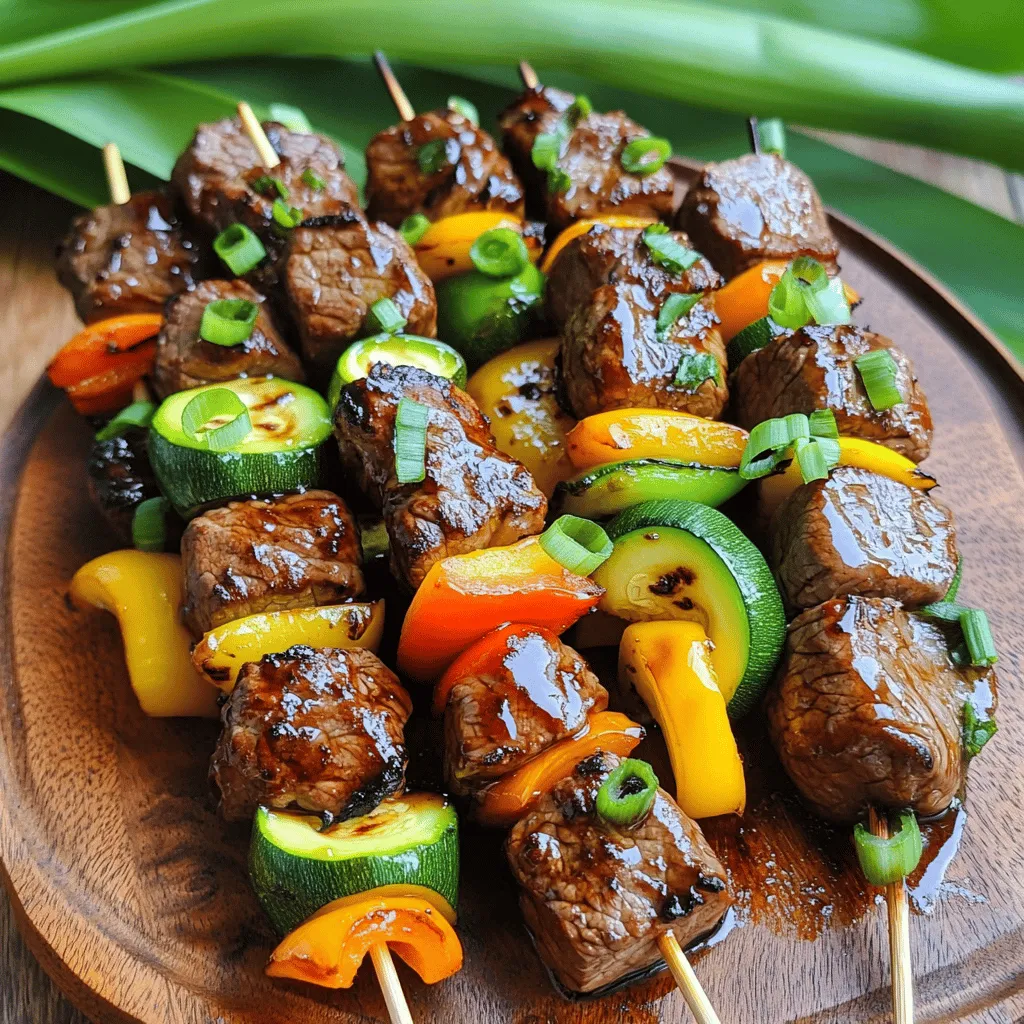 - 1 lb beef sirloin, cut into 1-inch cubes - 1/4 cup soy sauce - 1/4 cup honey - 2 tablespoons rice vinegar - 2 cloves garlic, minced - 1 tablespoon fresh ginger, grated - 1 tablespoon sesame oil - 1 teaspoon red pepper flakes (optional for spice) - 2 green onions, chopped - 1 bell pepper, cut into chunks - 1 zucchini, sliced into rounds When making teriyaki beef skewers, beef sirloin is a great choice. It’s tender and flavorful. Cut it into 1-inch cubes to ensure even cooking. A good marinade makes all the difference. You need soy sauce for saltiness, honey for sweetness, and rice vinegar for tang. Garlic and ginger add depth. Sesame oil gives that nutty taste, and red pepper flakes can add some heat. Don’t forget the veggies! Bell peppers and zucchini work well. They add color and crunch. Chopped green onions also bring a fresh taste that balances the rich beef. - Skewers (wooden or metal) - Mixing bowl and whisk - Grill or grill pan To cook the skewers, you’ll need skewers. Wooden or metal both work fine. If you use wooden skewers, soak them in water to stop burning. A mixing bowl and whisk help mix the marinade well. Finally, a grill or grill pan is needed to cook the skewers. Grilling gives them a nice char and smoky flavor. You can find the full recipe to get started on these juicy and flavorful teriyaki beef skewers. Start by mixing the marinade ingredients. In a bowl, combine: - 1/4 cup soy sauce - 1/4 cup honey - 2 tablespoons rice vinegar - 2 cloves garlic, minced - 1 tablespoon fresh ginger, grated - 1 tablespoon sesame oil - 1 teaspoon red pepper flakes (optional) Whisk these together until smooth. This marinade gives the beef its sweet and salty flavor. Letting the beef soak in the marinade adds depth. Marinate the beef for at least 30 minutes. If you can wait, let it sit overnight. This extra time brings out more flavor. Coat the beef with the marinade thoroughly. You want every piece to soak up the goodness. Place the cubed beef into the bowl with the marinade. Use a spoon or your hands to mix it well. Make sure all sides are covered. For the best taste, marinate for at least 30 minutes. If time allows, marinate overnight in the fridge. This will help the beef become tender and flavorful. Preheat your grill or grill pan over medium-high heat. If you use wooden skewers, soak them in water for 30 minutes. This step prevents burning. Prepare your skewers by threading the marinated beef, bell pepper chunks, zucchini slices, and green onion pieces. Alternate the colors for a vibrant look. Cook the skewers for about 10-12 minutes. Turn them occasionally to get even cooking. Check the beef for your desired doneness. Once done, let the skewers rest for a few minutes. Drizzle any leftover marinade over them for extra flavor. To make the best teriyaki beef skewers, avoid overcooking the beef. Cook the beef for 10-12 minutes on medium-high heat. Use a meat thermometer to check for doneness. Aim for 135°F for medium-rare and 145°F for medium. Let the skewers rest for a few minutes after cooking. This keeps the juices inside. For even cooking of vegetables, cut them into similar sizes. Use bell pepper chunks and zucchini rounds that match the beef cubes. Arrange the veggies and beef on skewers alternately for a colorful look. This helps them cook at the same rate. You can add more flavor to your teriyaki marinade. Consider these simple add-ins: - Spices: Try a pinch of black pepper or a dash of cumin. - Herbs: Fresh cilantro or basil can brighten the dish. For presentation, serve the skewers on a wooden platter. You can line it with banana leaves for a tropical feel. Adding a bowl of extra teriyaki sauce for dipping is a great touch. It makes each bite even more flavorful. For the full recipe, visit the detailed section above. Enjoy your cooking! {{image_2}} You can easily swap out beef for chicken or tofu. Chicken works great in this dish. Tofu adds a fun twist for a vegetarian option. For vegetables, try using cherry tomatoes, mushrooms, or bell peppers. Mix and match your favorites to create a colorful skewer. Explore different sauces for a unique taste. You can use hoisin sauce or teriyaki glaze instead of regular teriyaki. If you like heat, add more red pepper flakes. You can play with spice levels until you find your perfect balance. These small changes can really enhance your meal! For storing your teriyaki beef skewers, use an airtight container. Glass or plastic containers work well. They keep your food fresh and prevent odors. Place the skewers in the fridge right after they cool. Aim to eat them within three days for the best taste. The best way to reheat skewers is in the oven. Preheat it to 350°F (175°C). Place the skewers on a baking sheet. Heat for about 10 minutes. You can also use a skillet on medium heat. This keeps the meat juicy. Avoid microwaving, as it can make the beef tough. Always check the temperature to ensure even heating. Enjoy your flavorful meal with every bite! To check if your beef is cooked, use a meat thermometer. - Medium-rare: 135°F - Medium: 145°F - Medium-well: 150°F - Well-done: 160°F Check the thickest part of the meat. If you don’t have a thermometer, cut into the beef. It should be warm and slightly pink in the center for medium. Cooking times can vary based on your heat level and beef size. Yes, you can prepare the skewers ahead of time. For best results, marinate the beef the night before. - Mix your marinade and coat the beef. - Cover and refrigerate for at least 30 minutes or overnight. You can also pre-thread the skewers. Just keep them in the fridge until you're ready to cook. This saves time and helps the flavors blend well. For a great meal, you can serve several sides with teriyaki beef skewers. Here are a few ideas: - Steamed rice or jasmine rice - Grilled vegetables like asparagus or corn - Fresh salad with a light dressing - Noodles tossed with sesame oil These sides add color and flavor to your plate, balancing the