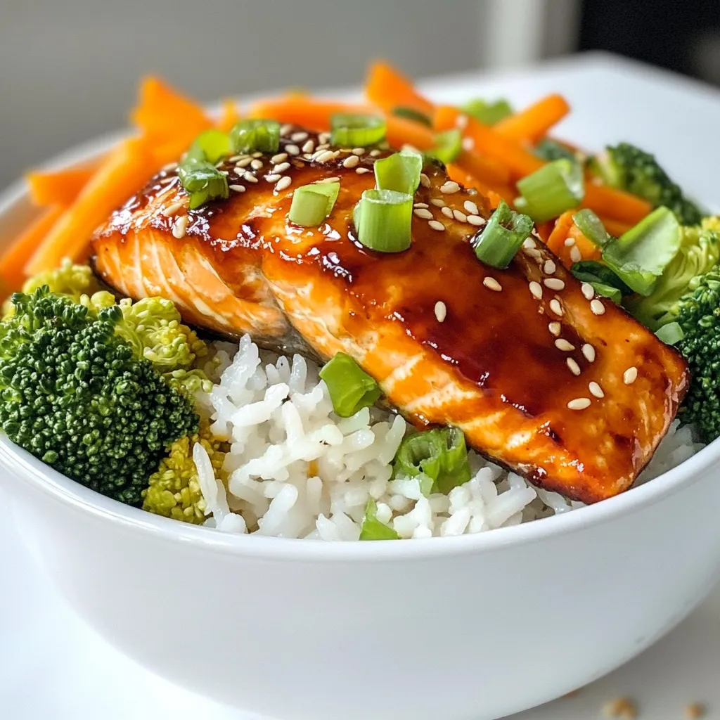 To make Teriyaki Salmon Rice Bowls, you'll need the following fresh and simple ingredients: - 2 salmon fillets - 1 cup jasmine rice - 1/4 cup low-sodium soy sauce - 2 tablespoons honey - 1 tablespoon rice vinegar - 1 teaspoon minced ginger - 1 clove garlic, minced - 1 tablespoon sesame oil - 1 cup broccoli florets - 1 carrot, julienned - 2 green onions, sliced - Sesame seeds for garnish - Salt and pepper to taste Each ingredient plays a role in building flavor and texture. Salmon is rich and flaky after cooking. Jasmine rice adds a light, fragrant base. The teriyaki sauce, made with soy sauce, honey, ginger, and garlic, brings sweetness and depth. For the veggies, I choose broccoli and carrots for color and crunch. Sliced green onions and sesame seeds add a fresh finish. You can also customize the ingredients to your taste. Let’s gather these items before we start cooking! {{ingredient_image_1}} Start by rinsing the jasmine rice in cold water. Rinse until the water runs clear. Then, place the rice in a medium saucepan. Add one cup of water to the rice. Bring it to a boil over high heat. Once boiling, reduce the heat to low. Cover the pot and let it simmer for about 15 minutes. After 15 minutes, check the rice. It should be tender, and the water should be absorbed. While the rice cooks, make the teriyaki sauce. Grab a small saucepan and place it over medium heat. Add the low-sodium soy sauce, honey, rice vinegar, minced ginger, and minced garlic. Stir the mixture for about 2-3 minutes. Heat it until it's warm and slightly thickened. Once done, remove it from the heat and set it aside. Now, heat a skillet over medium-high heat and add the sesame oil. Season the salmon fillets with salt and pepper on both sides. When the oil is hot, place the salmon skin-side down in the skillet. Cook for 4-5 minutes until the skin is crispy. Carefully flip the salmon over. Brush the top with the teriyaki sauce. Cook for another 3-4 minutes until the salmon is cooked through and flakes easily with a fork. In the same skillet with the salmon, add the broccoli florets and julienned carrot. Stir the vegetables for about 2-3 minutes. They should be tender but still bright in color. Drizzle a bit of the reserved teriyaki sauce over the veggies for extra flavor. To put it all together, divide the cooked jasmine rice between two bowls. Top each bowl with a salmon fillet. Add the sautéed vegetables on the side. Drizzle a generous amount of teriyaki sauce over everything. Finally, garnish with sliced green onions and a sprinkle of sesame seeds before serving. Enjoy your delicious teriyaki salmon rice bowls! To get crispy salmon skin, start with dry skin. Pat the salmon with paper towels. Heat your skillet until it's hot, then add sesame oil. Place the salmon skin-side down. Press it gently with a spatula for even cooking. Cook for about 4-5 minutes without moving it. This helps the skin crisp up nicely. Flip it carefully to finish cooking. Brush some teriyaki sauce on top for flavor. Rinsing jasmine rice is key for fluffy grains. Use cold water and rinse until clear. This removes excess starch. Combine one cup of rinsed rice with one cup of water in a saucepan. Bring it to a boil, then lower the heat. Cover it tightly and let it simmer for 15 minutes. Turn off the heat and let it sit for another 5 minutes. Fluff the rice with a fork before serving. Making teriyaki sauce is simple and quick. In a small saucepan, mix low-sodium soy sauce, honey, rice vinegar, minced ginger, and garlic. Heat it on medium for 2-3 minutes. Stir it until it thickens slightly. Remove it from the heat and let it cool. This sauce adds a sweet and savory kick to your salmon. You can also save some for drizzling over your veggies. Pro Tips Freshness Matters: Always opt for fresh salmon fillets for the best flavor and texture. Frozen salmon can be a good alternative but make sure it's properly thawed before cooking. Perfectly Cooked Rice: Rinse the jasmine rice thoroughly to remove excess starch. This helps achieve fluffy rice rather than sticky clumps. Vegetable Variety: Feel free to customize the vegetables in the bowl. Bell peppers, snap peas, or bok choy also pair well with teriyaki salmon. Teriyaki Sauce Tip: For a thicker teriyaki sauce, you can add a cornstarch slurry (1 tsp cornstarch mixed with 1 tbsp water) to the sauce while heating it. {{image_2}} If you want to switch things up, try other proteins. Chicken breast is a great choice. It cooks quickly and absorbs flavors well. Tofu is another option. It’s a fantastic plant-based protein. Just marinate it in teriyaki sauce before cooking. Shrimp also works. They cook fast and add a nice touch. Feel free to mix different veggies in your rice bowl. Bell peppers add sweet crunch and color. Snap peas bring a fresh, crisp taste. Zucchini is light and cooks quickly. You can also toss in mushrooms for an earthy flavor. The key is to keep them vibrant and tender. Want a gluten-free teriyaki sauce? Use tamari instead of soy sauce. Tamari has a similar taste and is wheat-free. You can also opt for coconut aminos. This option is sweeter and lower in sodium. Both choices keep your dish tasty and gluten-free. To store leftover rice bowls, first let them cool. Place the rice, salmon, and veggies in an airtight container. Make sure to separate the salmon from the rice if possible. This helps keep the salmon fresh longer. Store the container in the fridge for up to three days. When you’re ready to eat the leftovers, reheat them in the microwave. Place the rice bowl in a microwave-safe dish. Cover it with a damp paper towel to keep moisture in. Heat in 30-second bursts until warm. Stir between each burst to ensure even heating. You can also reheat on the stovetop. Heat a skillet over medium heat and add a splash of water. Add the rice bowl and stir frequently until heated through. If you want to freeze the rice bowls, do it before adding the garnishes. Freeze the salmon, rice, and veggies separa