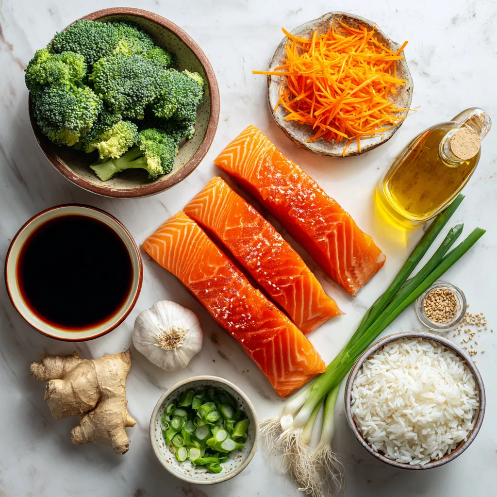 Each ingredient plays a role in building flavor and texture. Salmon is rich and flaky after cooking. Jasmine rice adds a light, fragrant base. The teriyaki sauce, made with soy sauce, honey, ginger, and garlic, brings sweetness and depth.