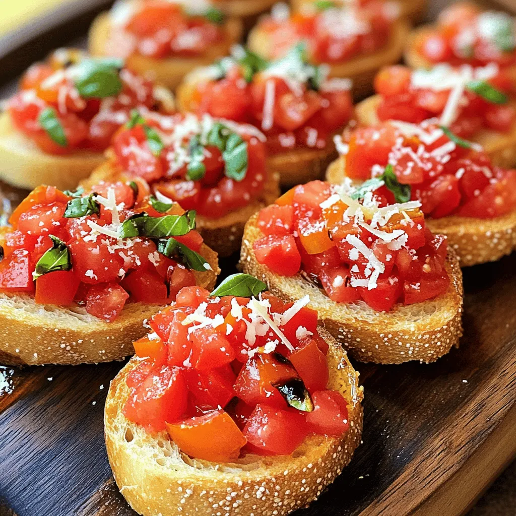 Serving style matters. Arrange your bruschetta on a large platter. Layer them in rows for a clean look. Garnish with whole basil leaves for color. A sprinkle of Parmesan on top adds elegance. For an extra touch, serve with a small bowl of balsamic vinegar. This lets guests drizzle more on their bruschetta. A beautiful presentation makes the dish even more appealing.