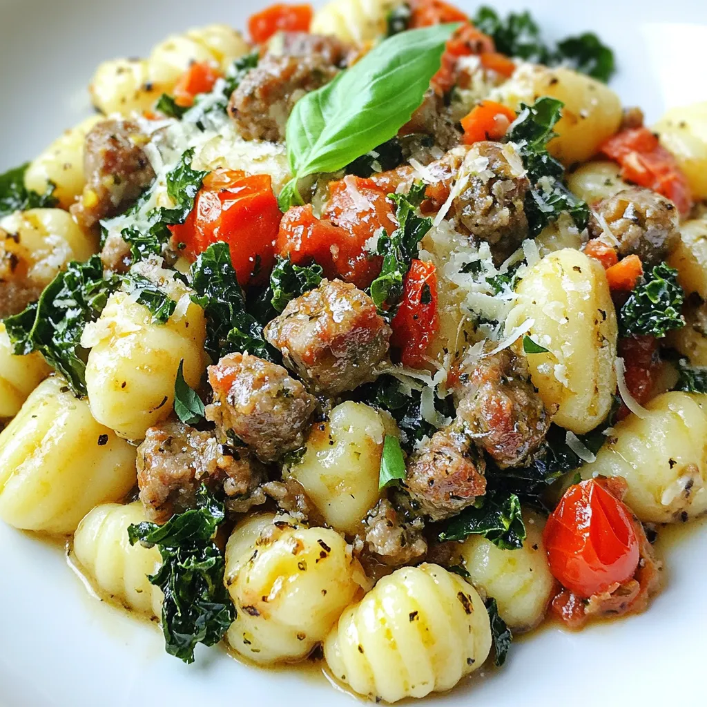 A hearty and flavorful dish featuring potato gnocchi, Italian sausage, and fresh greens in a creamy tomato sauce.