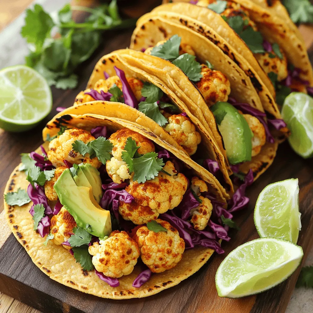 - Cauliflower florets - Corn tortillas - Seasonings (smoked paprika, cumin, garlic powder, onion powder) The main star of this dish is the cauliflower. I like to use a medium head, cut into small florets. Cauliflower soaks up flavors well. It becomes tasty when roasted. Next, I use small corn tortillas. They add a nice texture and flavor. The seasonings bring everything together. I use smoked paprika for a hint of smokiness. Cumin adds warmth. Garlic powder and onion powder enhance the flavor, making it rich and savory. - Red cabbage - Avocado - Fresh cilantro - Lime wedges Adding fresh toppings makes the tacos shine. I choose red cabbage for its crunch and color. Sliced avocado gives creaminess. Fresh cilantro adds brightness. I always serve lime wedges on the side. The lime juice adds a zesty kick that brightens the dish. - Vegan sour cream or yogurt For extra creaminess, I suggest vegan sour cream or yogurt. It adds a rich layer of flavor. While optional, it takes these tacos to another level. You can easily find vegan options at most stores. Check the Full Recipe for all the details and measurements. Set your oven to 425°F (220°C). This high temperature helps the cauliflower roast well. It will get crispy and golden, which adds great flavor. In a large bowl, toss the cauliflower florets with olive oil and spices. Use smoked paprika, cumin, garlic powder, onion powder, salt, and pepper. Mix until the florets are well coated. This step is key for tasty tacos. Spread the seasoned cauliflower in a single layer on a baking sheet. Roast it in the oven for 25-30 minutes. Flip the cauliflower halfway through for even cooking. You know it's done when it’s golden and tender. While the cauliflower roasts, warm the corn tortillas. Place them in a pan over medium heat. Heat each side for about 30 seconds. This makes them soft and easy to fold. Once the cauliflower is ready, it’s time to build your tacos. Start with a generous amount of roasted cauliflower in the center of each tortilla. Add toppings like shredded red cabbage, avocado slices, and fresh cilantro. Serve it all with lime wedges on the side. Drizzle with vegan sour cream if you like. Enjoy this delicious meal! For the full recipe, check out the Vegan Cauliflower Tacos section. To enhance the flavor of your vegan cauliflower tacos, use fresh spices. Fresh spices bring out the best taste. They add depth and warmth that dried spices can't match. I recommend buying whole spices and grinding them yourself. This keeps their oils intact, making them more fragrant. Try using smoked paprika and cumin as your main flavors. These spices pair well with the roasted cauliflower. Knowing when your cauliflower is done is key. Roast it until it's golden brown and tender. This usually takes about 25 to 30 minutes at 425°F (220°C). Halfway through roasting, flip the cauliflower. This helps it cook evenly and get crispy on all sides. Look for a fork to slide in easily when checking for doneness. Warming your tortillas properly makes a big difference. Heat them in a pan over medium heat. It takes about 30 seconds on each side. This makes them soft and pliable. You can also wrap them in a damp paper towel and microwave them for 15 seconds. Both methods work well. Just pick the one that fits your time best. For the full recipe, check the link provided. {{image_2}} You can change up the filling in your tacos. Try using beans or lentils instead of cauliflower. Black beans add a rich taste. They are also full of protein and fiber. Lentils are another great option. They cook quickly and absorb flavors well. You can use cooked chickpeas too. They give a nice texture and are very filling. Don't be afraid to experiment with spices or sauces. You can add chili powder for heat. Or mix in some curry powder for a unique twist. Try adding fresh herbs like basil or mint for bright notes. Sauces can elevate your tacos. A drizzle of tahini or a spicy salsa can make a big difference. Even a squeeze of fresh orange juice can change the flavor profile. The type of tortilla you use can change your tacos. Corn tortillas are traditional and gluten-free. They have a nice flavor that pairs well with cauliflower. If you prefer, try flour tortillas. They are soft but may contain gluten. You can also find gluten-free options made from almond or coconut flour. These can add a different taste and texture to your tacos. Enjoy experimenting with what works best for you! To store leftover vegan cauliflower tacos, place them in an airtight container. Make sure to separate the tortillas from the filling to keep them fresh. Refrigerate your tacos within two hours of cooking. They will stay good for about three to four days. For best quality, avoid stacking the tacos too high to prevent squishing. When you’re ready to eat your leftovers, reheat the cauliflower in the oven. Preheat it to 350°F (175°C). Spread the cauliflower on a baking sheet and heat for about 10 minutes. This keeps the cauliflower crispy. For tortillas, warm them in a dry pan on medium heat for about 30 seconds on each side. This helps maintain their texture and flavor. To freeze your taco components, first let everything cool completely. Place the roasted cauliflower in a freezer-safe bag, removing as much air as possible. Wrap the tortillas in foil or wax paper and put them in a separate bag. You can freeze them for up to three months. When you're ready to eat, thaw them in the fridge overnight before reheating. This method keeps your meal fresh and tasty. For the full recipe and more tips, check out the [Full Recipe]. You can easily swap out regular tortillas for gluten-free options. Look for corn tortillas, as they are naturally gluten-free. You can also find brands that offer gluten-free flour tortillas made from rice or almond flour. Check the labels to ensure they meet your dietary needs. Yes, you can prep the cauliflower in advance. Chop the florets and store them in an airtight container in the fridge f
