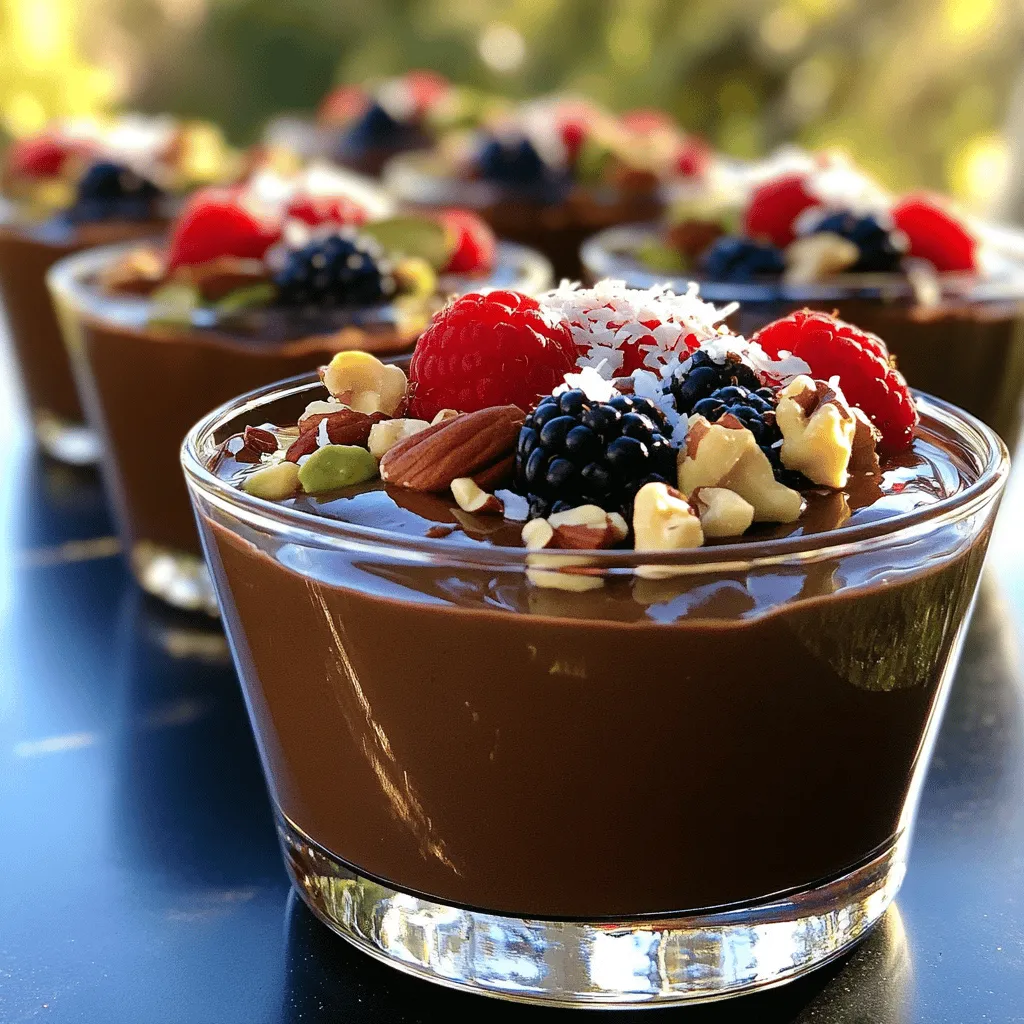 To make this vegan chocolate avocado pudding, you need a few simple ingredients. Here is the list: - 2 ripe avocados - 1/2 cup unsweetened cocoa powder - 1/2 cup maple syrup - 1/4 cup almond milk - 1 teaspoon vanilla extract - A pinch of salt - Optional toppings: shredded coconut, fresh berries, or chopped nuts Each ingredient plays a key role in the final taste and texture of the pudding. The avocados provide a creamy base, while cocoa powder adds rich chocolate flavor. Maple syrup gives sweetness without the use of refined sugars. Almond milk keeps the pudding smooth and dairy-free. Vanilla enhances the overall flavor, and a pinch of salt balances the sweetness. Using ripe avocados is crucial. They ensure a silky texture. If they are not ripe, your pudding will be chunky. You can check if an avocado is ripe by gently squeezing it. It should give slightly without feeling mushy. Feel free to customize your toppings! Shredded coconut adds texture, fresh berries provide brightness, and nuts offer crunch. These options make your pudding even more enjoyable. Now that you have the ingredients ready, you can follow the [Full Recipe] to create this creamy delight! - Step 1: Combine ingredients in a blender Start by placing the ripe avocados, cocoa powder, maple syrup, almond milk, vanilla extract, and a pinch of salt into your blender. Make sure you scoop out all the flesh from the avocados. This gives the pudding its creamy texture. - Step 2: Blend until smooth Blend the mixture on high speed. It should turn smooth and creamy. Scrape down the sides as needed. This helps mix all the ingredients well. You want to avoid lumps for the best texture. - Step 3: Adjust sweetness if needed Taste the pudding. If it needs more sweetness, add a little more maple syrup. Blend again for a few seconds to mix it in. This step is key for your perfect flavor. - Step 4: Transfer to serving bowls Once the pudding is nicely blended, spoon it into individual serving bowls. This recipe makes about four servings. You can use cute cups for fun presentation. - Step 5: Refrigerate to chill Place the bowls in the fridge for at least 30 minutes. Chilling helps the pudding set and enhances the flavors. It’s worth the wait for a cool treat. - Step 6: Add toppings before serving Just before serving, stir the pudding again. Then, add your favorite toppings. Shredded coconut, fresh berries, or chopped nuts work great. These toppings add color and crunch to your dessert. Enjoy making this tasty vegan chocolate avocado pudding! For the full recipe, check out the previous section. To make the best vegan chocolate avocado pudding, you need ripe avocados. Look for avocados that yield gently to pressure. A ripe avocado feels soft but not mushy. This ensures your pudding will be creamy. Blending is key. Use a good blender or food processor. Blend until the mix is smooth and silky. Stop to scrape down the sides. This helps mix everything well. You want no lumps in your pudding. If your pudding is too thick, add more almond milk. Start with a tablespoon at a time. Blend again after each addition. This helps you find the right creaminess. You want it to be rich but not too heavy. You can boost the flavor of your pudding easily. Add a dash of cinnamon or a drop of espresso. Both can deepen the chocolate taste. For a fun twist, try a splash of orange juice or zest. When choosing cocoa powder, go for unsweetened. Look for high-quality brands for the best taste. A good cocoa powder has a rich, deep flavor. Avoid anything that looks dull or has added sugar. For the full recipe, check out the details provided earlier. {{image_2}} You can change the taste of your vegan chocolate avocado pudding in fun ways. One option is to make mint chocolate avocado pudding. Just add a few drops of mint extract to the mix. The mint gives it a fresh twist. It's like a dessert and a breath of fresh air all in one! Another exciting option is a spicy chocolate version. Add a pinch of cayenne pepper for a kick. The heat from the cayenne adds a unique flavor that surprises your taste buds. It’s rich, creamy, and a little bit daring! If you need gluten-free options, you’re in luck! All the ingredients in this pudding are naturally gluten-free. Just ensure your cocoa powder and syrup are labeled gluten-free. This way, everyone can enjoy it without worry. For those who need nut-free variations, consider using coconut milk instead of almond milk. Coconut milk adds a creamy texture and a hint of coconut flavor. This makes the pudding rich and satisfying. You can enjoy a delicious treat without any nuts! To keep your vegan chocolate avocado pudding fresh, store it in an airtight container. This prevents air from getting in and keeps it creamy. Always place a piece of plastic wrap directly on the surface of the pudding before sealing the container. This can help prevent browning. You can store it in the fridge for up to three days. After that, the texture may change, and the taste might not be as good. Yes, you can freeze vegan chocolate avocado pudding! It’s a great way to save some for later. To freeze, pour the pudding into a freezer-safe container. Leave some space at the top, as it may expand. You can freeze it for up to two months. When you’re ready to eat it, thaw it in the fridge overnight. If it's too thick after thawing, blend it again with a bit of almond milk. This will help restore its creamy texture. You can then serve it as you like! For the full recipe, check out the earlier section. Avocados are very healthy. They are high in good fats, which help your heart. They contain vitamins like E, K, and B. These vitamins boost your skin and bones. Avocados also have fiber, which helps digestion. Eating avocados can make you feel full, which may help with weight control. Yes, vegan chocolate avocado pudding is healthy. It uses avocados, which provide nutrients. The cocoa powder adds antioxidants. Maple syrup is a natural sweetener with fewer chemicals. 