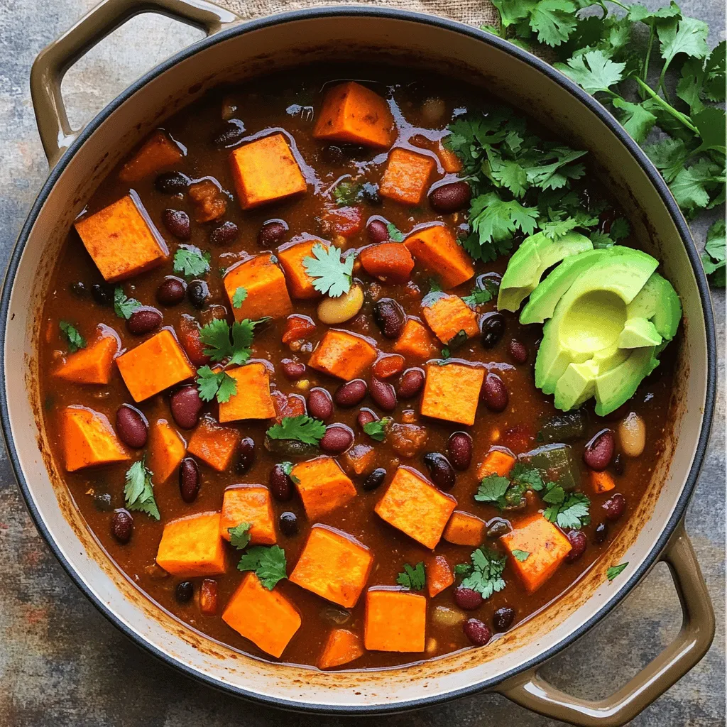 - 2 medium sweet potatoes, peeled and diced - 1 can (15 oz) black beans, drained and rinsed - 1 can (15 oz) kidney beans, drained and rinsed - 1 can (14.5 oz) diced tomatoes (with juice) - 1 medium onion, chopped - 3 cloves garlic, minced - 1 red bell pepper, diced - 1 jalapeño pepper, minced (optional for heat) - 2 cups vegetable broth - 1 tablespoon chili powder - 1 teaspoon cumin - 1 teaspoon smoked paprika - Salt and pepper to taste - 2 tablespoons olive oil - Fresh cilantro, for garnish (optional) - Avocado slices, for serving (optional) Each ingredient plays a key role in flavor and nutrition. Sweet potatoes add natural sweetness and fiber. They provide vitamins A and C, which support your immune system. Black beans and kidney beans bring protein and iron, important for energy and muscle health. Diced tomatoes add juiciness and help balance flavors while offering antioxidants. For those with allergies, you can substitute the beans with lentils or chickpeas. You can also use zucchini instead of sweet potatoes if you prefer. For a nut-free option, ensure your vegetable broth is free from nuts. In this chili, each ingredient contributes to a hearty, filling dish. You get protein, fiber, and essential vitamins. It’s a great choice for a healthy meal that warms you up inside. To dive deeper into the cooking process, check the Full Recipe. 1. Start by heating 2 tablespoons of olive oil in a large pot over medium heat. 2. Add 1 medium chopped onion and sauté it for 3-4 minutes. This helps the onion soften and release its flavor. 3. Next, add 3 cloves of minced garlic, 1 diced red bell pepper, and 1 minced jalapeño pepper if you want some heat. Cook these for another 2-3 minutes until the peppers become tender. 4. Now, stir in 2 medium diced sweet potatoes along with 1 tablespoon of chili powder, 1 teaspoon of cumin, and 1 teaspoon of smoked paprika. Add salt and pepper to taste. Cook for another 3-4 minutes to let the spices toast and coat the vegetables. 5. Pour in 1 can of diced tomatoes (with juice), 1 can of drained black beans, and 1 can of drained kidney beans. Add 2 cups of vegetable broth and mix everything well. 6. Bring the chili to a boil. Then reduce the heat to low. Cover the pot and let it simmer for about 25-30 minutes, or until the sweet potatoes are tender. 7. Taste the chili. Adjust the seasoning by adding more salt, pepper, or spices as needed. If you want a thicker chili, mash some sweet potatoes against the pot's side and stir. 8. Serve the chili hot. Top it with fresh cilantro and avocado slices if you like. - To adjust the consistency, you can add more vegetable broth to make it thinner or mash some sweet potatoes to make it thicker. - For best seasoning, always taste your dish as you cook. This way, you can balance the flavors just right. - Prep time is about 15 minutes, and total cook time is 45 minutes. - For meal prep efficiency, chop your veggies ahead of time. This way, you can quickly throw everything together when you're ready to cook. Try this Vegan Sweet Potato Chili recipe for a hearty meal! You can find the Full Recipe for more details. Adjusting spice levels To make your chili just right, taste it as you cook. If you like heat, add more jalapeño or chili powder. For a milder flavor, skip the jalapeño or cut back on spices. You can also add a bit of sugar to balance out the heat. Making it ahead of time Chili often tastes better the next day. It lets the flavors blend well. Make your chili a day ahead and store it in the fridge. Reheat it on the stovetop or in the microwave. If it thickens too much, stir in a bit of vegetable broth. Best accompaniments for Vegan Sweet Potato Chili Serve your chili with fresh bread or cornbread. A dollop of vegan sour cream adds creaminess. You can also top it with avocado slices and fresh cilantro. A side salad pairs well for a refreshing touch. Ideal serving size This recipe serves about 4-6 people. For a filling meal, plan for 1.5 to 2 cups per person. If you have leftovers, they keep well, and you can enjoy them later. Nutritional analysis of the recipe This chili is packed with fiber and protein. Sweet potatoes are rich in vitamins A and C. Beans provide protein and keep you full longer. Together, they make a balanced meal that’s great for your health. Benefits of sweet potatoes and beans in the diet Sweet potatoes are low in calories and high in nutrients. They help support eye health and boost your immune system. Beans are heart-healthy and can lower cholesterol. Together, they make this chili not just tasty but healthy, too. For more details, check out the Full Recipe. {{image_2}} You can easily change up the vegetables. Try adding zucchini, carrots, or corn. These add color and flavor. For protein, chickpeas or lentils work well too. They boost nutrition and make the chili heartier. Spices can change the game. Add a pinch of cayenne for heat or smoked paprika for depth. You could also try a dash of oregano or thyme for a fresh taste. Toppings make chili fun. Try sour cream, shredded cheese, or fresh lime juice. They add a nice zing. If you want to save time, use a slow cooker. Just follow the same steps, but cook on low for 6-8 hours. For a quick meal, the Instant Pot is a great choice. Cook the chili on high pressure for about 10 minutes, then let it naturally release. This keeps all the flavors intact. For the full recipe, check out the detailed steps above. To store leftovers safely, let the chili cool first. Then, place it in an airtight container. This keeps moisture in and bacteria out. I recommend using glass containers. They are safe for both fridge and freezer. You can also use freezer bags. Just remember to remove as much air as possible. You can reheat chili in the microwave or on the stovetop. Microwaving is quick but can sometimes change the texture. Stir the chili halfway through to heat it evenly. Stovetop reheating is better for maintaining flavor. Heat it on low and stir often. This keep