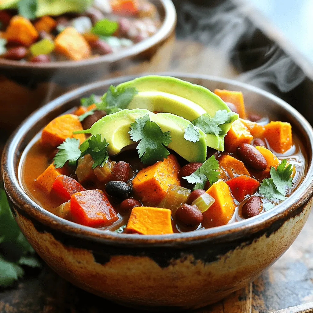 ![To make this vegan sweet potato chili, you need these tasty items: - 2 medium sweet potatoes, peeled and diced - 1 can (15 oz) black beans, rinsed and drained - 1 can (15 oz) kidney beans, rinsed and drained - 1 can (14.5 oz) diced tomatoes (with juices) - 1 medium red onion, chopped - 2 cloves garlic, minced - 1 red bell pepper, chopped - 1 yellow bell pepper, chopped - 2 cups vegetable broth - 1 tablespoon olive oil - 2 tablespoons chili powder - 1 teaspoon cumin - 1 teaspoon smoked paprika - Salt and pepper to taste - Fresh cilantro, chopped (for garnish) - Avocado slices (for serving) You can switch some ingredients if you want. Here are some ideas: - Use white or orange potatoes instead of sweet potatoes. - Canned chickpeas work well instead of black or kidney beans. - For the broth, you can use water or any veggie stock you have. - If you don't have fresh cilantro, try parsley or green onions. - For a spicy kick, add jalapeños or hot sauce. Sweet potatoes are not just tasty; they are also healthy! Here’s why: - Rich in vitamins A and C, they boost your immune system. - They have fiber, which helps with digestion. - Sweet potatoes provide energy with their natural sugars. - They are low in fat, making them heart-healthy. - The bright color shows they are full of antioxidants. These benefits make sweet potatoes a great choice for your chili. You can enjoy a warm bowl of this vegan sweet potato chili while knowing you are eating healthy. For the full recipe, check the details above. To make this vegan sweet potato chili, you need to prep your ingredients. Start by peeling and dicing the sweet potatoes into small cubes. This helps them cook evenly. Next, chop the red onion, red bell pepper, and yellow bell pepper. Mince the garlic cloves as well. Rinsing and draining the black beans and kidney beans is also essential to remove excess sodium. First, heat olive oil in a large pot over medium heat. Add the chopped red onion and cook for about five minutes. You want them soft and a bit see-through. Then, mix in the minced garlic and cook for one more minute. Add the diced sweet potatoes and both bell peppers next. Toss in the chili powder, cumin, smoked paprika, salt, and pepper. Stir everything well and cook for five minutes. Now, pour in the vegetable broth and add the diced tomatoes with their juices. Stir to combine and bring the mix to a boil. Once it boils, reduce the heat to low. Cover the pot and let it simmer for 25 to 30 minutes. Check if the sweet potatoes are tender. After that, stir in the black beans and kidney beans, letting them heat for about five minutes. You can adjust the seasoning to your taste. Sometimes, sweet potatoes can take longer to cook. If they seem hard, let the chili simmer a bit longer. If you find the chili too thick, just add more vegetable broth. For a spicier kick, add extra chili powder or some hot sauce. If it's too spicy, balance it with a little more sweet potato or add a splash of coconut milk for creaminess. The full recipe is easy to follow and helps you create a delicious meal. To make your chili thick and hearty, use the right sweet potatoes. Pick firm ones that are heavy for their size. When you chop them, make uniform pieces. This helps them cook evenly. You can also mash a small portion of the sweet potatoes once they are cooked. This adds creaminess to the dish without losing texture. If you prefer a thinner chili, add extra vegetable broth. To boost the flavor, think beyond basic spices. Try adding a pinch of cinnamon or a splash of lime juice. These can brighten the taste. If you love depth, smoked paprika works wonders. It gives a rich, smoky flavor that pairs well with the sweet potatoes. Fresh herbs, like cilantro, add freshness. Stir them in at the end for the best taste. If you like your chili spicy, add more chili powder or diced jalapeños. You can also use cayenne pepper for a kick. Start with a little and taste as you go. If it gets too hot, balance it with a bit of maple syrup or agave. These sweeteners can tone down the heat well. Remember, you can always add more spice, but it’s hard to take it out. Enjoy the journey of finding your perfect heat level! {{image_2}} You can boost the nutrition and flavor of your Vegan Sweet Potato Chili by adding more veggies. Here are some great options: - Carrots: Diced carrots add sweetness and a nice crunch. - Zucchini: This veggie cooks fast and adds moisture. - Corn: Sweet corn brings a pop of color and flavor. - Spinach or Kale: Leafy greens add vitamins and minerals. Feel free to mix and match based on what you have. Just chop them up and toss them in during the cooking stage. Both black beans and kidney beans work well in chili. - Black beans: They are smooth and creamy, with a mild flavor. - Kidney beans: They are firmer and have a richer taste. You can even use both for a mix of textures. It adds depth to your dish and makes it more fun! This chili is already gluten-free but can be made low-carb with a few tweaks. - Skip the beans: You can replace them with diced zucchini or mushrooms. - Use cauliflower rice: Instead of serving with rice, try cauliflower rice. These changes keep the chili hearty while cutting down on carbs. Enjoy exploring these variations to make the dish fit your needs. Check out the Full Recipe for more ideas! To store leftover chili, let it cool first. Use an airtight container. Place the container in the fridge. Your chili will stay fresh for up to five days. Make sure to label the container with the date. This way, you will know when to eat it. You can freeze vegan chili to keep it longer. Use freezer-safe containers or bags. Leave some space at the top. The chili will expand as it freezes. It can last up to three months in the freezer. When ready to eat, take it out and thaw it in the fridge overnight. When you want to eat the chili, you can reheat it easily. For the stove, pour it into a pot. Heat on low and stir often until warm. If you use a microwave