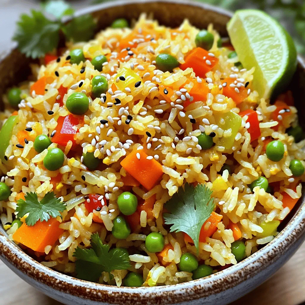 To make a tasty veggie fried rice, you need: - 2 cups cooked jasmine rice (day-old is best) - 1 tablespoon sesame oil - 1 cup mixed vegetables (carrots, peas, bell peppers, corn) - 1/2 cup green onions, sliced - 2 cloves garlic, minced - 1 teaspoon fresh ginger, grated - 2 tablespoons soy sauce - 1 tablespoon oyster sauce (use vegetarian option if needed) - 2 eggs, beaten (or silken tofu for vegan) - Salt and pepper to taste - Sesame seeds for garnish - Fresh cilantro for garnish You can change things up with these add-ins: - Chili paste for heat - Cooked chicken or shrimp for protein - Other veggies like broccoli or snap peas - Cashews or peanuts for crunch To cook your veggie fried rice, gather these tools: - A large skillet or wok - A spatula for stirring - A cutting board and knife for prepping ingredients - A measuring spoon for accurate measurements To make veggie fried rice, gather your ingredients first. I recommend using day-old jasmine rice. It cooks better and has less moisture. You need: - 2 cups cooked jasmine rice - 1 tablespoon sesame oil - 1 cup mixed vegetables (carrots, peas, bell peppers, and corn) - 1/2 cup green onions, sliced - 2 cloves garlic, minced - 1 teaspoon fresh ginger, grated - 2 tablespoons soy sauce - 1 tablespoon oyster sauce (or a vegetarian option) - 1 teaspoon chili paste (optional) - 2 eggs, beaten (or silken tofu for vegan) - Salt and pepper to taste - Sesame seeds for garnish - Fresh cilantro for garnish Chop your vegetables and slice the green onions. Mince the garlic and grate the ginger. Having everything ready speeds up cooking. Now, let’s cook! Start by heating a large skillet or wok over medium-high heat. Add sesame oil and let it warm. Once hot, add minced garlic and ginger. Stir quickly for about 30 seconds until you smell the aroma. Next, toss in your mixed vegetables. Stir-fry for about 3 to 4 minutes. You want them tender yet crisp. Push the veggies to one side of the skillet. Pour the beaten eggs or silken tofu on the other side. Scramble until fully cooked. Now, add the cooked rice, breaking up any clumps. Stir everything together. Pour in the soy sauce and oyster sauce. If you like heat, add chili paste too. Mix until the rice is coated. Season with salt and pepper. Stir-fry for another 2 to 3 minutes to heat through. Finally, toss in the sliced green onions and turn off the heat. - Use day-old rice. Fresh rice is too sticky. - Keep the heat high. This helps fry the rice well. - Stir-fry quickly. This keeps the veggies crisp. - Scramble eggs separately. This prevents overcooking. - Adjust sauces to taste. Experiment with flavors you like. Serve your veggie fried rice in bowls. Top with sesame seeds and fresh cilantro for a nice touch. Enjoy your meal! When making veggie fried rice, avoid using fresh rice. Day-old rice works best. Fresh rice is sticky and clumps together. It can lead to mushy fried rice. Also, don’t skip the sesame oil. It adds a lovely nutty flavor. Be careful not to overcook the veggies. They should be tender but still crisp. Use a large skillet or wok for cooking. This allows even heat distribution. Start with high heat to achieve that nice stir-fry effect. Always heat the oil before adding ingredients. This helps to lock in flavors. Push the veggies to the side before adding eggs. This method ensures even cooking and better texture. To boost the flavor, try adding a splash of lime juice. This adds brightness to the dish. You can also use fresh herbs like cilantro for extra taste. If you want heat, add chili paste or fresh chilies. Experiment with different sauces like hoisin or teriyaki for variety. Using a mix of vegetables also adds different textures and tastes. {{image_2}} You can easily make veggie fried rice vegan. Just swap the eggs for silken tofu. Tofu gives a nice texture and keeps it light. Use vegetarian oyster sauce for added flavor. This option keeps it delicious without any animal products. Mix and match your favorite veggies in this dish. Try broccoli, zucchini, or snap peas. You can also use frozen mixed vegetables if you are short on time. The key is to keep the veggies bright and crispy. It adds color and nutrition to your meal. Want some heat? Add chili paste to your oil when you cook. Start with a small amount. You can always add more if you like it spicy. For a milder dish, skip the chili paste altogether. It’s all about your taste preferences! Store your veggie fried rice in an airtight container. Let it cool to room temperature first. It will last up to four days in the fridge. To keep it fresh, make sure the lid seals well. This keeps out moisture and air. If you notice any off smells or changes in color, toss it out. To freeze veggie fried rice, pack it in freezer-safe bags or containers. Remove as much air as possible before sealing. It can stay frozen for up to three months. Label your containers with the date. This way, you won’t forget what’s inside. Thaw it in the fridge overnight before reheating. When you’re ready to eat, reheat the rice in a skillet. Add a splash of water or oil to prevent sticking. Heat it over medium heat for about 5-7 minutes. Stir it often to help it warm evenly. You can also use a microwave. Heat it in short bursts of one minute, stirring in between. This keeps the rice moist and tasty. Yes, using leftover rice makes this dish even better. Day-old rice dries out a bit. This helps keep the rice grains separate. When you stir-fry, they won’t turn mushy. If you don’t have day-old rice, cook fresh rice and let it cool. Spread it on a tray for about 30 minutes. This will help it dry out a little. To spice up your fried rice, add chili paste. You can mix in one teaspoon or more, based on your taste. You can also use fresh chopped chilies. Add them when you cook the garlic and ginger. This way, they will blend nicely into the dish. Another option is to serve with hot sauce on the side. You can switch up the flavors by using different sauces. Instead o