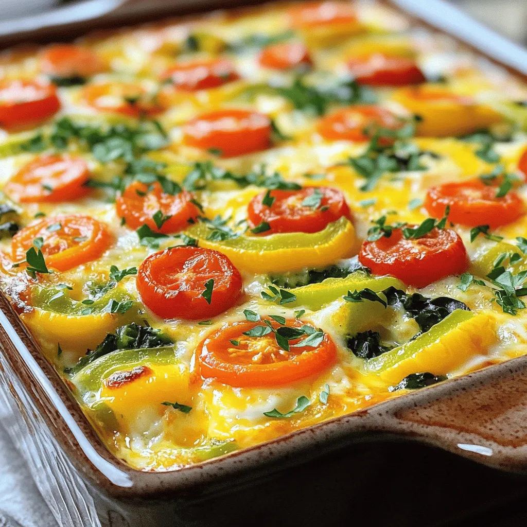 To make the Veggie Loaded Breakfast Casserole, you will need: - 6 large eggs - 1 cup milk (or plant-based milk) - 2 cups spinach, roughly chopped - 1 cup bell peppers (red and green), diced - 1 cup mushrooms, sliced - 1 medium zucchini, grated - 1 cup cherry tomatoes, halved - 1 medium onion, chopped - 1 teaspoon garlic powder - 1 teaspoon dried oregano - Salt and pepper to taste - 1 cup shredded cheese (cheddar or mozzarella) - 1 tablespoon olive oil You can swap ingredients based on what you have or like. If you don’t have spinach, try kale or Swiss chard. For bell peppers, use any color you like, or even skip them. If you're not a fan of mushrooms, leave them out or use diced eggplant. You can also choose any cheese you prefer, like feta or goat cheese. For a vegan option, replace eggs with tofu and cheese with a dairy-free kind. When choosing vegetables, look for bright colors and firm textures. Check for any soft spots or blemishes, as these can indicate spoilage. For leafy greens, pick those that are crisp and vibrant. Zucchini should feel heavy for its size and have smooth skin. As for bell peppers, they should feel firm and have shiny skin. Fresh cherry tomatoes should be plump and fragrant. These tips will help you create a tasty and healthy casserole. Start by gathering all your ingredients. You will need eggs, milk, and lots of veggies. Here’s what to prepare: - 6 large eggs - 1 cup milk (or plant-based milk) - 2 cups spinach, roughly chopped - 1 cup bell peppers, diced (use red and green) - 1 cup mushrooms, sliced - 1 medium zucchini, grated - 1 cup cherry tomatoes, halved - 1 medium onion, chopped - 1 teaspoon garlic powder - 1 teaspoon dried oregano - Salt and pepper to taste - 1 cup shredded cheese (cheddar or mozzarella) - 1 tablespoon olive oil Grease your baking dish with olive oil. It helps the casserole not stick. Heat a large skillet over medium heat. Add the chopped onion and cook for about 2-3 minutes. You want them soft. Next, add the diced bell peppers and sliced mushrooms. Cook these for another 4-5 minutes. The veggies should be tender. Stir in the chopped spinach and grated zucchini. Cook until the spinach wilts, which takes about 2 minutes. Season the mixture with garlic powder, oregano, salt, and pepper. Turn off the heat once everything is cooked. In a large bowl, whisk the eggs and milk together. Add a pinch of salt and pepper. Now, gently fold in your sautéed veggies. Next, add the halved cherry tomatoes and half of the cheese. Mix everything well. Pour this veggie and egg mixture into your prepared baking dish. Top it with the remaining cheese. Now you are ready to bake! Follow the full recipe for the baking time and enjoy your healthy start today. You can make this casserole your own. Try using different veggies! Broccoli, kale, or carrots work great. Want more flavor? Add some spices like cumin or paprika. You can also swap cheese types. Feta or goat cheese adds a nice twist. For a hearty meal, mix in cooked sausage or bacon. Don't be afraid to experiment. Your taste buds will thank you! Use a 9x13 inch baking dish for the best results. Glass or ceramic dishes help cook evenly. A good whisk is key for mixing eggs smoothly. A sturdy spatula helps to fold in the veggies. If you have one, a food processor can chop veggies quickly. These tools make your cooking more fun and easy! To get a fluffy texture, whisk the eggs well. Make sure to blend in the milk fully. Don't overcook the casserole; it should be set but moist. If you want a crunchy top, broil for a minute at the end. Let it cool for a few minutes before cutting. This helps it hold its shape better. For the complete details, check out the Full Recipe! {{image_2}} You can mix and match your veggies in this breakfast casserole. Try broccoli, kale, or carrots for a new taste. Sweet potatoes add a sweet note and great texture. Think about using seasonal veggies, too. Fresh, local produce can make your dish shine. Just chop them up and toss them in! Adding protein boosts your meal. Cooked sausage or bacon gives a hearty flavor. You can also add tofu for a plant-based option. Crumbled feta cheese or cottage cheese adds creaminess and protein. Mix in cooked chicken for a filling dish. The choice is yours! Need a dairy-free option? Use plant-based milk and skip the cheese or try vegan cheese. For a gluten-free meal, ensure your ingredients are gluten-free. Quinoa can replace bread for a unique twist. These swaps keep your casserole delicious for everyone! Check out the Full Recipe to get started on your veggie loaded breakfast casserole today! To keep your veggie loaded breakfast casserole fresh, store it in an airtight container. Place leftovers in the fridge within two hours of cooking. This helps prevent bacteria growth. Make sure to consume the leftovers within three to four days for the best taste and safety. When you're ready to eat, preheat your oven to 350°F (175°C). Place your casserole in an oven-safe dish. Cover it with foil to keep it moist. Heat for about 20-25 minutes, or until warm. You can also microwave individual pieces for 1-2 minutes. Just check that it’s hot all the way through. If you want to save some for later, freezing is a great option. Slice the casserole into portions. Wrap each piece tightly in plastic wrap, then place them in a freezer bag. Make sure to label the bag with the date. You can freeze it for up to three months. When you’re ready to enjoy it, let it thaw in the fridge overnight before reheating. This keeps the flavors intact and makes it easy to enjoy your delicious meal! For the full recipe, check out the details above. You can prepare this casserole the night before. Just follow the recipe steps up to pouring the mixture into the baking dish. Cover it tightly with plastic wrap and place it in the fridge. In the morning, simply remove the wrap and bake it straight from the fridge. This saves time and makes your morning easy. Yes, frozen vegetables work g