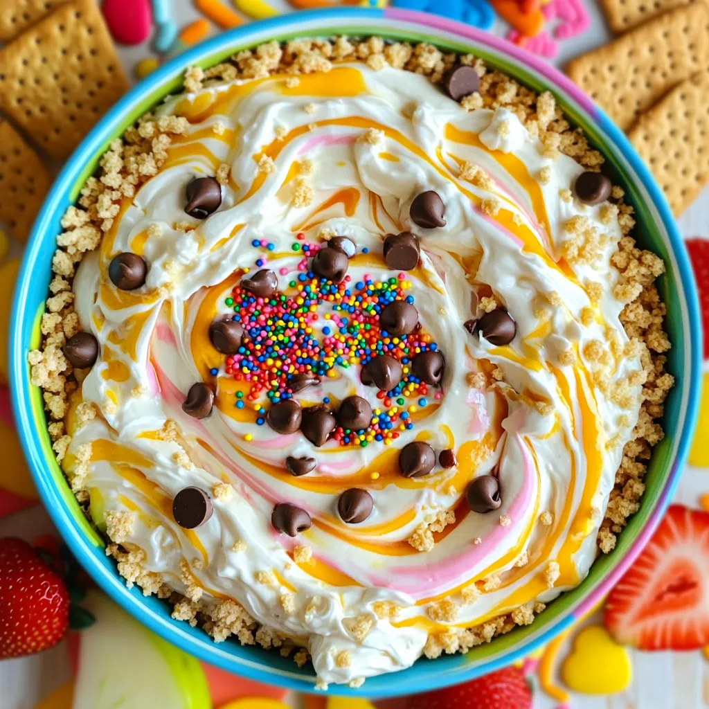 Serving this dip at parties is a big hit! Use a nice bowl to make it look fun. You can add extra sprinkles on top for a colorful touch. Serve it with graham crackers, fruits, or cookies. I love using apple slices and strawberries. They add a fresh taste. Set out a few different dippers. This way, guests can choose what they like best. Remember, the more colors on the table, the better! This makes the snack look fun and inviting.